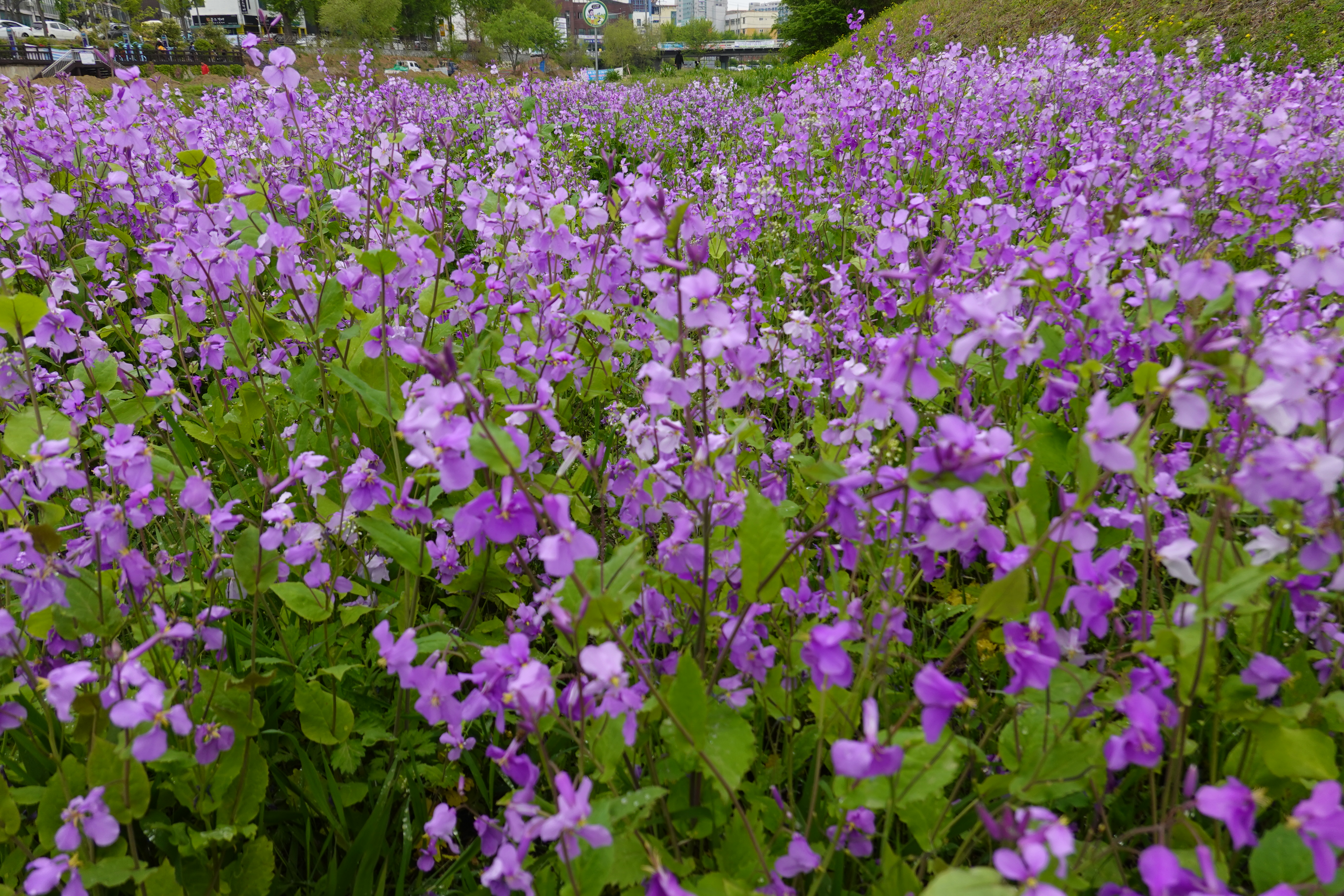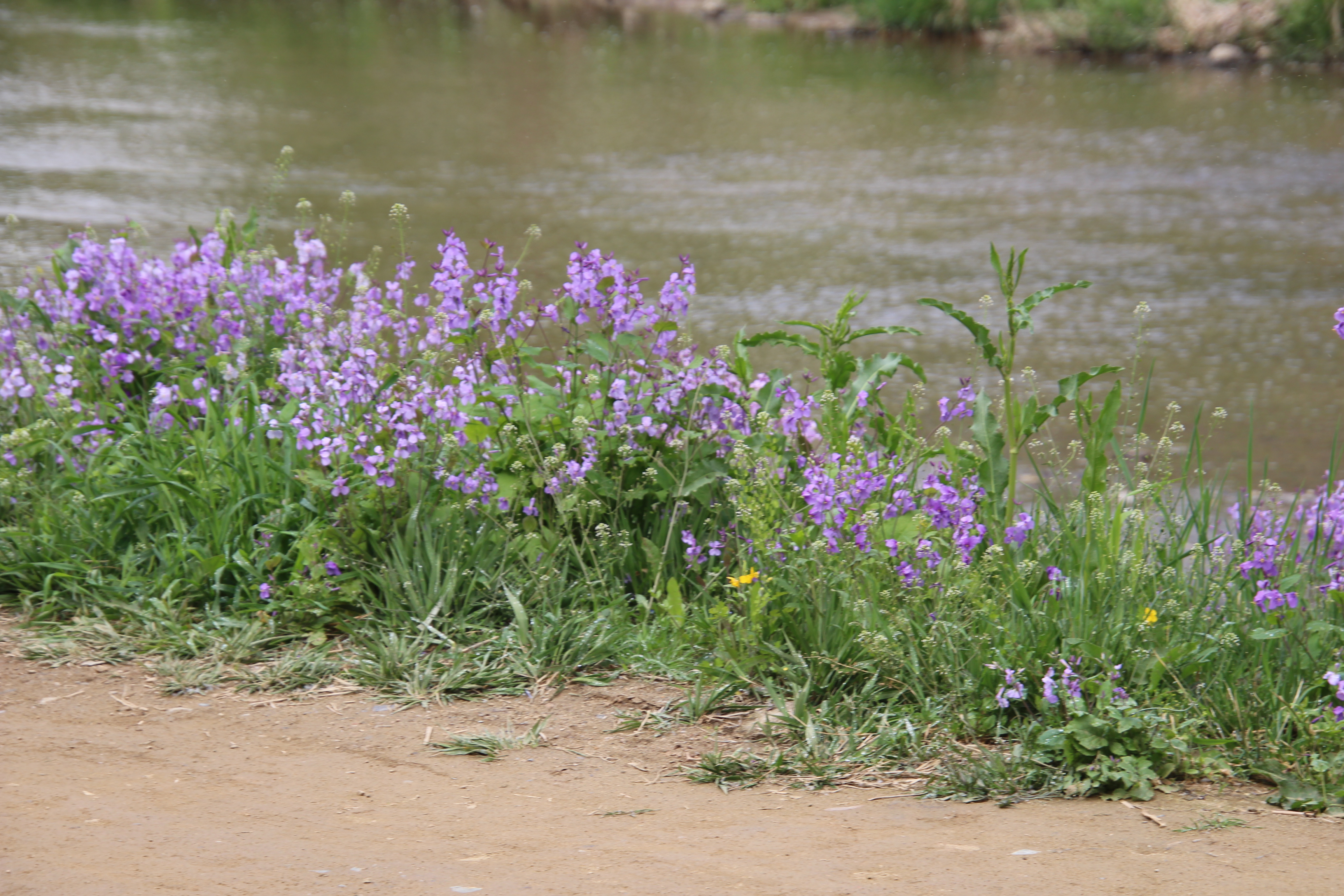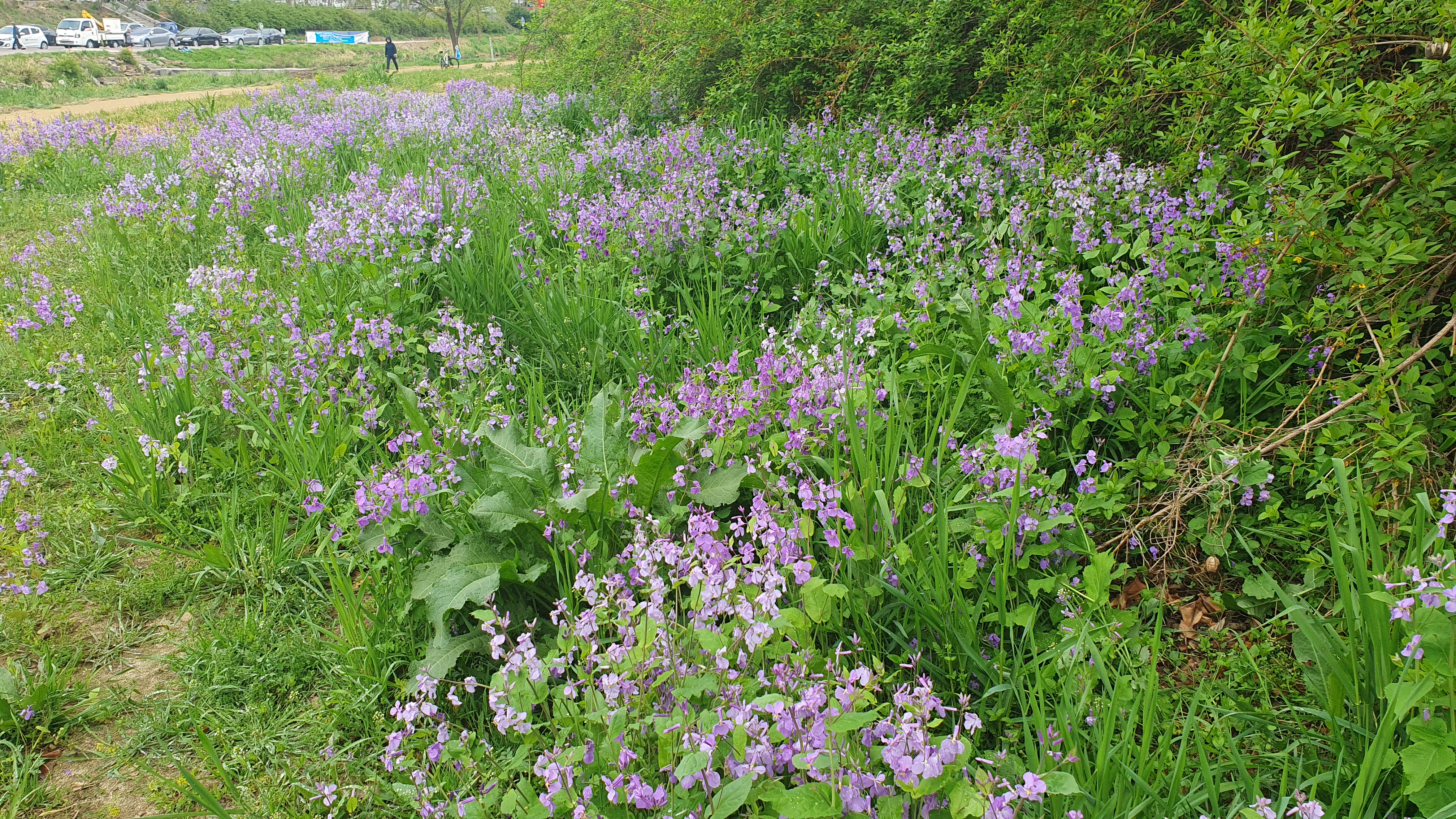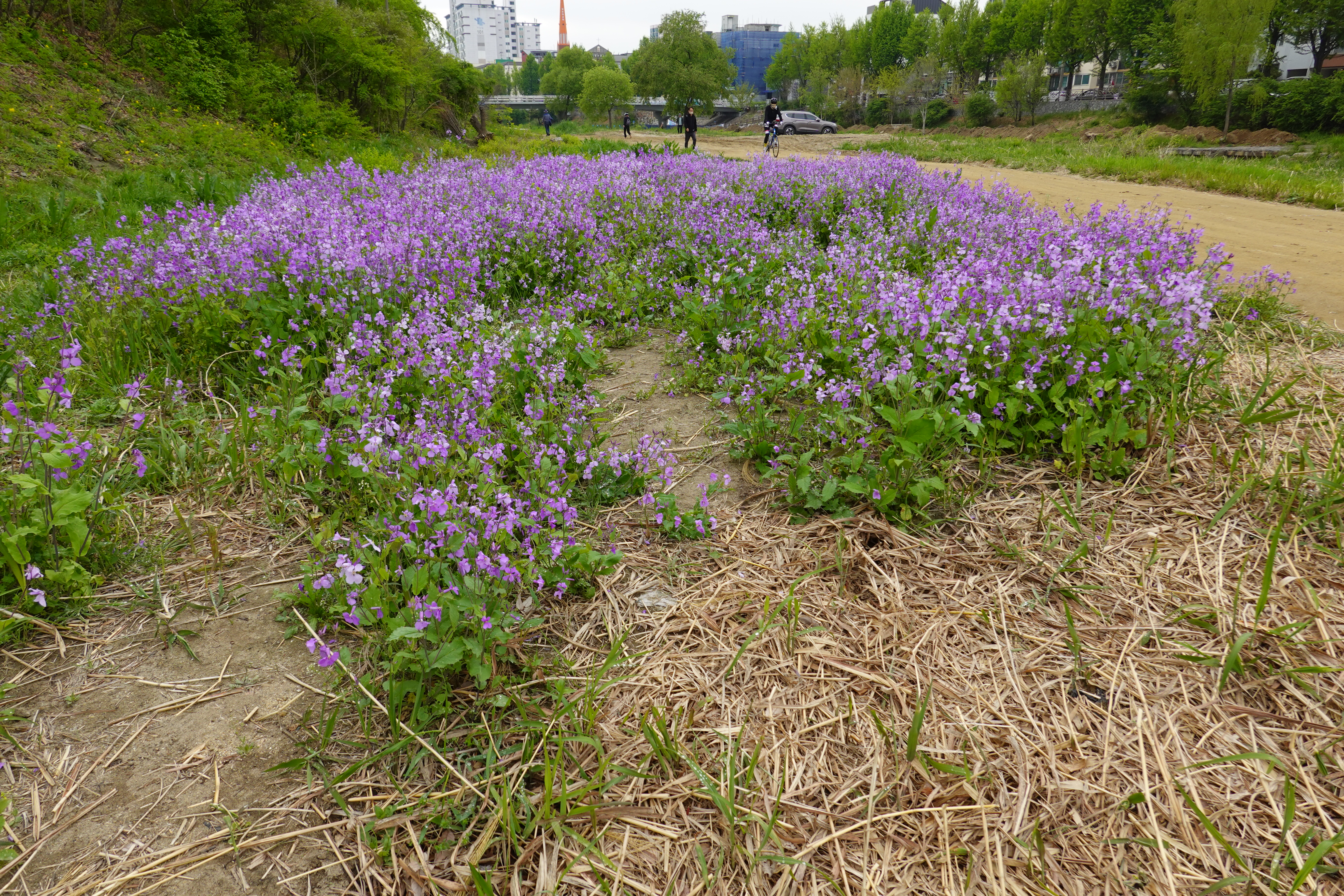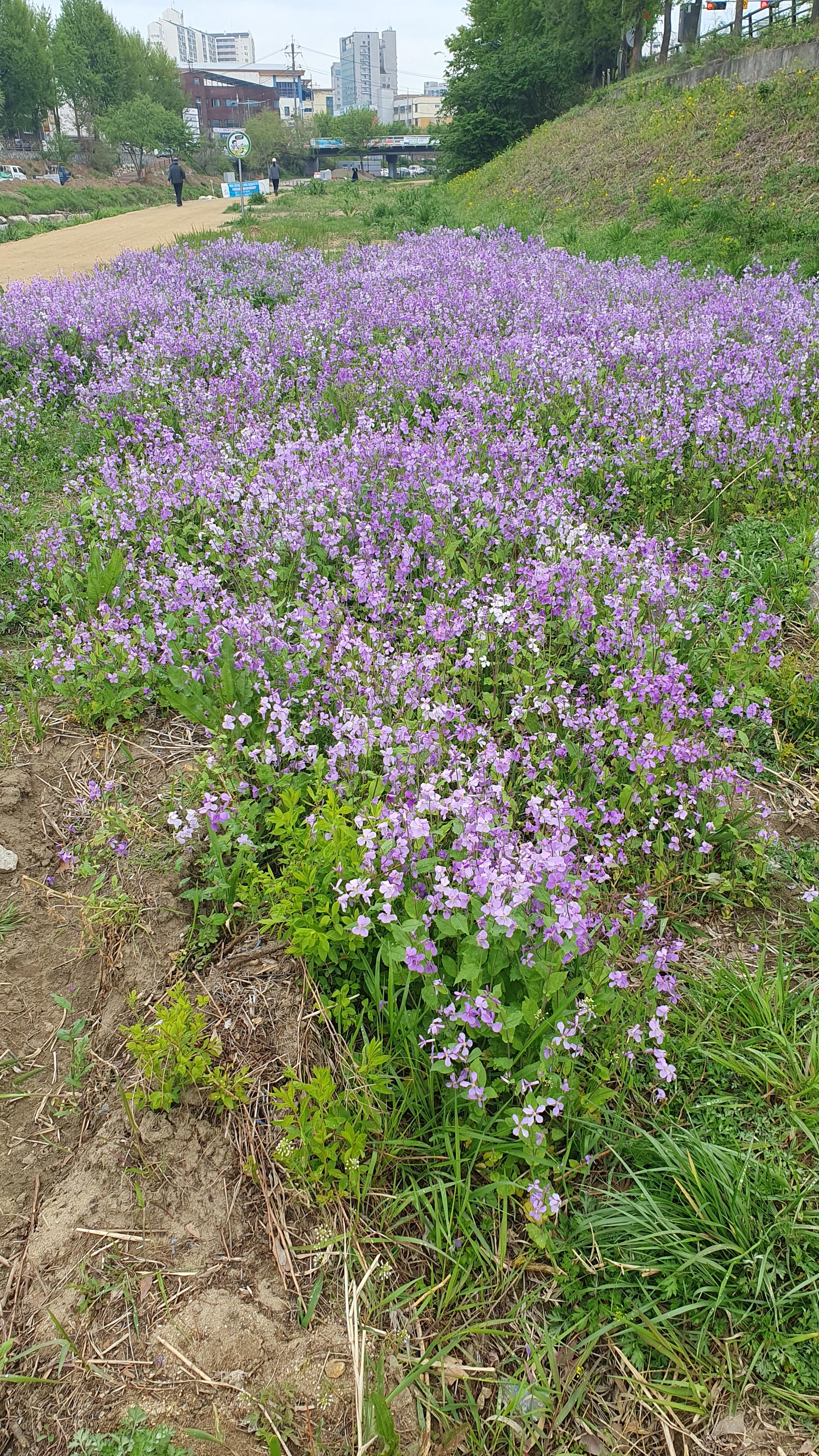 2023.04.18/ #돟시기록 #소래풀 #보라유채꽃 #학의천/ 소래풀 이미 학의천 중류까지 퍼지다. 안양천변에 피어나기 시작한 소래풀(보라유채꽃)이 이제는 안양천 곳곳에서 군락지를 이루고 있다. 점차 지천으로 확산되는 추세속에 지난 16일 학의천을 조사한 결과 학운교부터 대한교 구간에 간간히 한두 포기의 소래풀을 발견한데 이어 18일 상류쪽을 확인한 결과 관양교 주변 흙길 산책로에서 대규모 군락지 를 발견했다. 인덕원인도교 아래에서도 소래풀이 보인다. 산책길을 오가는 주민들이 군락지안에서 사진을 찍다보니 포토존이 자연스럽게 만들어지기도 한다. 몇년전부터 안양시와 하천 관내 동 주민들이 식물과 화초를 심어 인공꽃밭을 만드는데 굳이 그렇게 할 필요가 없을것 같다. 시가 작년에 인덕원인도교 주변의 꼬리명주나비 산란 식물인 쥐방울덩굴 나무들을 베어내고 수쿠렁과 물억새 등을 심었으나 꽃밭은 초토화되고 자연의 힘으로 다시 풀이 무성해졌다.