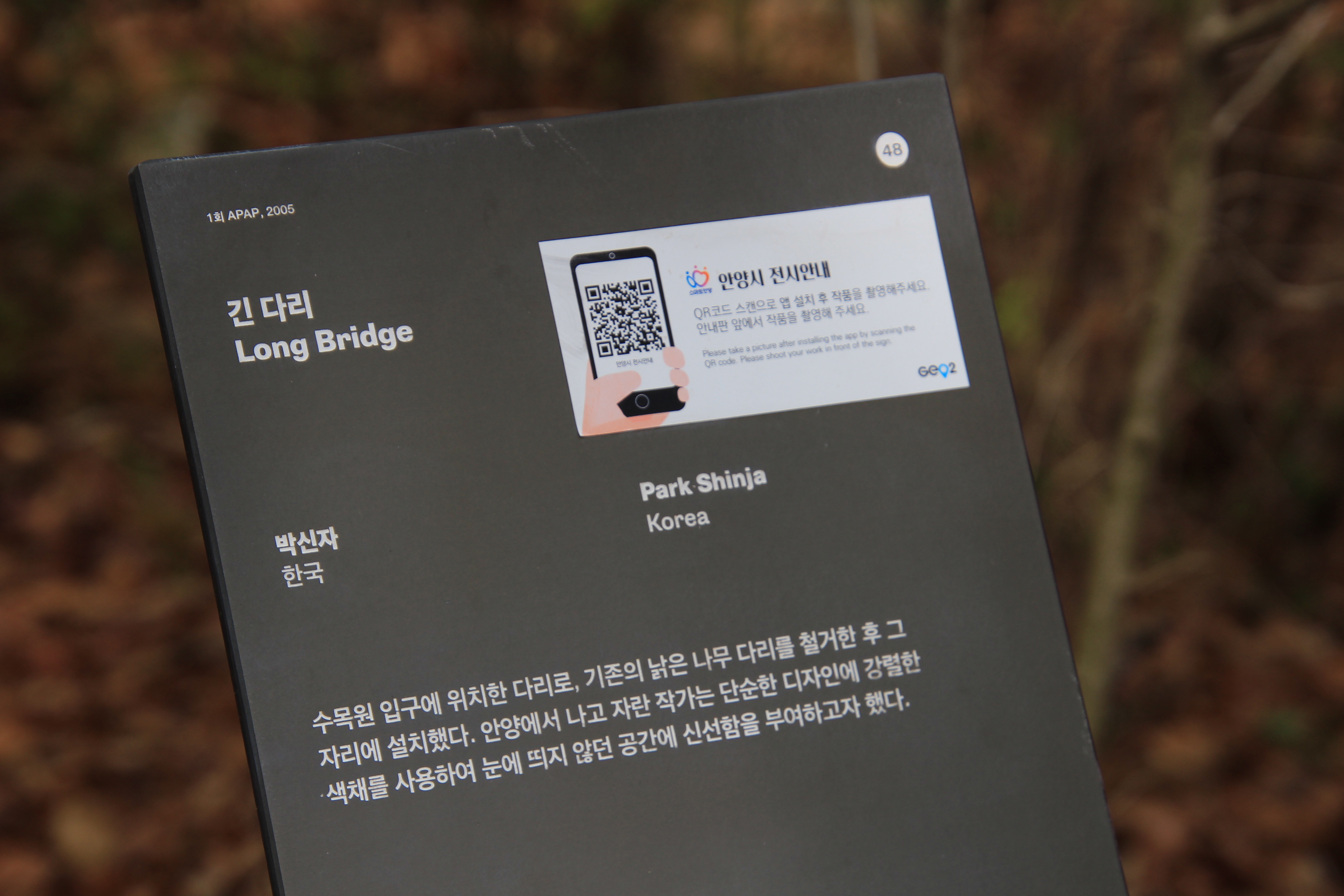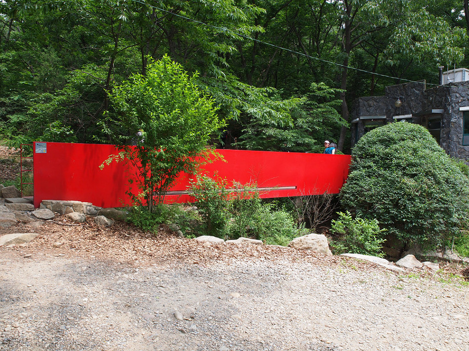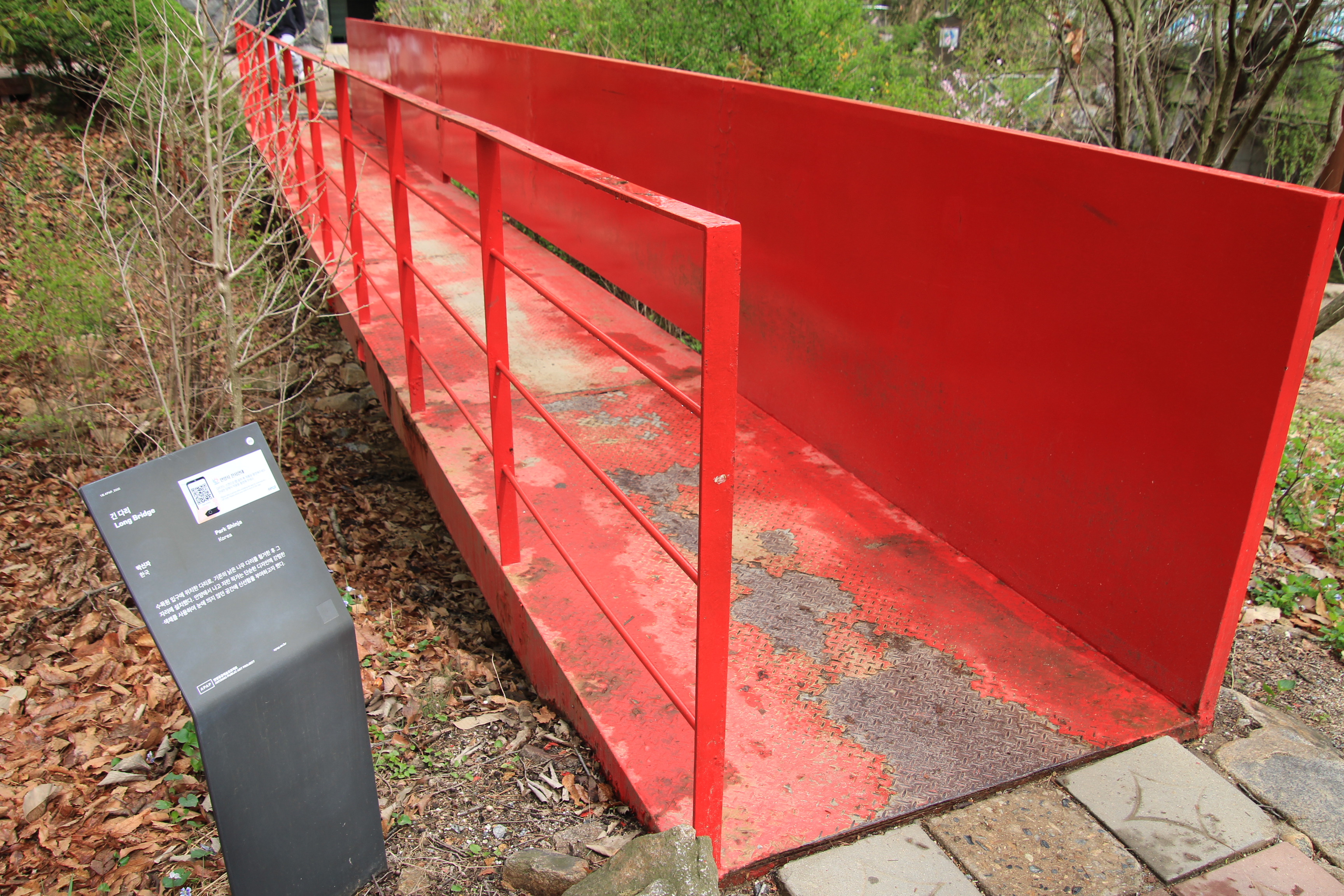 안양예술공원 작품 시리즈 마흔네 번째 작품으로 박신자 작가의 긴 다리로 나무 숲속에 보이는 빨간색이 아주 강렬하다. 관악수목원 입구에서 개울 건너편 화장실로 연결되는 이 작품의 길이는 대략 10m쯤 된다. 기존의 낡은 나무다리를 철거하고 그 자리에 설치했다.