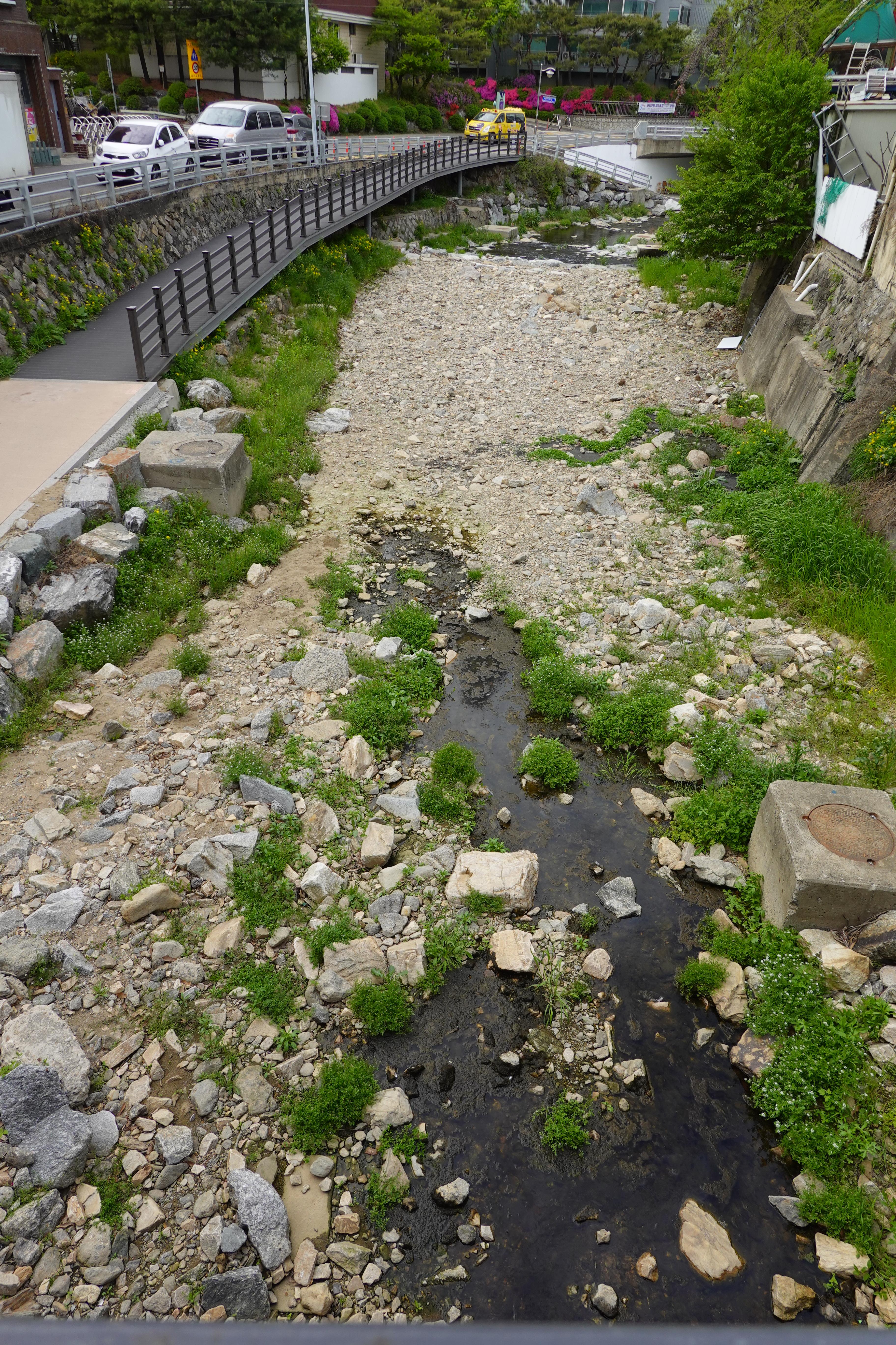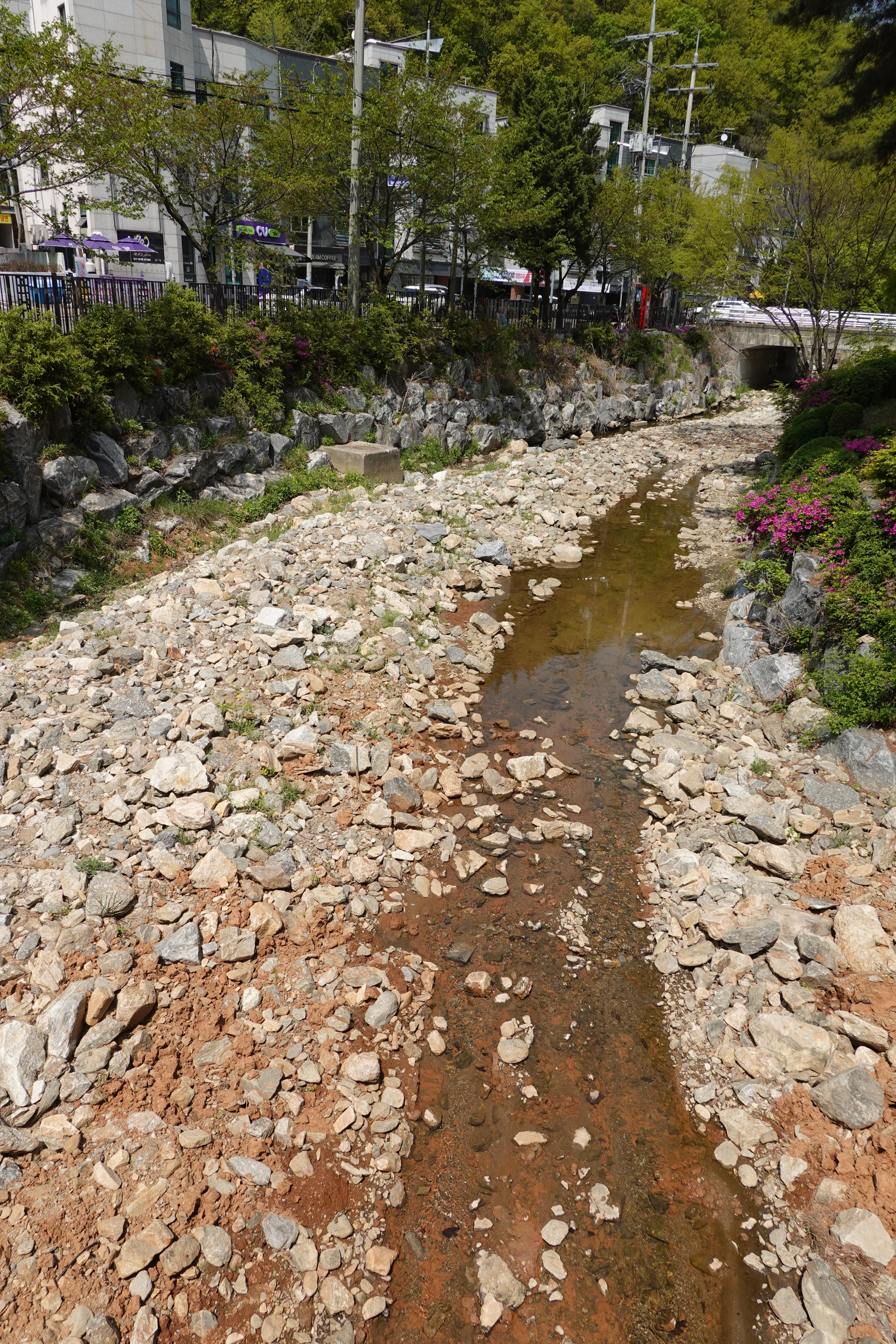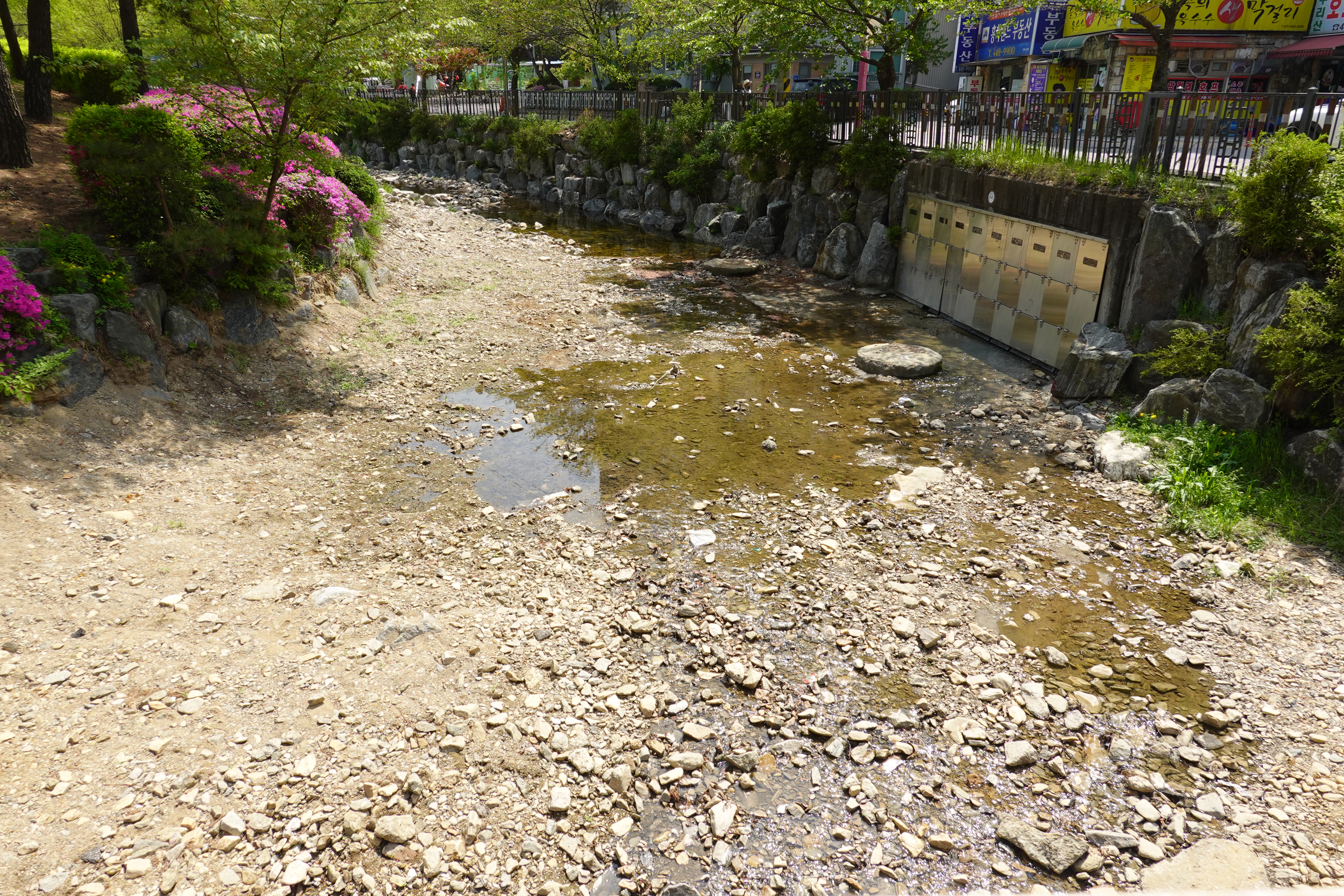 2023.04.21/ #도시기록 #수암천 #수리산 / 병목안과 담배촌의 풍경. 물이흐른다. 새마을교 아래는 물이 하천 바닥 암반으로 빠져버려 천 바닥에 물 흐름이 보이지 않는다. 서울 근교에서 가장 오래된 여성전용 수리산 한증막이 문을 닫았다.