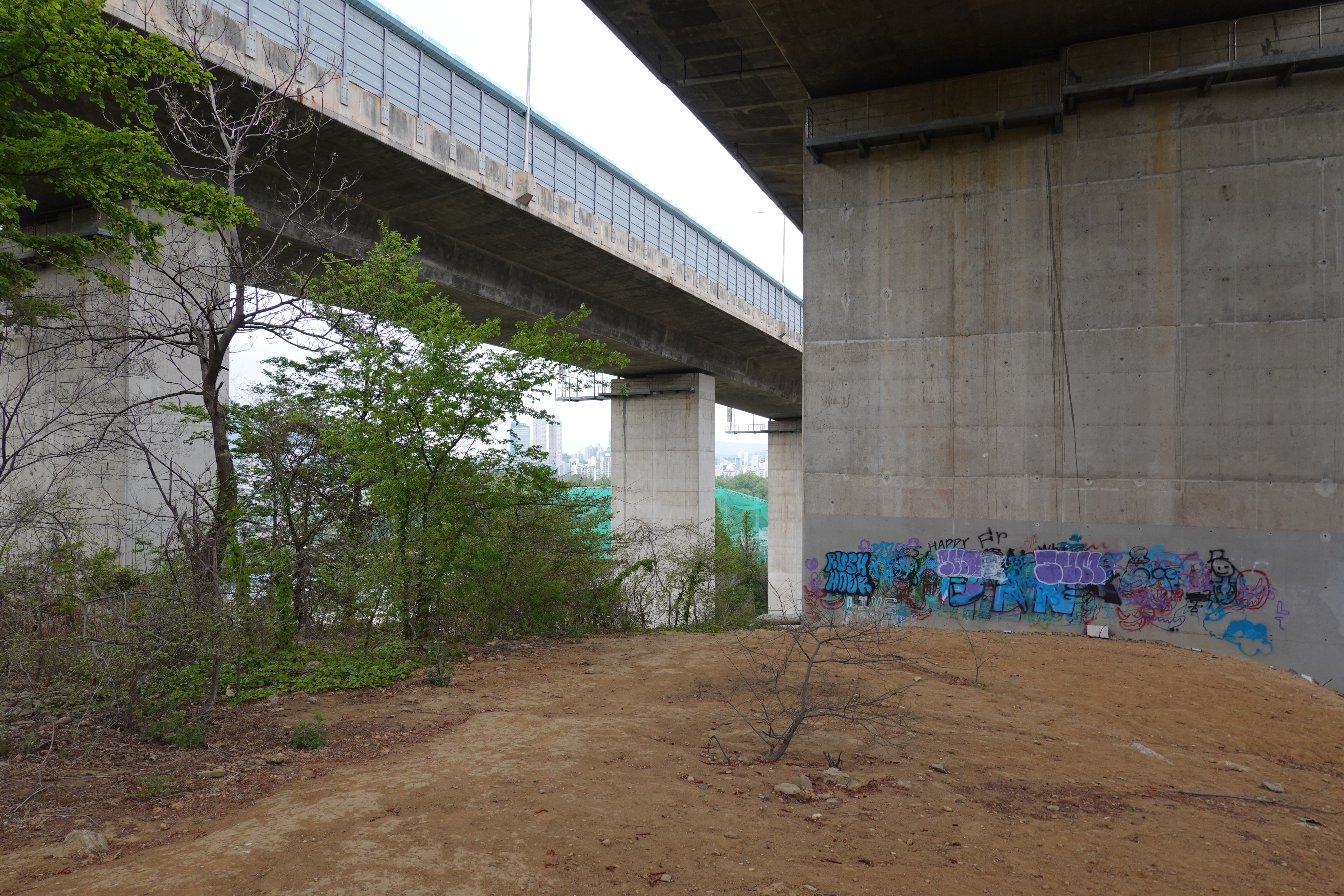 2023.04.25/ #도시기록 #안양87동 #수리산 #숲길/ 안양 메트로병원 장례식장 주차장에서 뒷산 산책로 숲길(그늘진 나무터널 같은 산책길이 음침한 느낄이 들 정도로 아주 고즈녁하다)을 거닐다. 음산한 숲길을 걸어 허접해 보이는 골안공원과 수도권외곽순환도로 교량 사이로 난 소로길을 지나면 관모초둥학교 옆길에 도착한다.