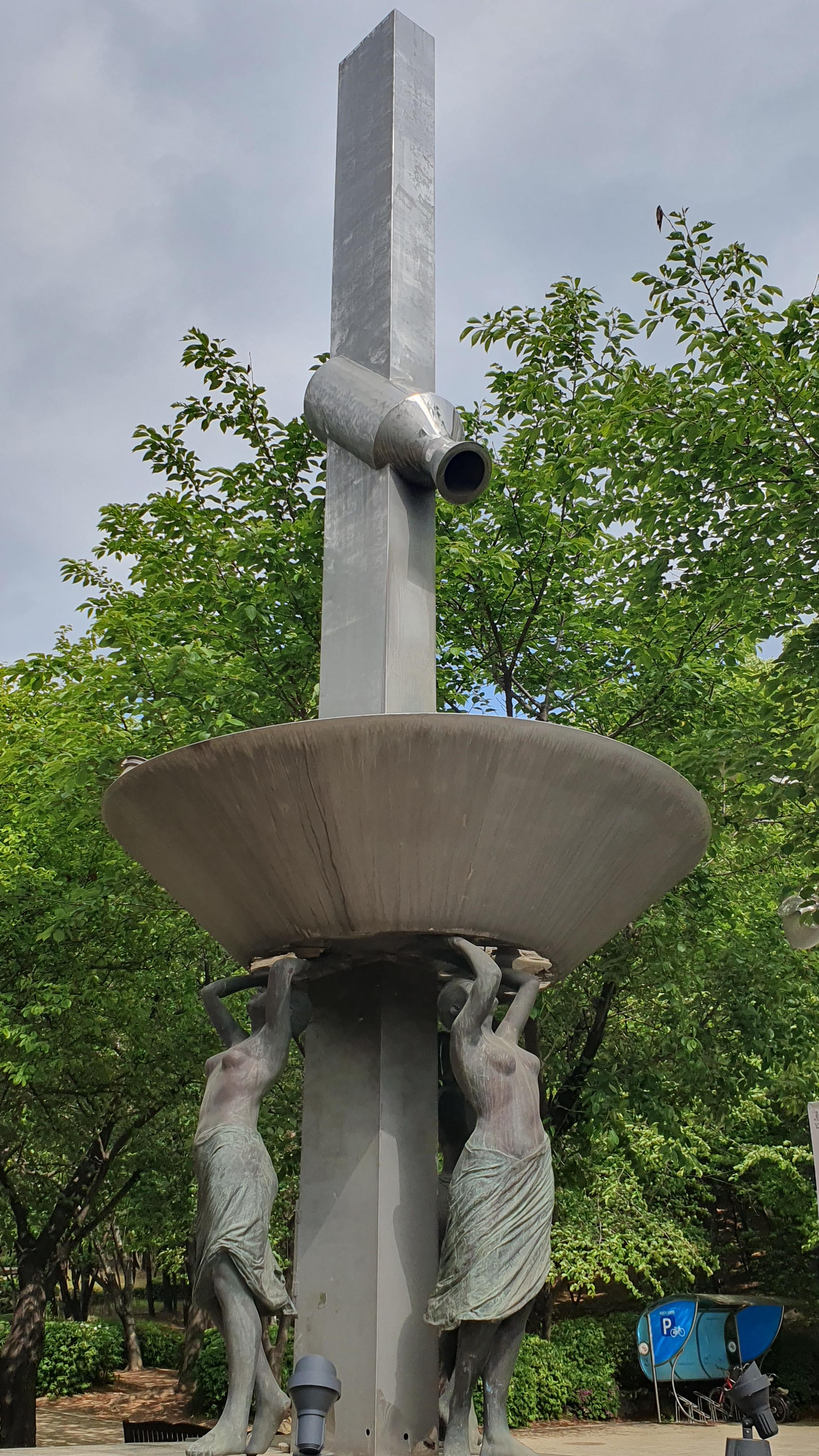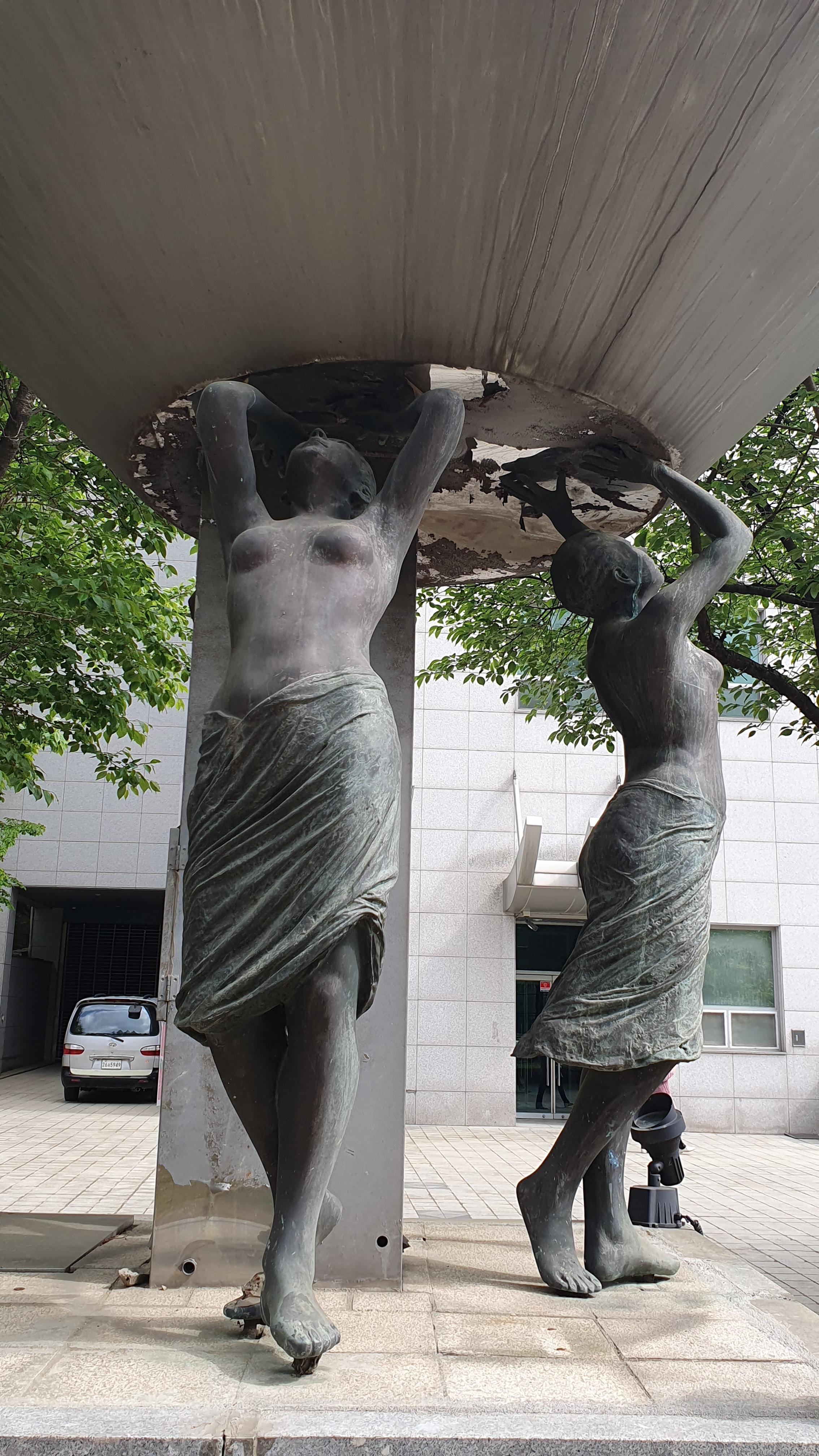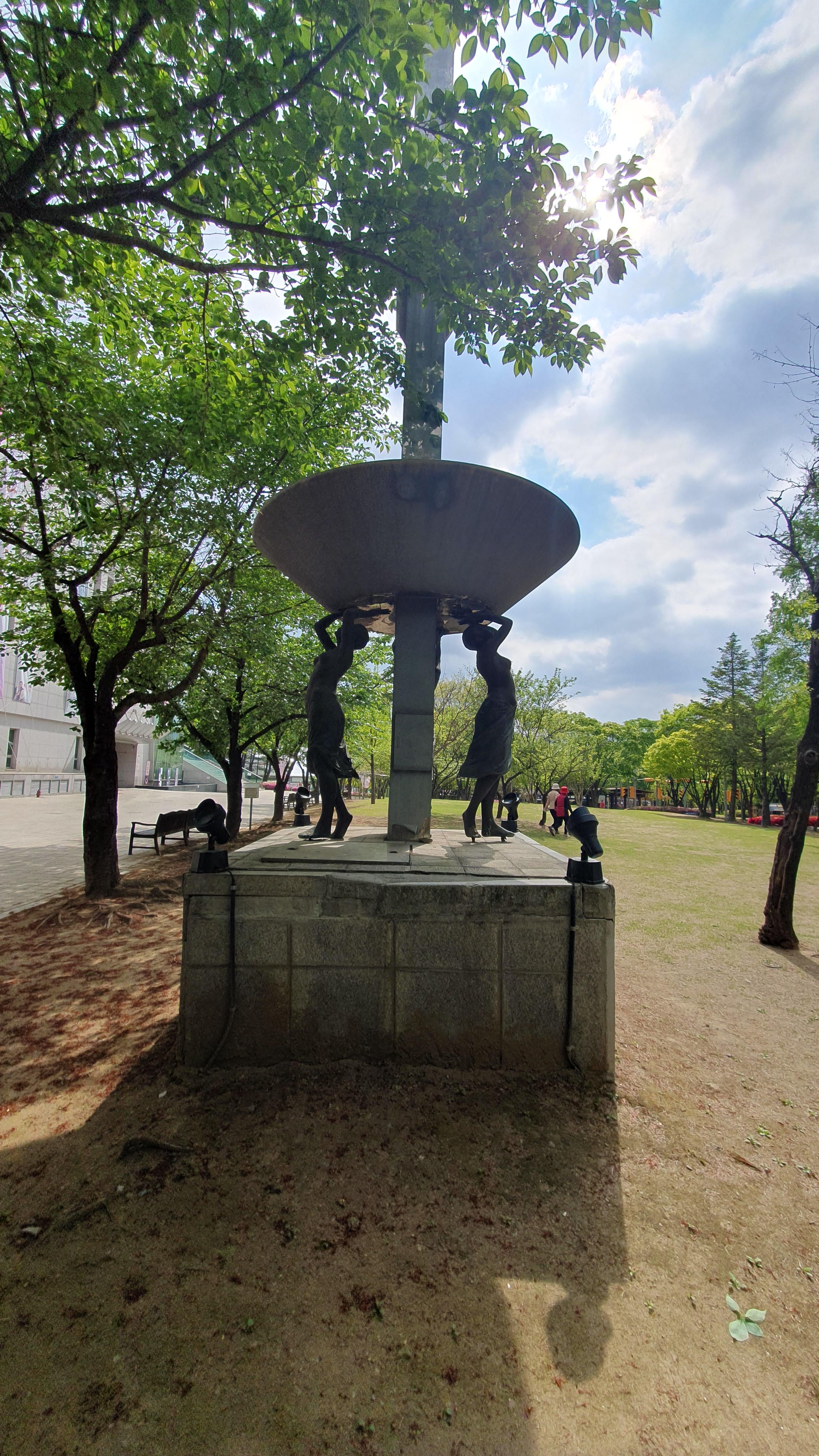 2023.04.26/ #도시기록 #공공미술 #작품 #자유공원 #평촌학원가/ 평촌학원가 사거리에 세워져 있다가 언젠가 갑자기 없어진 작품을 인근 자유공원 평촌아트앞 정원에서 발견하다. 세명의 여성이 포도주를 따르는 듯한 형태의 이 작품에 대해 작품명이나 작가, 왜 이곳으로 이전헤 설치됐는지에 대한 설명이나 안내판도 없고 곳곳이 깨지고, 찌부러지고, 녹슬어 가는 모습을 보니 그냥 버려진듯한 느낌이다. 이 작품이 평촌학원가 사거리에 있을때도 차량 통행으로 접근이 쉽지않아 사진찍기도 누구의 어떤 작품인지 알기도 어려웠다. 현재 그 자리에는 누군가의 다른 작품이 세워져 있다.