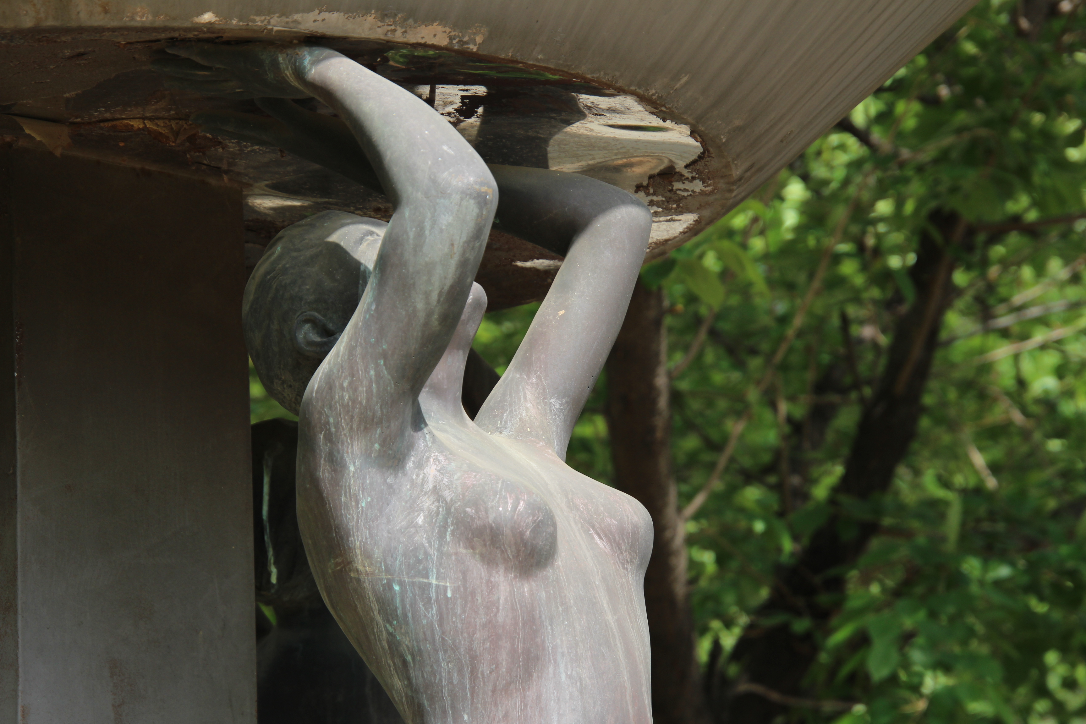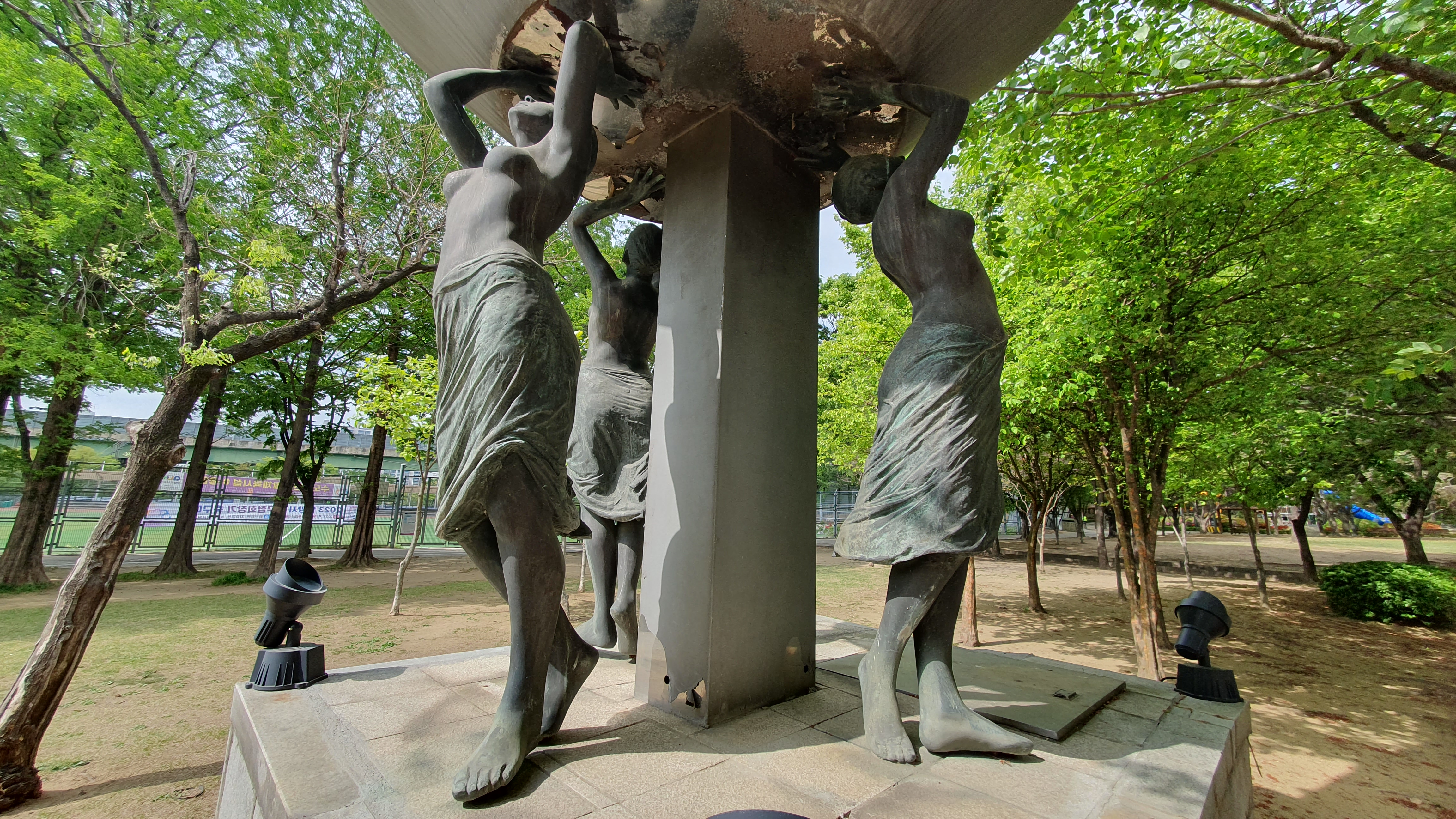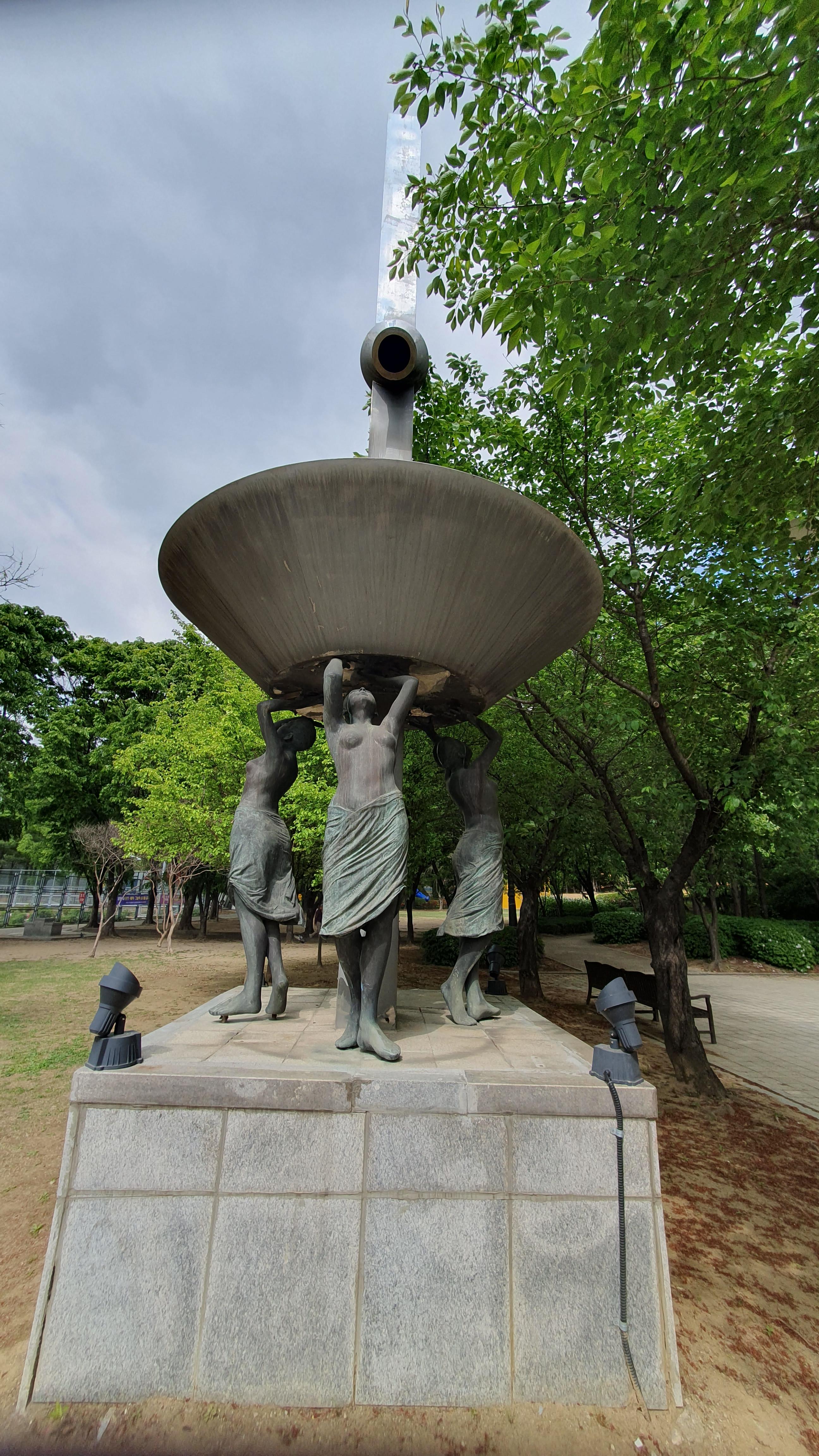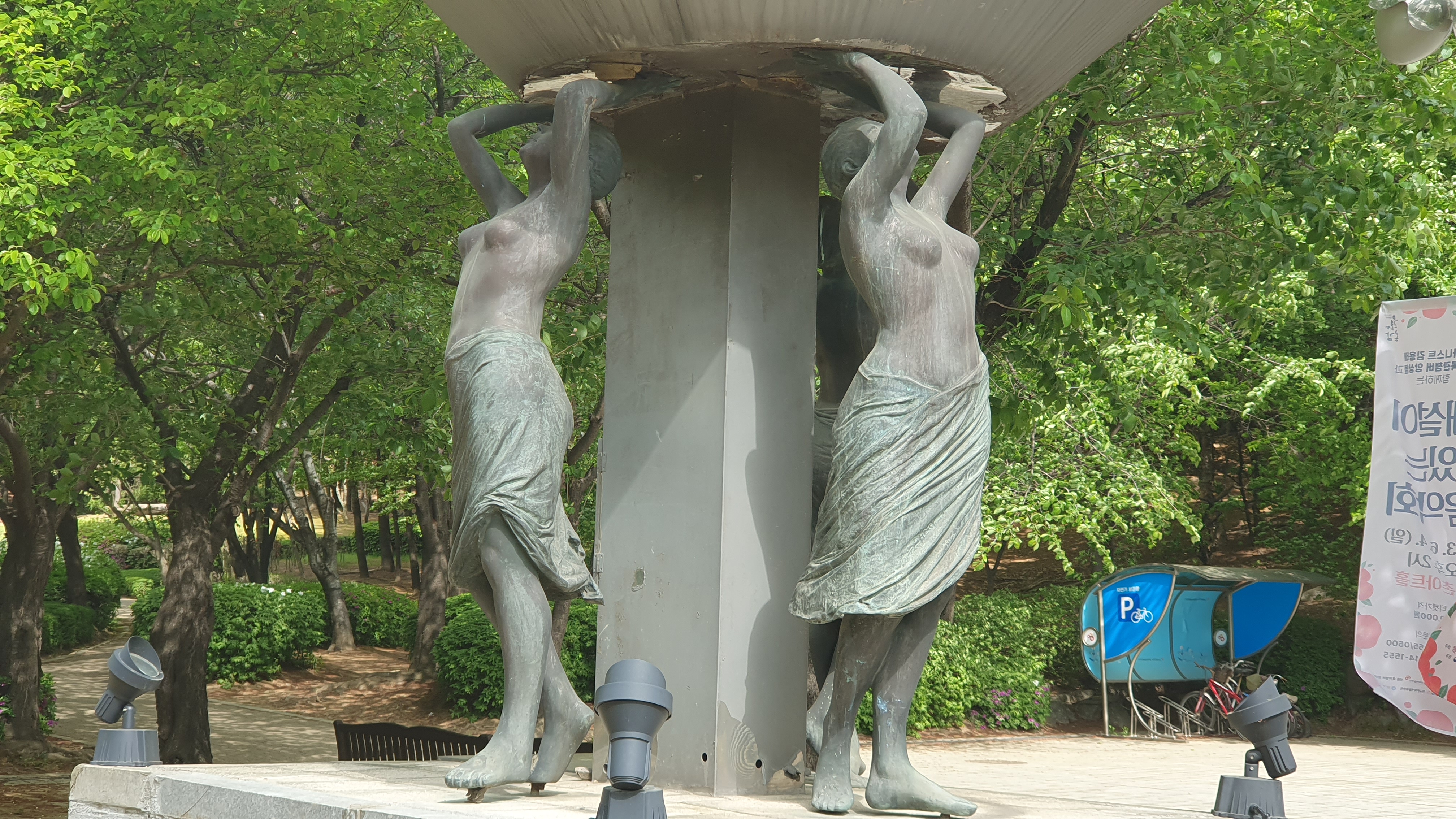 2023.04.26/ #도시기록 #공공미술 #작품 #자유공원 #평촌학원가/ 평촌학원가 사거리에 세워져 있다가 언젠가 갑자기 없어진 작품을 인근 자유공원 평촌아트앞 정원에서 발견하다. 세명의 여성이 포도주를 따르는 듯한 형태의 이 작품에 대해 작품명이나 작가, 왜 이곳으로 이전헤 설치됐는지에 대한 설명이나 안내판도 없고 곳곳이 깨지고, 찌부러지고, 녹슬어 가는 모습을 보니 그냥 버려진듯한 느낌이다. 이 작품이 평촌학원가 사거리에 있을때도 차량 통행으로 접근이 쉽지않아 사진찍기도 누구의 어떤 작품인지 알기도 어려웠다. 현재 그 자리에는 누군가의 다른 작품이 세워져 있다.