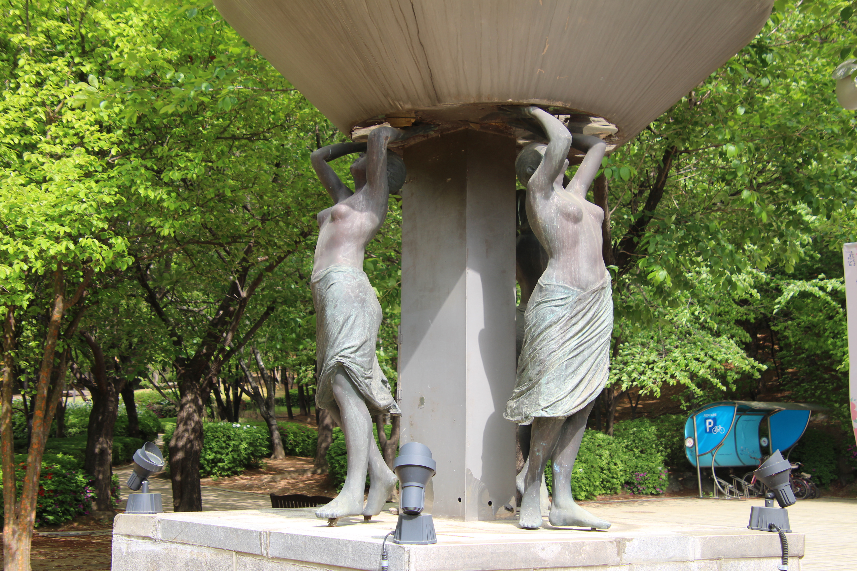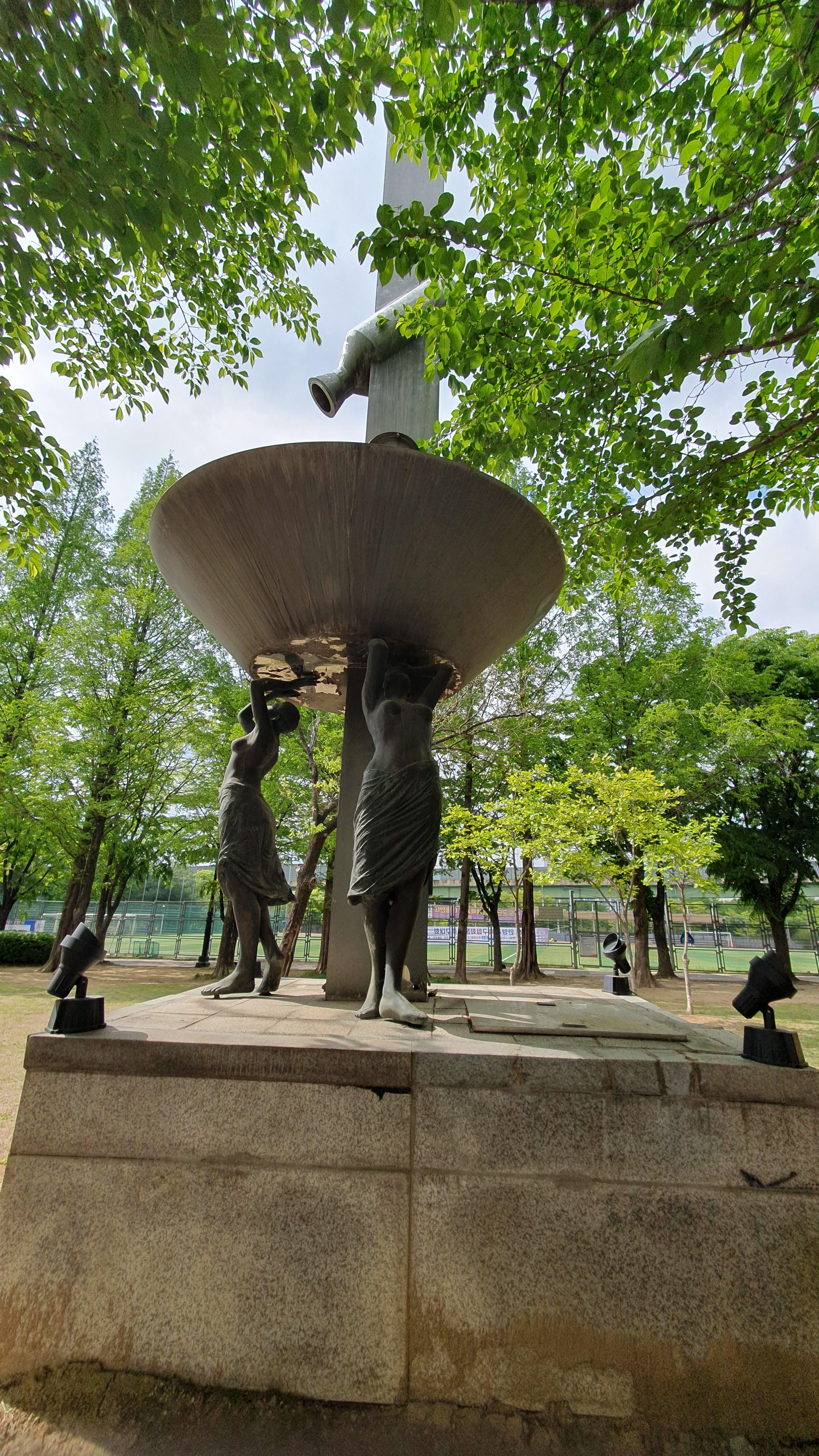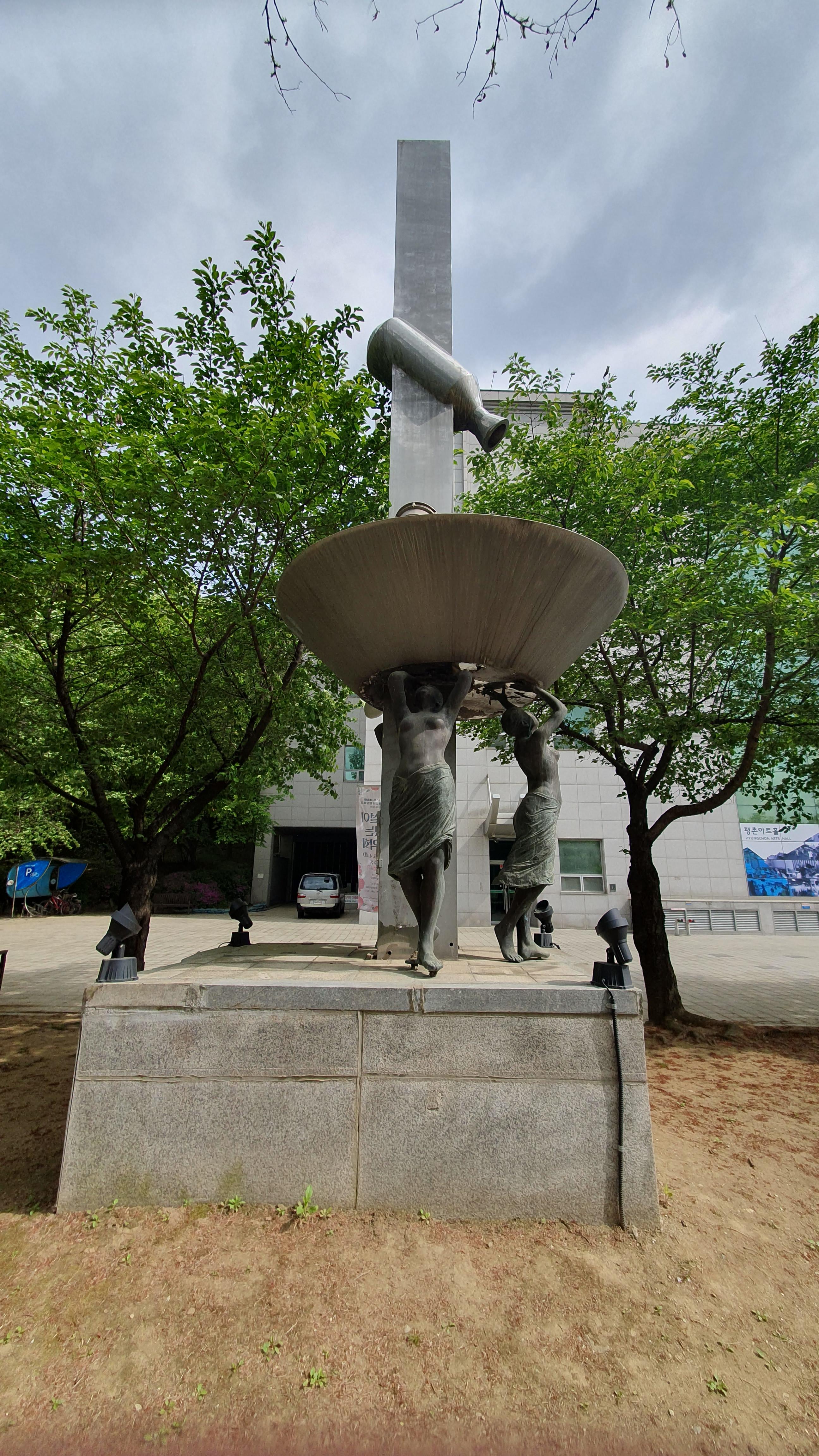 2023.04.26/ #도시기록 #공공미술 #작품 #자유공원 #평촌학원가/ 평촌학원가 사거리에 세워져 있다가 언젠가 갑자기 없어진 작품을 인근 자유공원 평촌아트앞 정원에서 발견하다. 세명의 여성이 포도주를 따르는 듯한 형태의 이 작품에 대해 작품명이나 작가, 왜 이곳으로 이전헤 설치됐는지에 대한 설명이나 안내판도 없고 곳곳이 깨지고, 찌부러지고, 녹슬어 가는 모습을 보니 그냥 버려진듯한 느낌이다. 이 작품이 평촌학원가 사거리에 있을때도 차량 통행으로 접근이 쉽지않아 사진찍기도 누구의 어떤 작품인지 알기도 어려웠다. 현재 그 자리에는 누군가의 다른 작품이 세워져 있다.