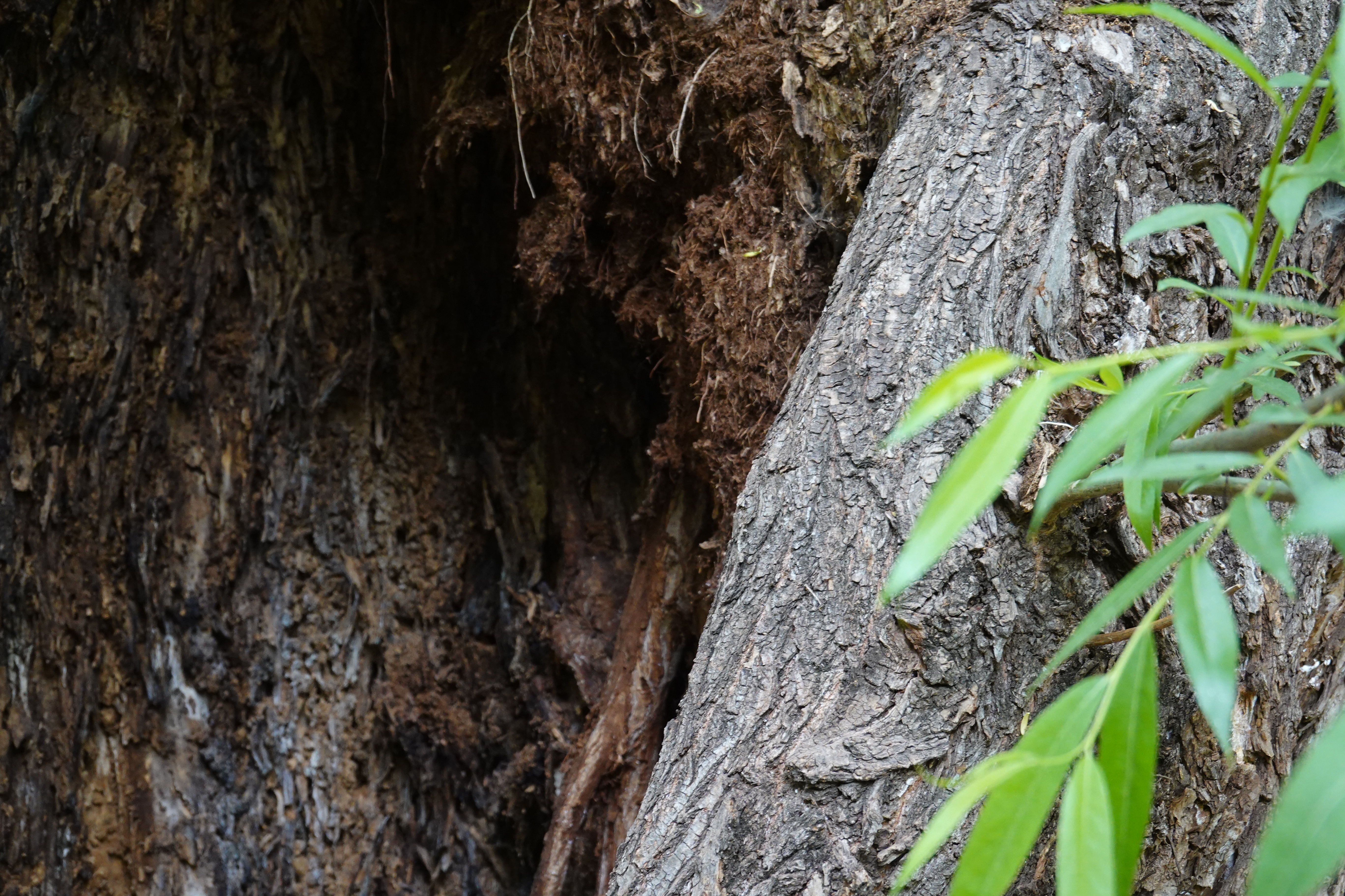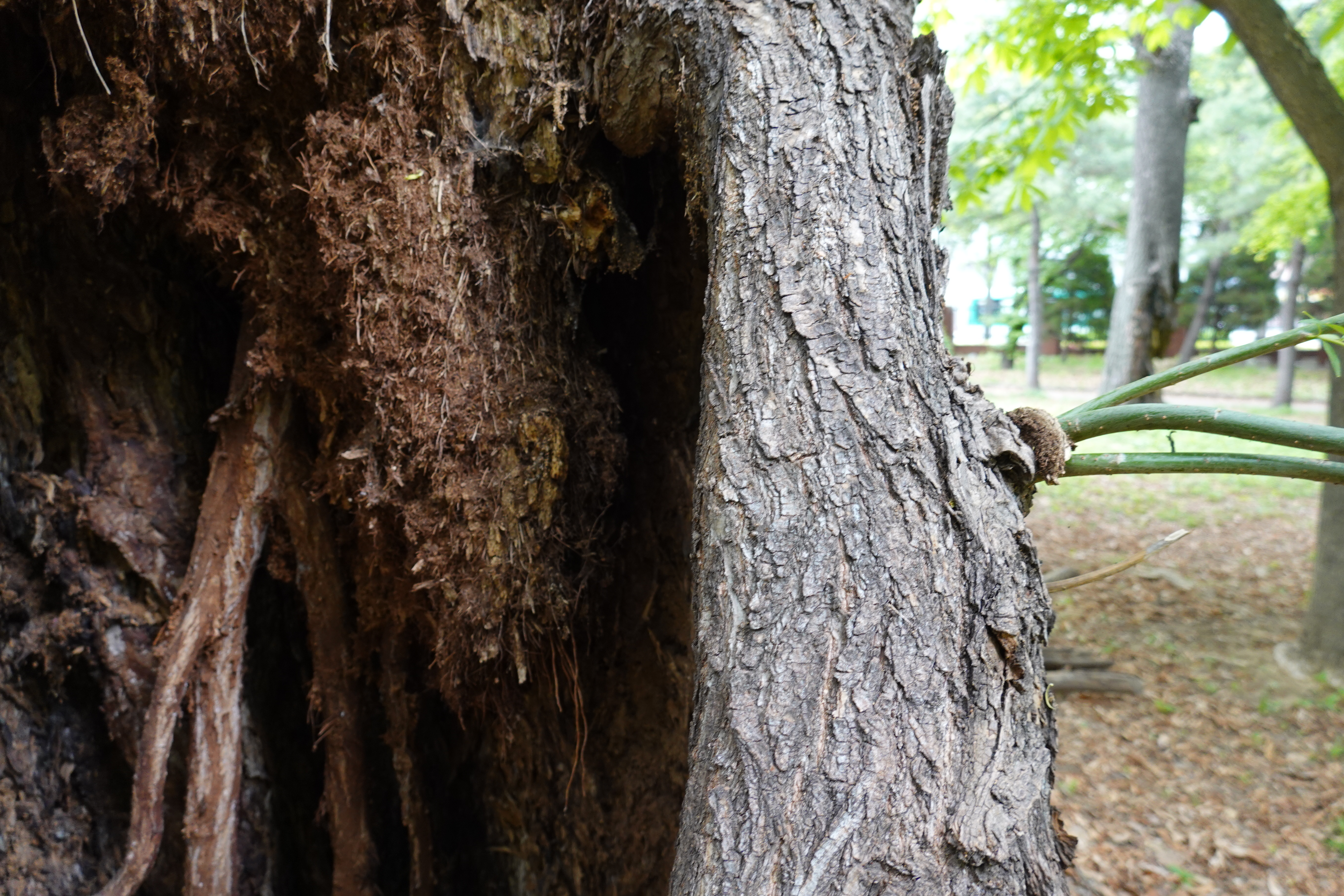 2023.04.28/ #도시기록 #안양 #옛검역원터 #왕버드나무 #생명력/ 1963년 지어진 옛 국립수의과학검역원의 흥망을 모두 지켜보아왔을 정원 중심의에 우뚝 서있는 나무 한그루 왕버드나무. 검역원이 있을 당시만해도 멀쩡하게 잘자라고 있던 나무가 검역원이 떠나고 검역원터가 주차장으로 개방되고 정원에 사람들이 들어언 이후부터 시름시름 병들기 시작했다. 지금은 나무기둥의 속이 썩고 삭아 없어지면서 나무 기둥 중간에 사람 한명이 들어가 웅크리고 앉아 있을 정도의 구멍이 생겼다. 특히 나무기둥에 껍질만 남은 상태로 변했음에도 끈질긴 생명력으로 푸릇푸릇한 초록의 잎사귀를 만들어 내고 있다.
