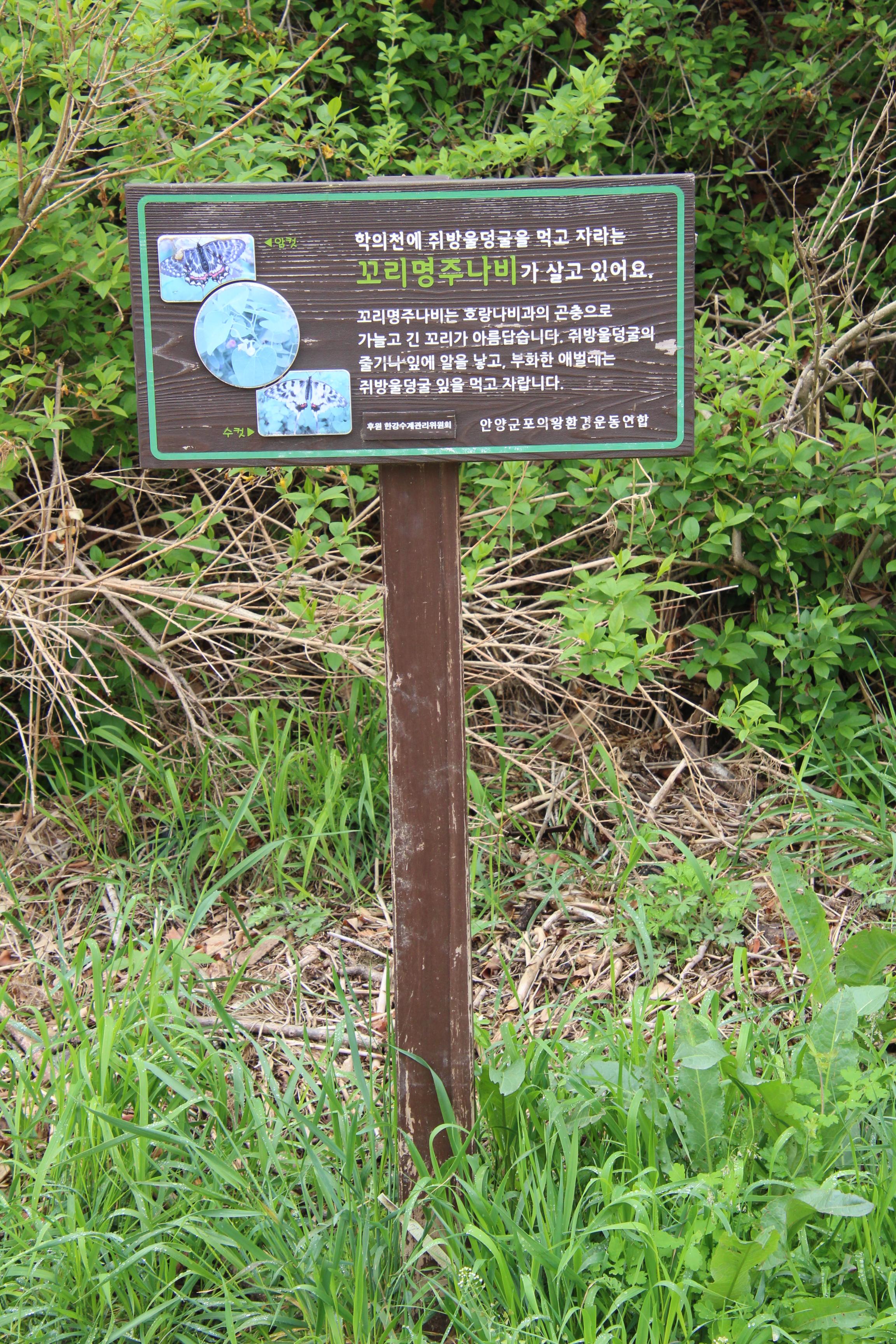 안양 관양동 학의천 남단 뚝방과 천변에는 꼬리영주나비 애벌레의 먹이인 쥐방올덩굴군락지가 있다. 꼬리명주나비는 세계자연보전연맹(IUCN)의 적색목록집에 ‘취약 대상’으로 지정된 멸종위기종으로 나비목 호랑나빗과 곤충으로 꼬리가 가늘고 길다. 뒷날개 뒤쪽에 붉은 띠와 2~3개의 푸른 점이 있다. 20여 년 전만 해도 주변에서 쉽게 볼 수 있는 곤충이었지만 하천 정비 등으로 먹이 식물인 쥐방울덩굴이 사라지면서 개체 수가 급격하게 감소했다. 쥐방울덩굴은 꼬리명주나비의 유일한 먹이식물로 주로 하천 주변에 서식한다. 꼬리명주나비알은 1년에 3회(4·6·8월) 부화한다. 초여름 학의천 관양동(관양교~인덕원인도교)의 흙길을 걷다보면 꼬리명주나비들의 멋진 비행을 볼 수 있다.