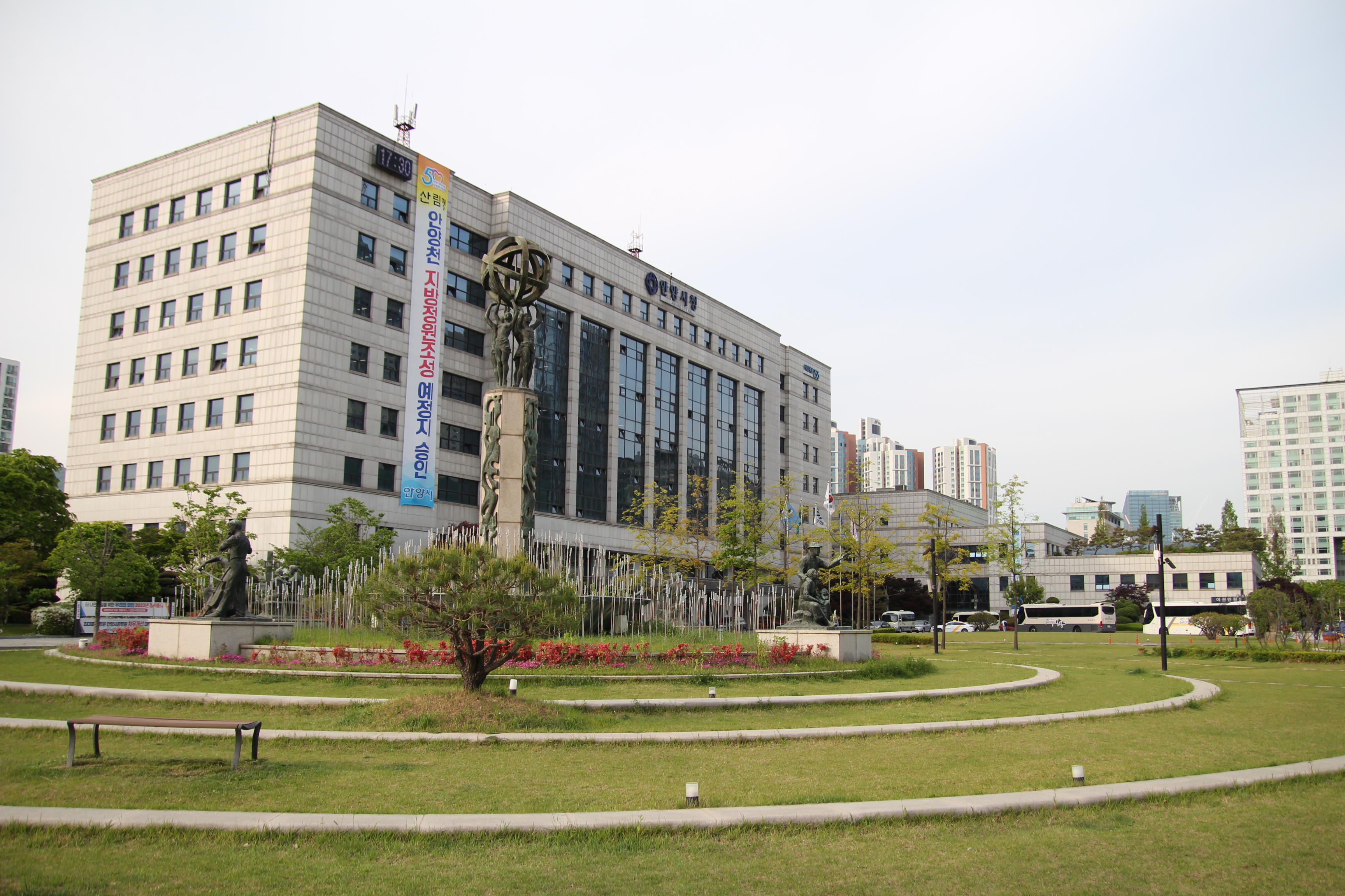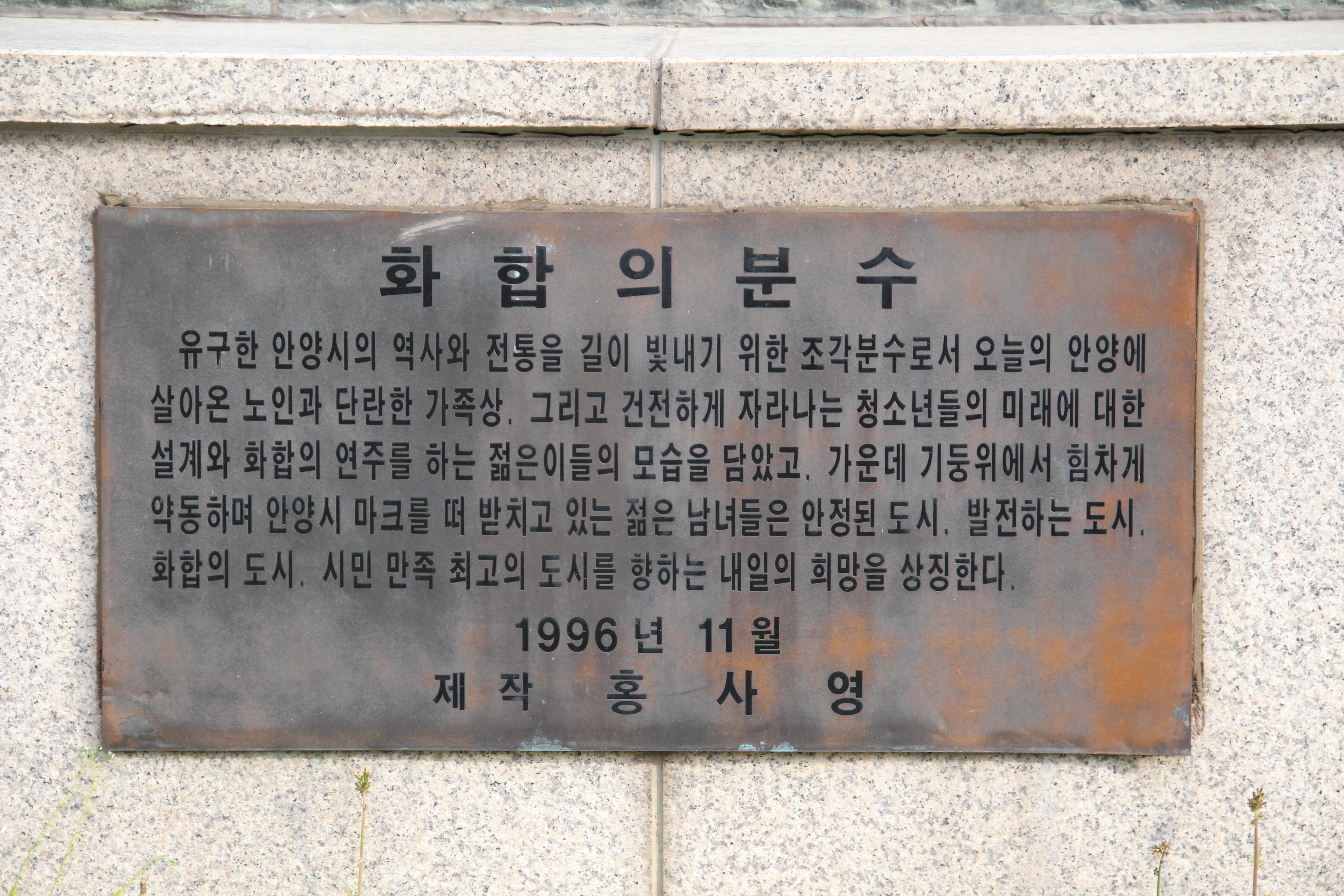 2023.05.04/ #도시기록 #안양시청 #조형물 #화합의분수/ 안양시청과 안양시의회 중간에 자리한 대형조형물을 살피다가 발견한 비밀과 의문. 안양시청과 안양시의회 중간에 자리한 대형조형물은 안양시청사 신축 당시인 1996년 11월 설치된 분수대로 작품명은 화합의분수. 제작은 홍사영 작가이다. 분수대는 2010년대 초반까지만 해도 여름에 운용했으나 2017년 시청사 광장에 수목과 푸른 잔디를 심고, LED조명이 있는 정원으로, 경비실을 카페로 리모델링하면서 분수대 용도가 폐기되고 말았다.