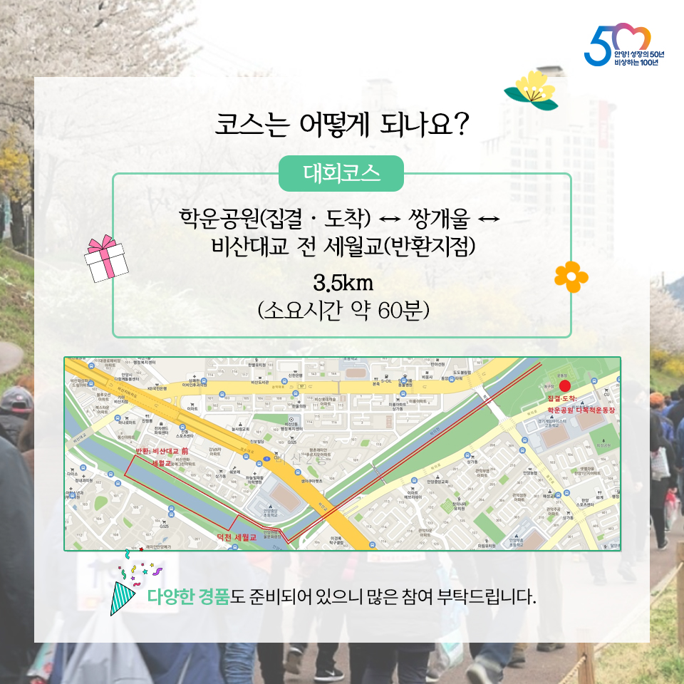 안양시체육회가 주최하고 안양시걷기협회가 주관한 이날 걷기대회는 학운공원을 출발해 쌍개울을 지나 비산대교 전 세월교를 반환점으로 되돌아오는 약 3.5km 코스 구간에서 약 1시간 정도 진행됐다.