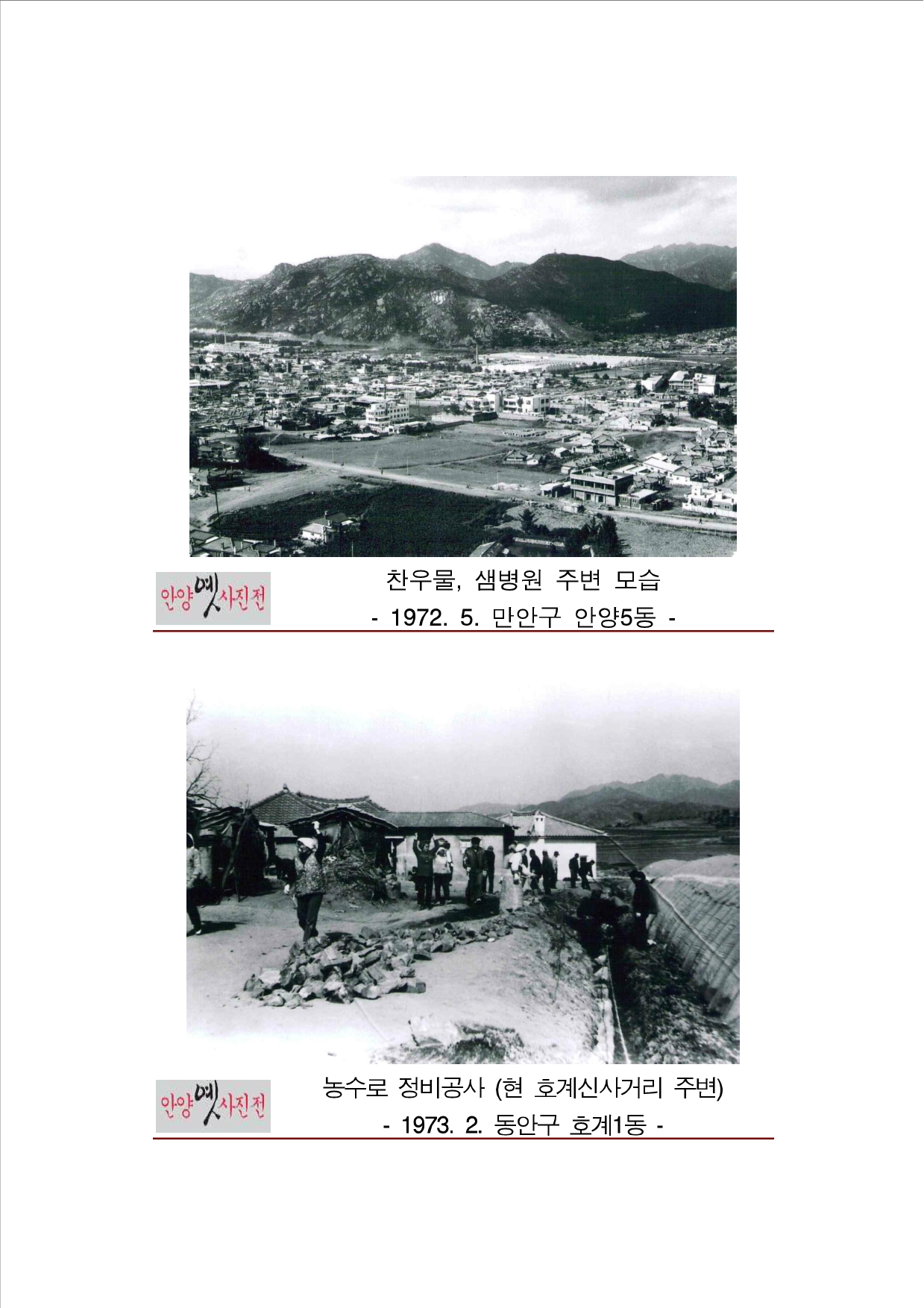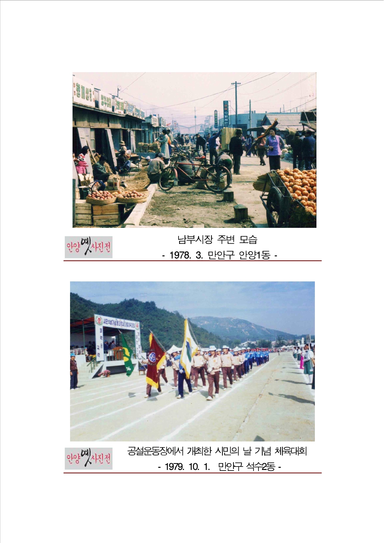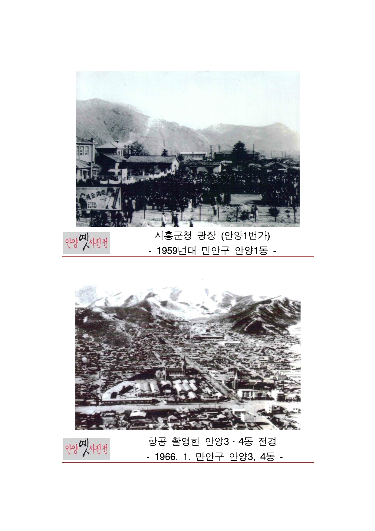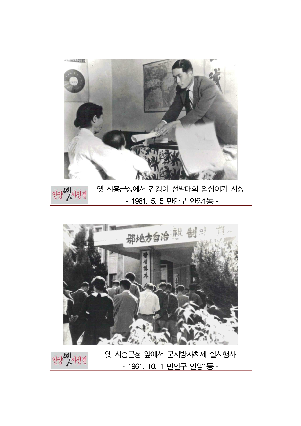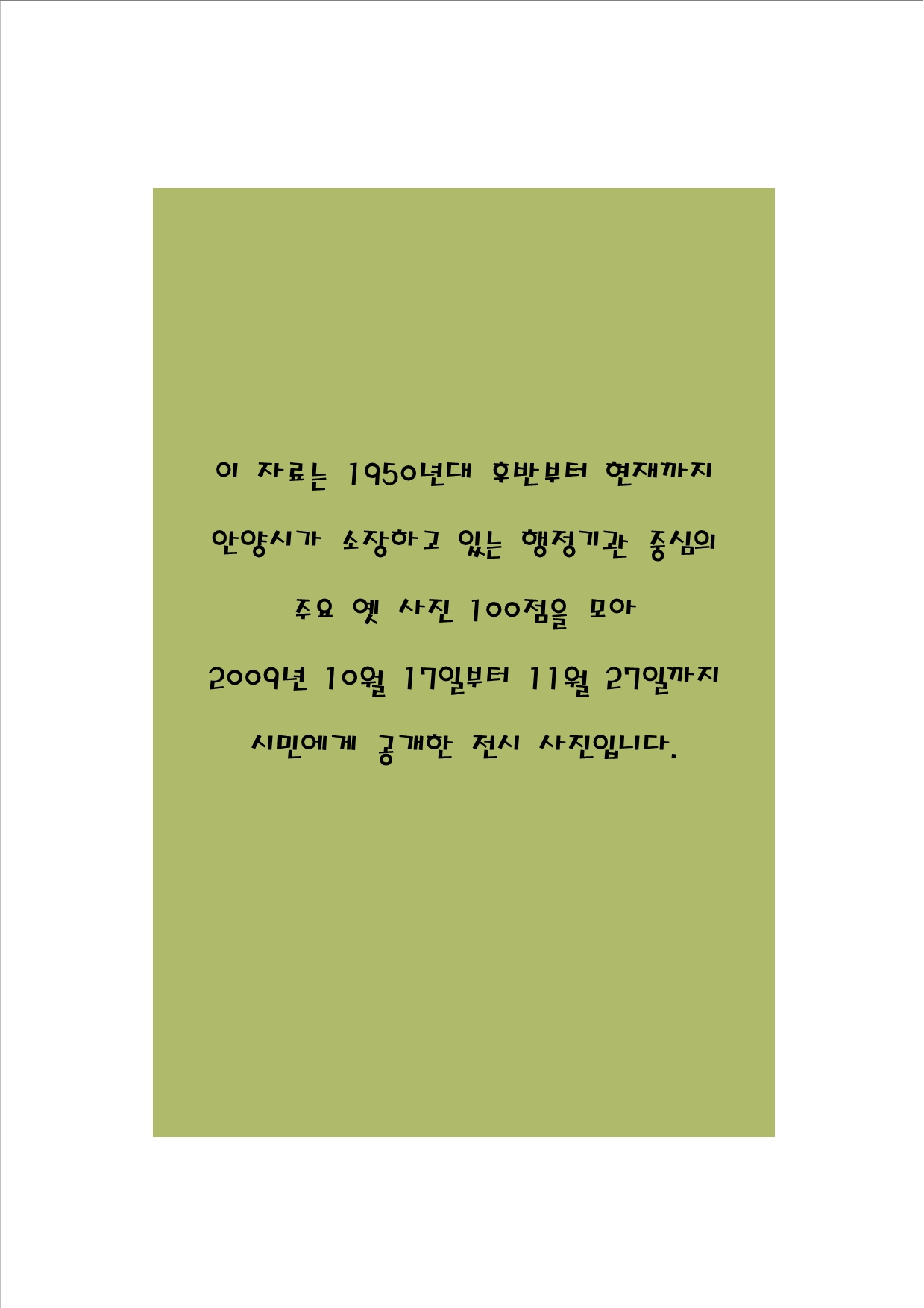 이 자료는 1950년대 후반부터 1980년대까지 안양시가 소장하고 있는 행정기관 중심의 옛 사진 100여졈을 모아 2009년 10월17일부터 11월 27일까지 전시회를 통해 시민에게 공개한 사진들로 이후 안양옛사진 제목으로 사진첩을 만들고 그 이후 에는 DBF파일로 만들어 제공한 내용입니다.