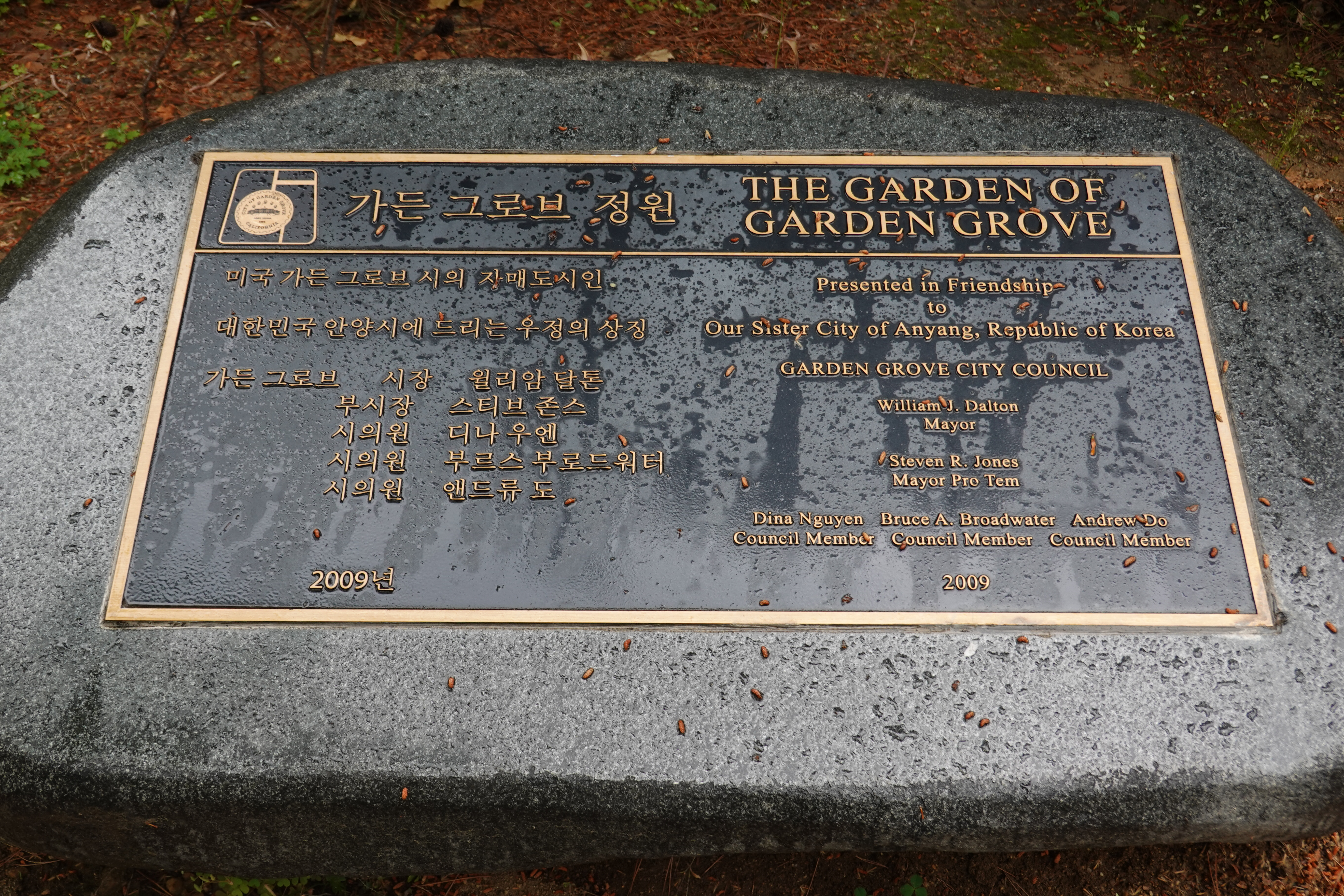 안양시와 국제자매결연을 맺고 있는 미국 캘리포니아주 가든그로브 시의 37년 쌓아온 우호증진을 기리는 기념으로 조성한 공간이다.