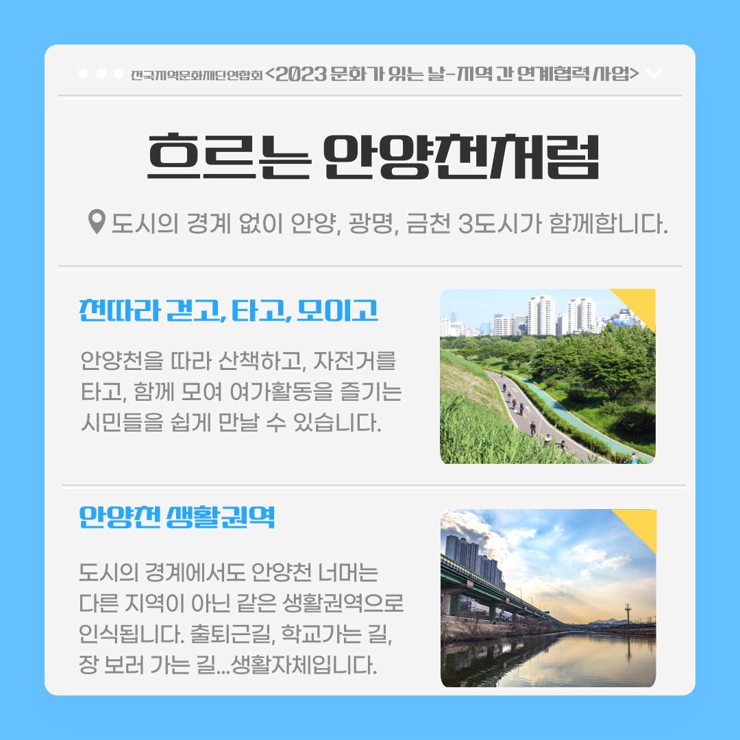 이후 8월과 10월 문화가 있는 날 주간에 맞춰 ▲금천 ·광명 ·안양 세 지역이 함께하는 ‘안양천 리서치’(6월) ▲안양천 생태 이야기관과 연계한 ‘도시 포럼’(8월) ▲춤을 매개로 세 지역의 시민들이 교류, 함께 만들어 가는 ‘안양천 무무(舞舞)퍼레이드’(10월)를 추진한다는 계획이다.