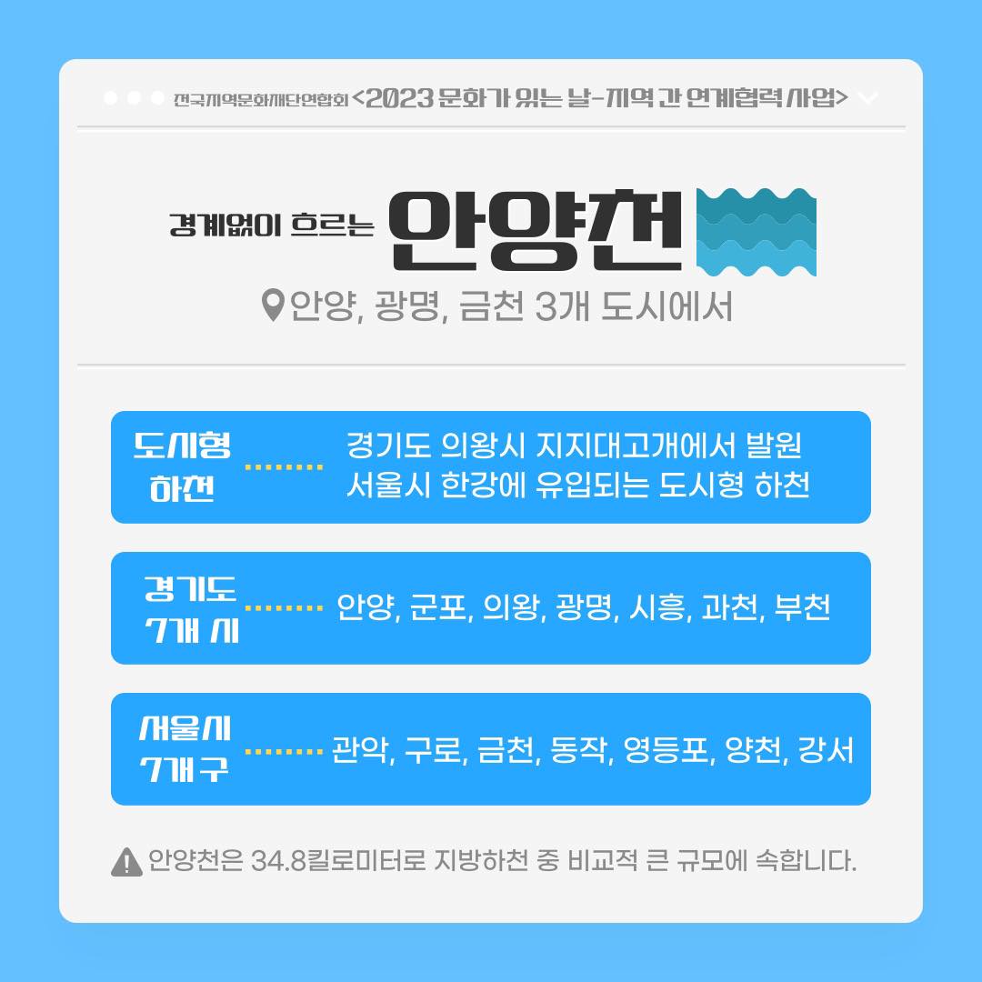 안양문화예술재단과 광명문화재단 ·금천문화예술재단이 공동으로 안양천 100리길 문화사업을 펼친다.