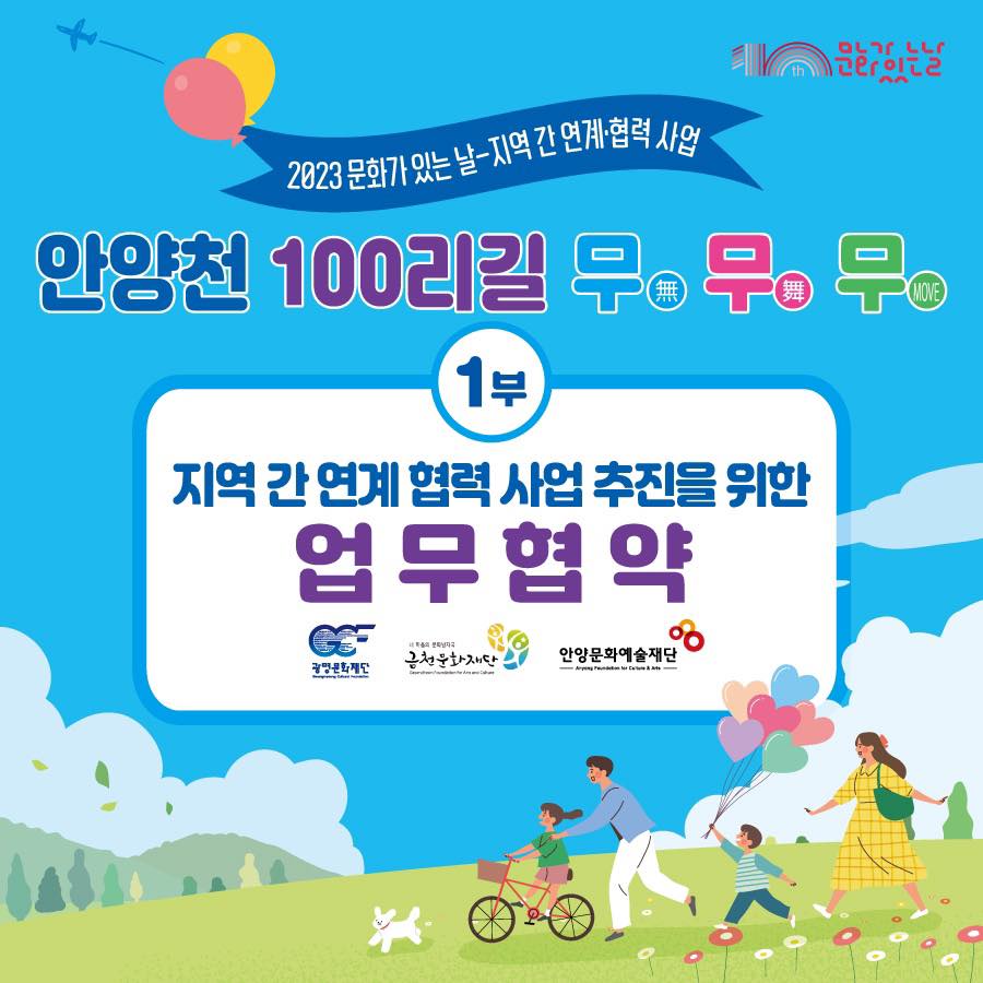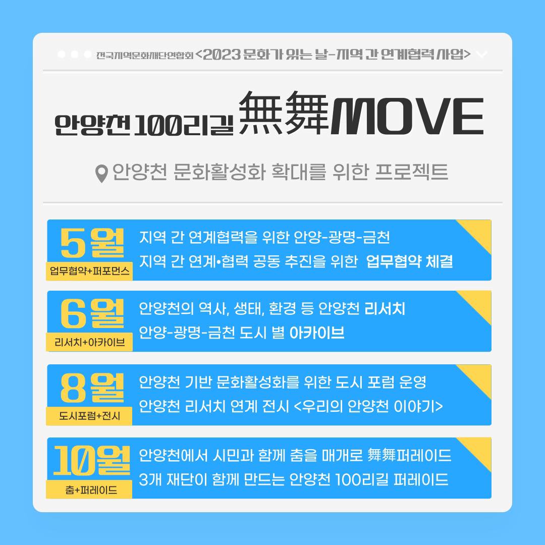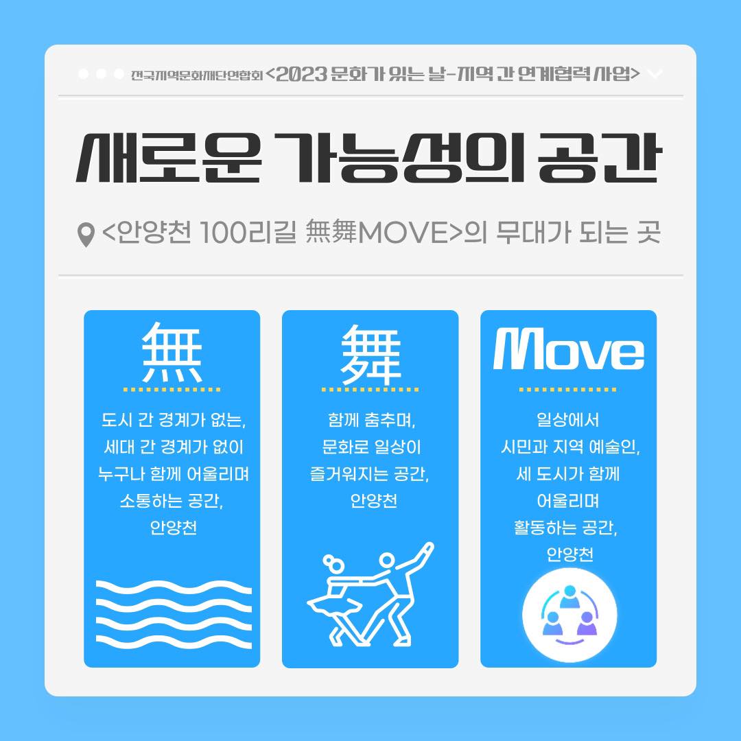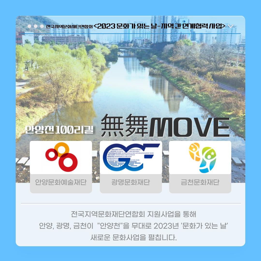 ‘안양천 100리길, 무무무(無舞Move)’는 세 기관이 위치한 서울 금천구 ·경기 광명 ·경기 안양을 모두 지나는 안양천에서(無경계), 시민 누구나 춤추고(함께 舞), 문화로 활력이 넘치는 다채로운 움직임을(Move) 만드는 사업이다.