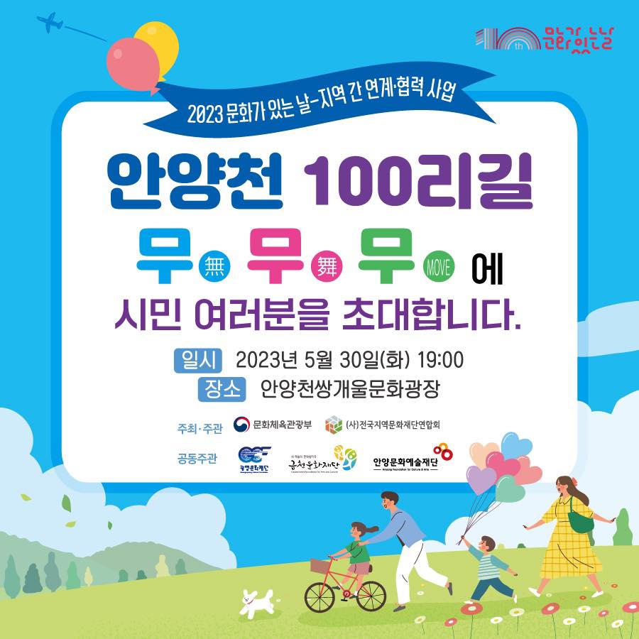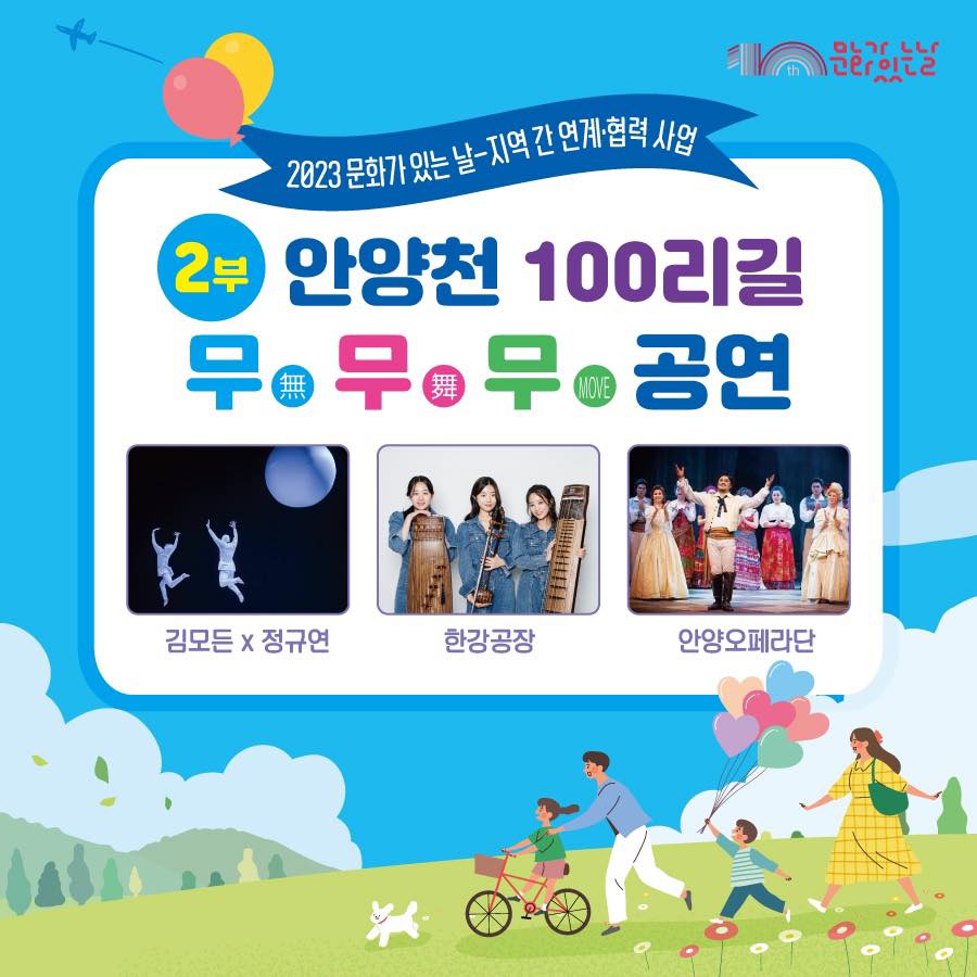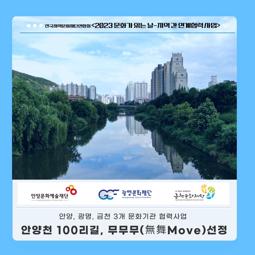 이는 안양천을 관내 유역으로 두고 있는 안양.광명.,금천구 3개 지자체 문화재단이 기획한 ‘안양천 100리길, 무무무(無舞Move)’가 문화체육관광부가 주최하는 ‘지역 간 연계·협력 사업’ 공모에 최종 선정됐기 때문이다.