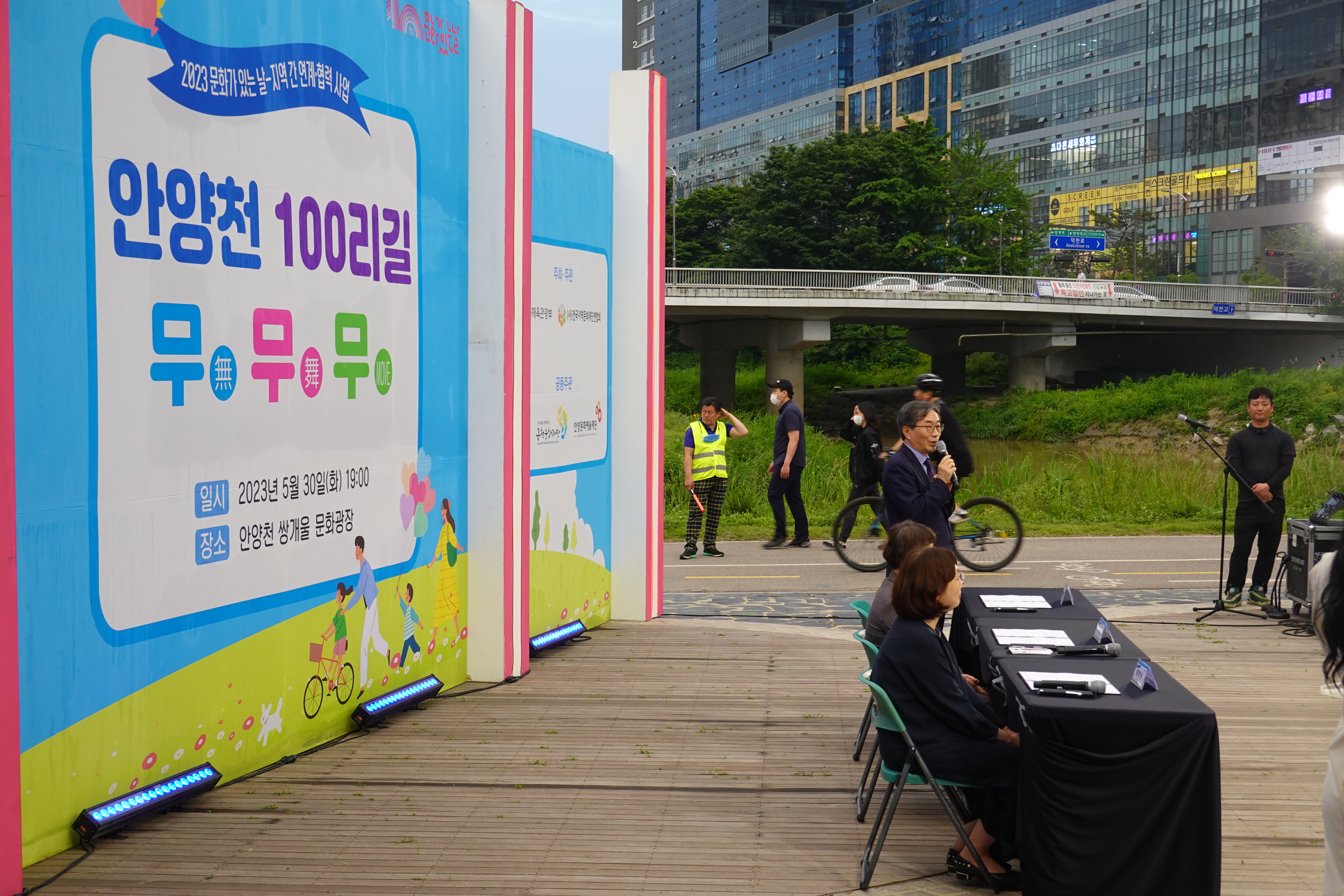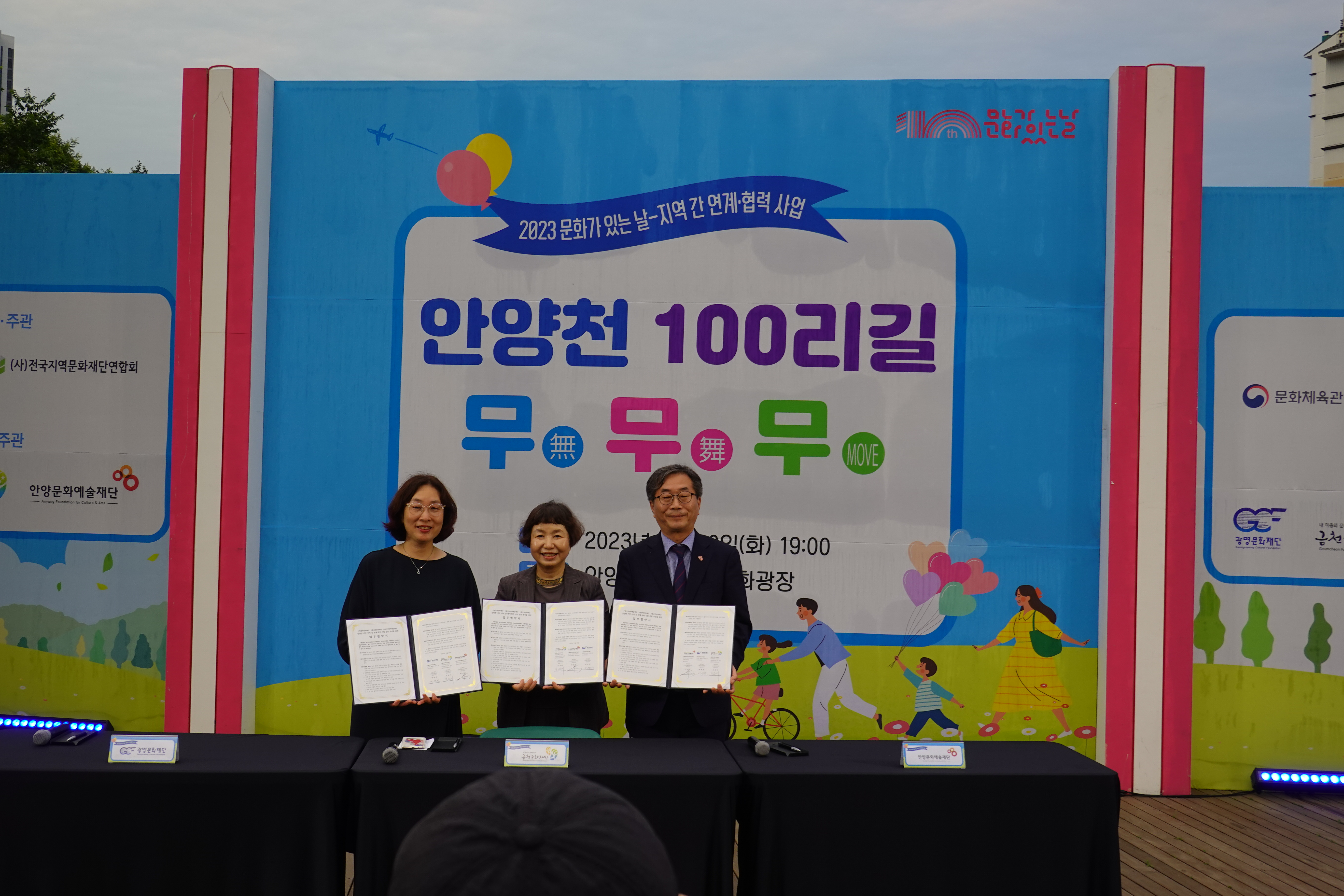 안양문화예술재단과 광명문화재단 ·금천문화예술재단이 지난 30일 안양천 쌍개울 문화광장에서 '안양천 100리길, 무무무(無舞Move)' 추진을 위한 업무협약을 체결했다.