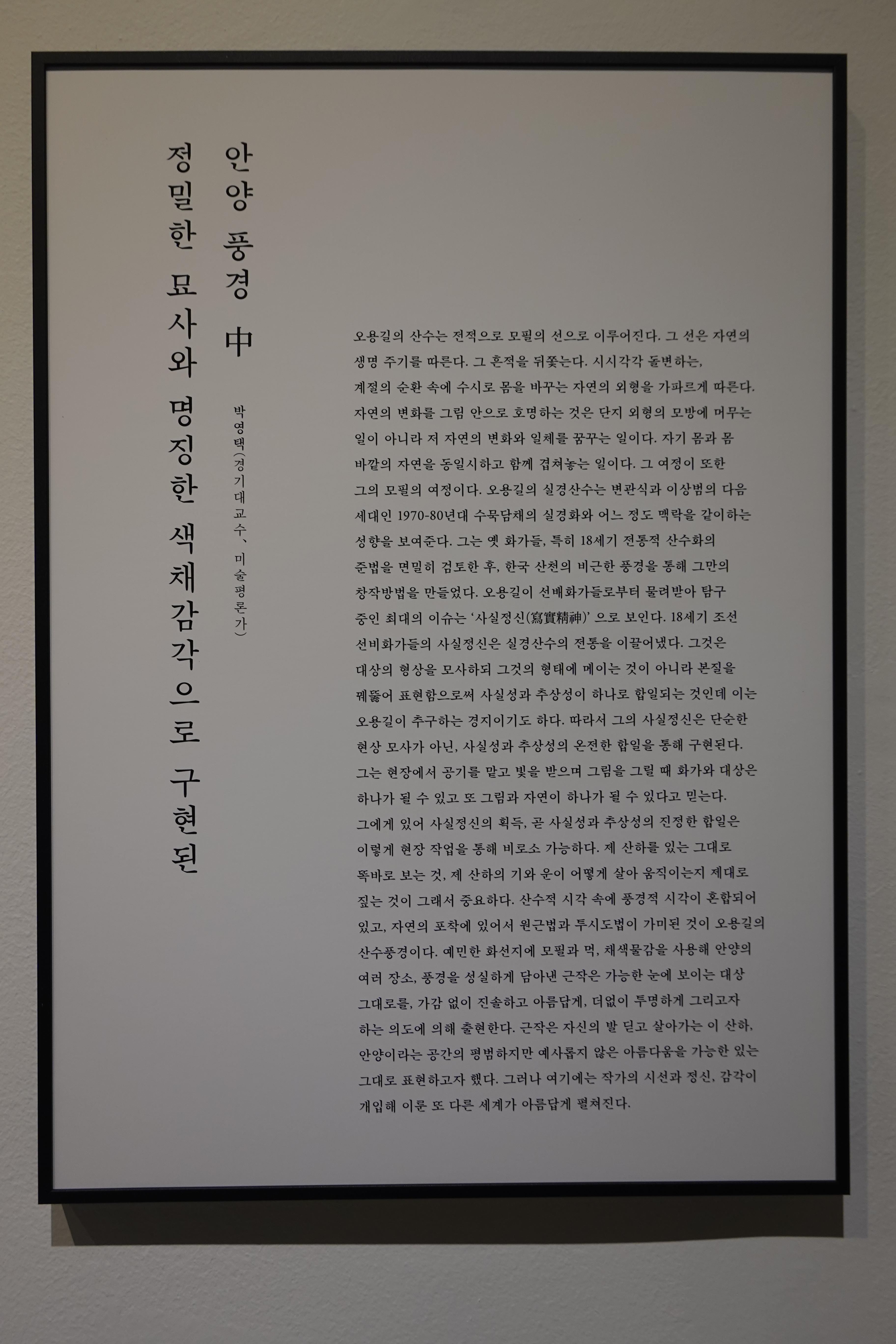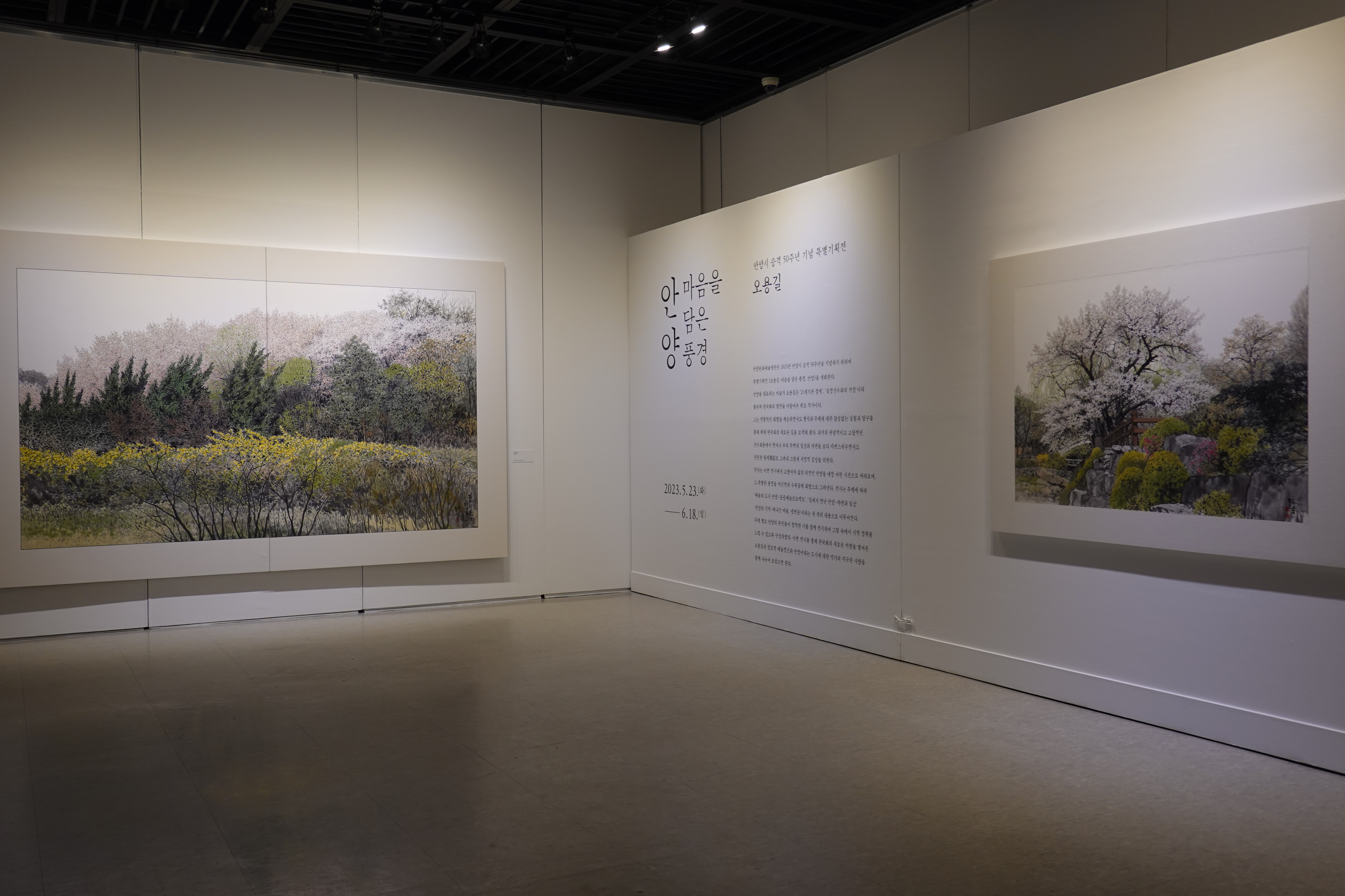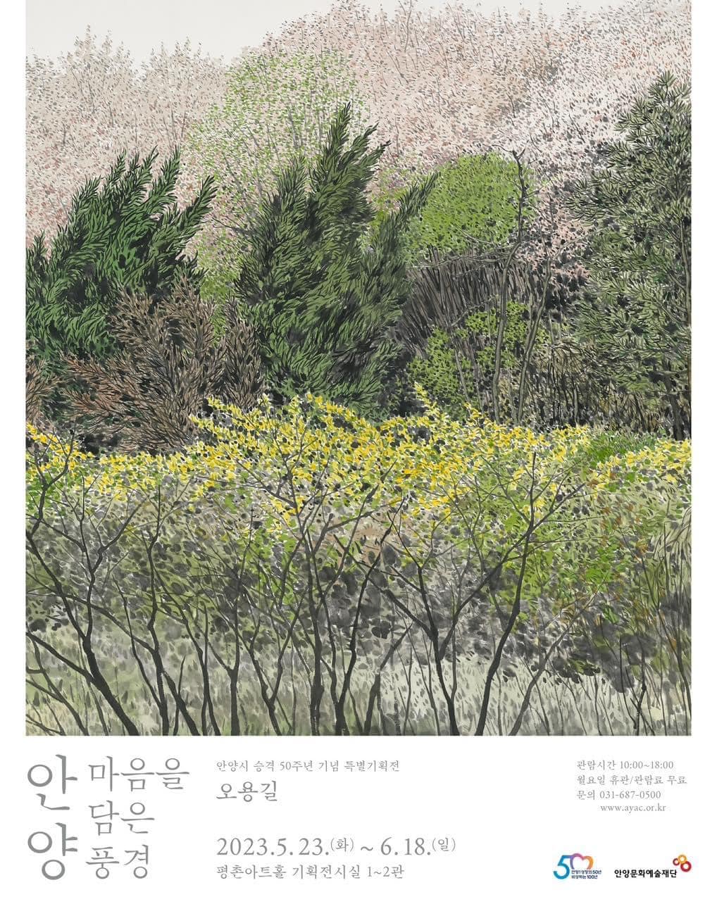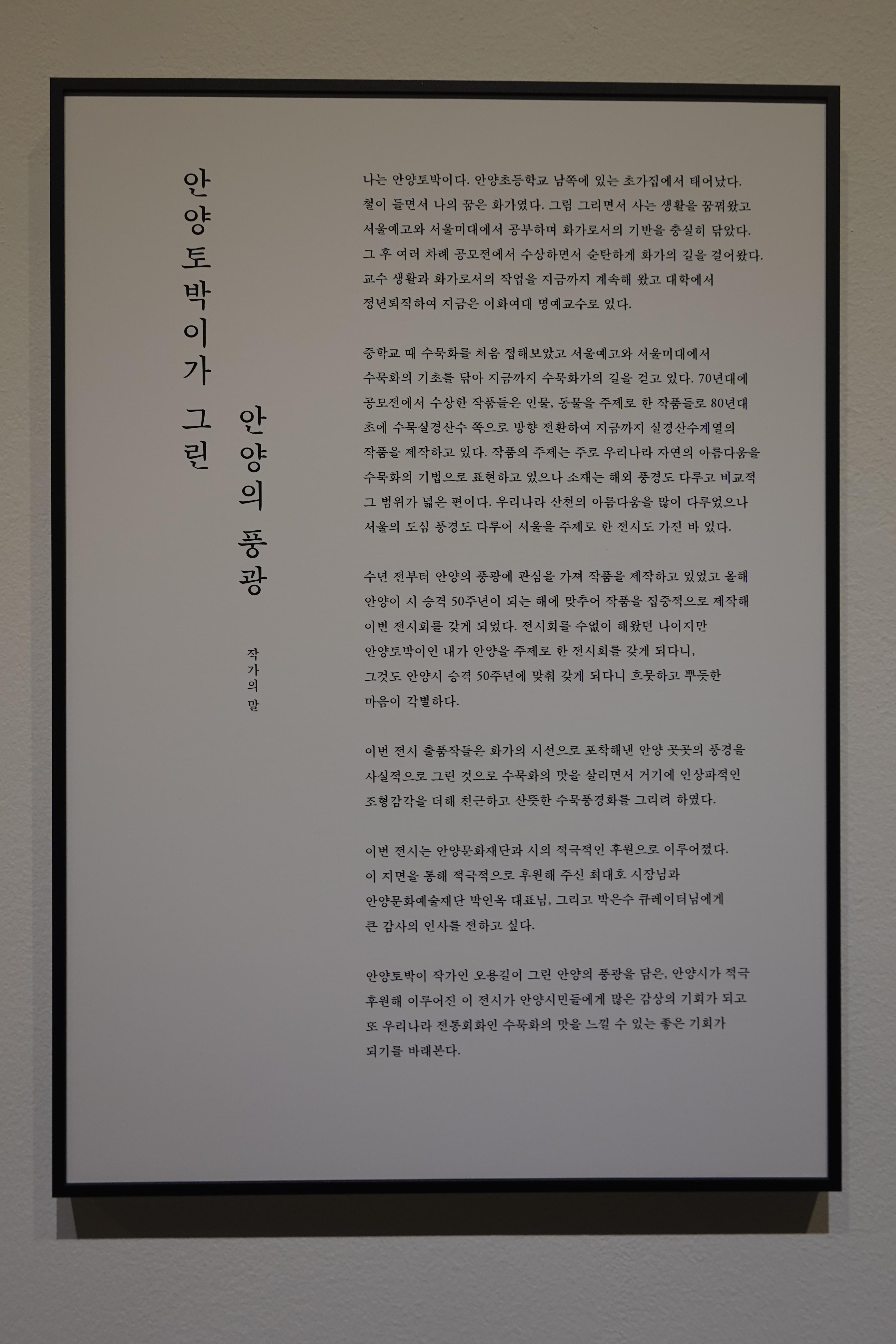 안양문화예술재단이 2023년 안양시 승격 50주년을 기념하기 위하여 마련한 특별기획전 <오용길 : 마음을 담은 풍경, 안양>이 안양 평촌아트롤 전시관에서 열리고 있다.