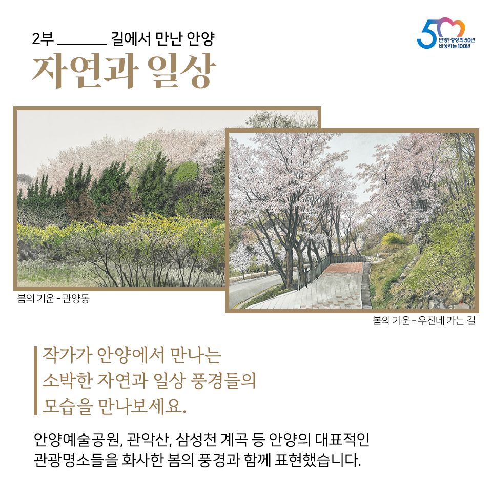 안양을 대표하는 미술가 오용길 화백은 '21세기판 겸재', '실경산수화의 거장'이라 불리며 한국화의 발전을 이끌어온 원로 화가로 이번 전시에서는 작가 특유의 수묵담채 화법으로 안양의 도시와 자연, 예술을 그려낸 아름다운 풍경 작업을 선보인다.