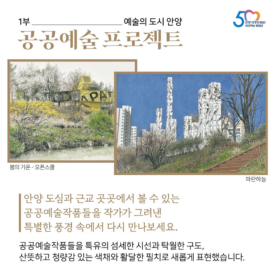 안양을 대표하는 미술가 오용길 화백은 '21세기판 겸재', '실경산수화의 거장'이라 불리며 한국화의 발전을 이끌어온 원로 화가로 이번 전시에서는 작가 특유의 수묵담채 화법으로 안양의 도시와 자연, 예술을 그려낸 아름다운 풍경 작업을 선보인다.