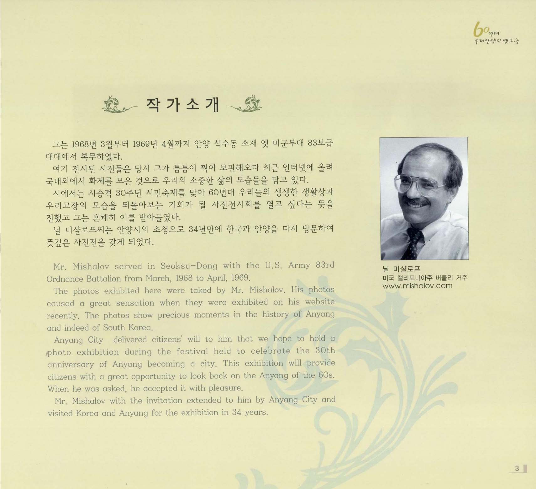 안양시는 지난 2003년 10월 시승격 30주년 시민축제를 맞아 닐 미샬로프씨에게 60년대 우리들의 생생한 생활상과 모습을 되돌아 보는 기회가 될 사진전시회를 열고 싶다는 뜻을 전했고 이를 마샬로프씨가 받아 들여 안양시에 기증했다.