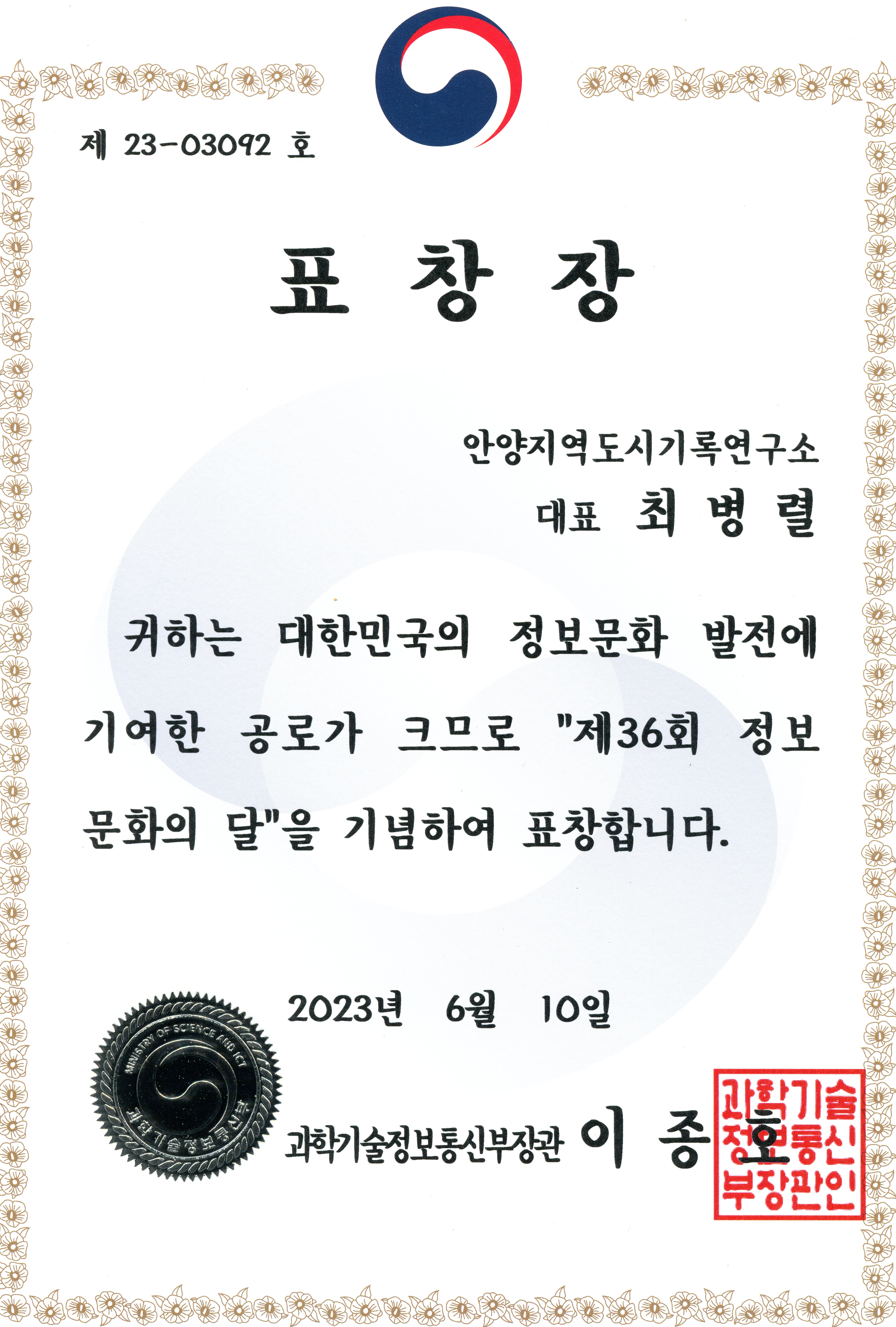 귀하는 대한민국의정보문화 발전에 기여한 공로가 크므로 제36회 정보문화의달을 기념하여 표창합니다.