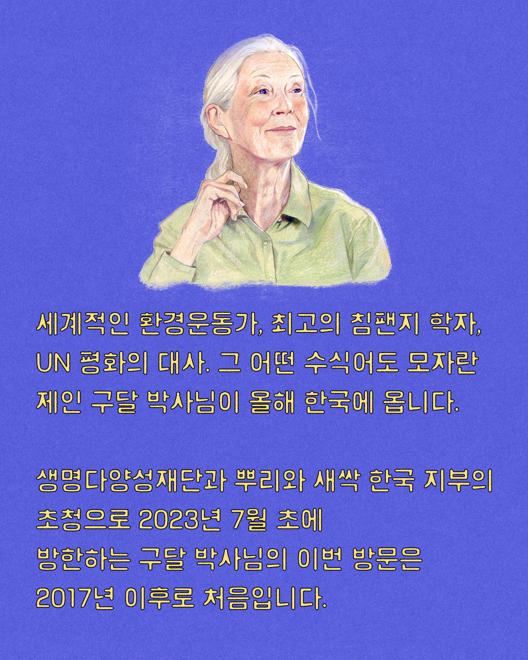 제인 구달 박사를 초청한 생명다양성재단은 세계적인 환경운동가, 최고의 침팬지 학자, UN 평화의 대사. 그 어떤 수식어도 모자란 제인 구달 박사가 오는 7월 5일부터 9일까지 한국을 방문한다며 89세의 고령에도 불구하고 기후위기와 환경파괴라는 위기에 맞서 모두가 힘을 합쳐 변화를 일궈야 하며 우리에겐 여전히 희망이 있다는 메시지를 전하고자 찾아온다고 덧붙였다.