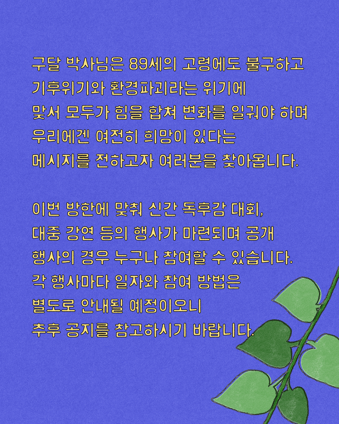 제인 구달 박사를 초청한 생명다양성재단은 세계적인 환경운동가, 최고의 침팬지 학자, UN 평화의 대사. 그 어떤 수식어도 모자란 제인 구달 박사가 오는 7월 5일부터 9일까지 한국을 방문한다며 89세의 고령에도 불구하고 기후위기와 환경파괴라는 위기에 맞서 모두가 힘을 합쳐 변화를 일궈야 하며 우리에겐 여전히 희망이 있다는 메시지를 전하고자 찾아온다고 덧붙였다.