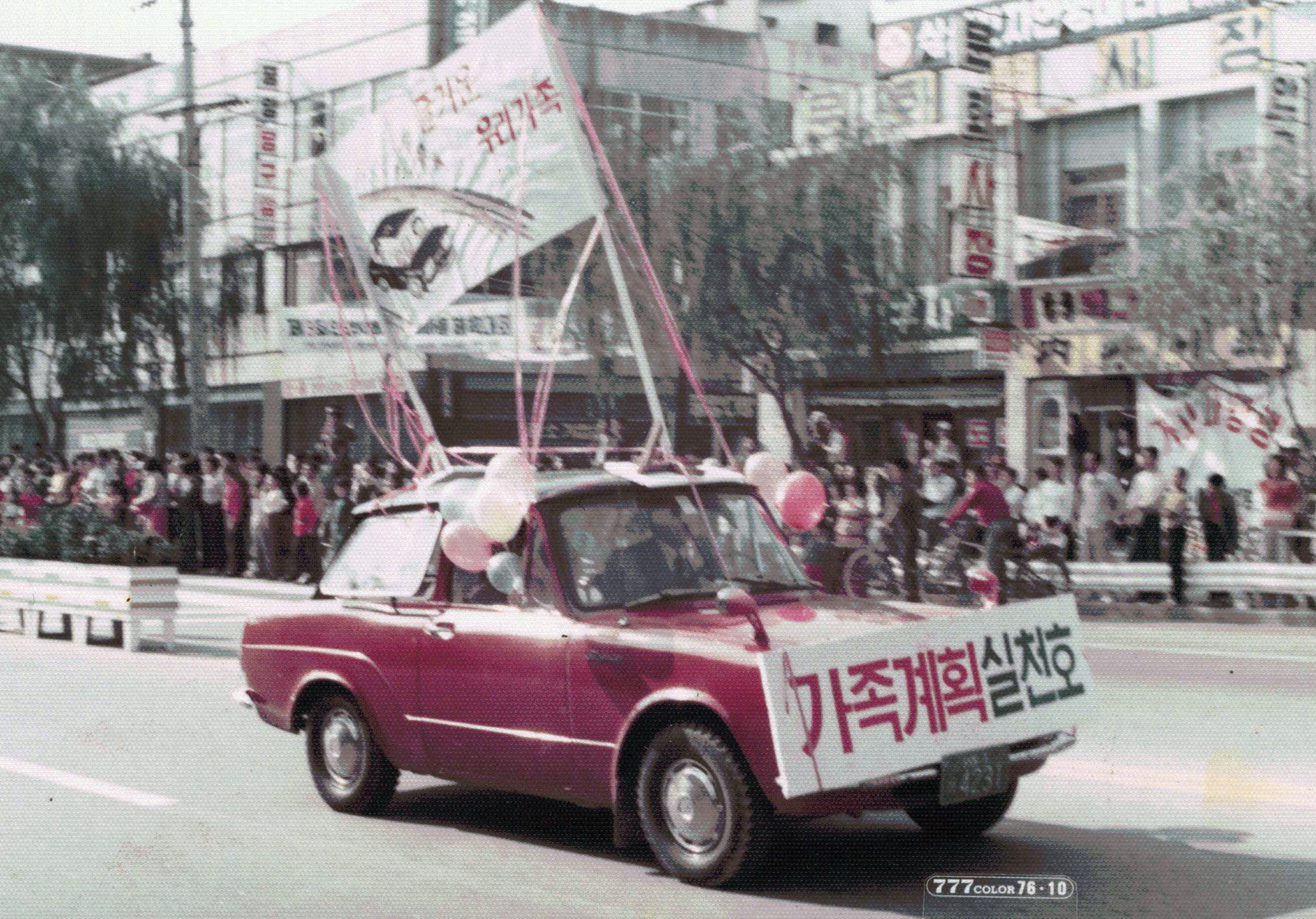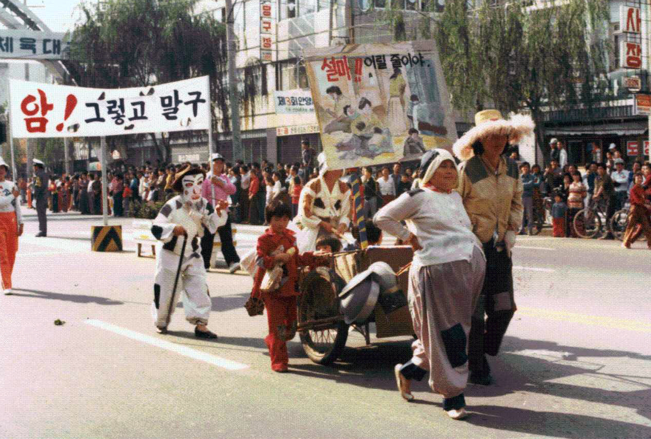2023.06.14/ #아카이브 #옛사진 #기록 #추억 #역사/ 1970년대는 정부의 가족계획이 아이 덜 낳기였다. 1970년대의 구호가 "둘만 낳아 잘기르자"였다 사진은 안양읍이 시로 승격한 이후인 1975년 무렵 진행한 시민의날 행사로 안양6동 시청에서 안양2동 만안초교까지 거리퍼레이드 행진을 했다. 당시 가족계획 홍보를 위해 구호가 적힌 현수막을 들고 우수꽝스럽지만 진지하게 분장을 한 모습이 이채롭다.