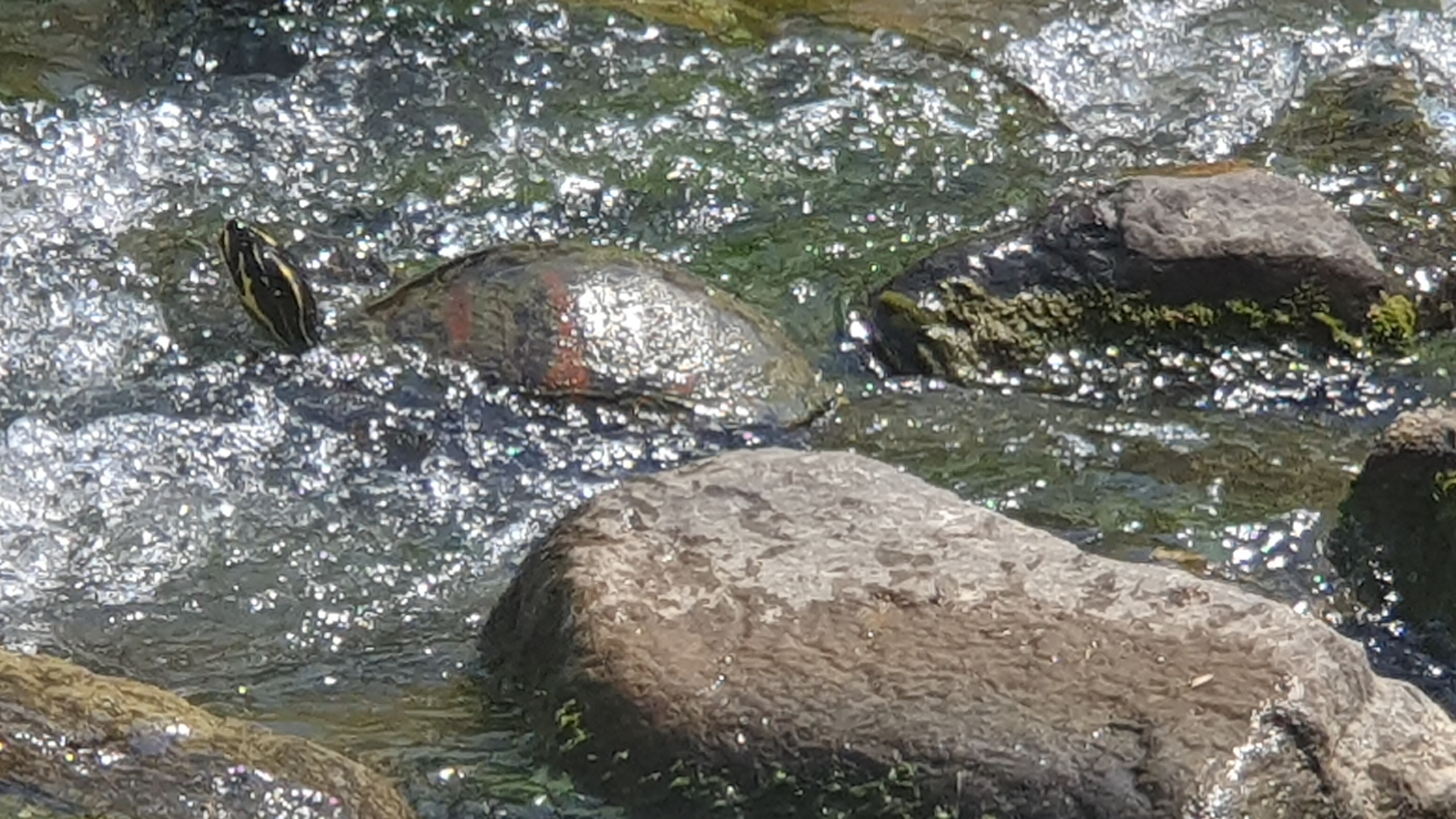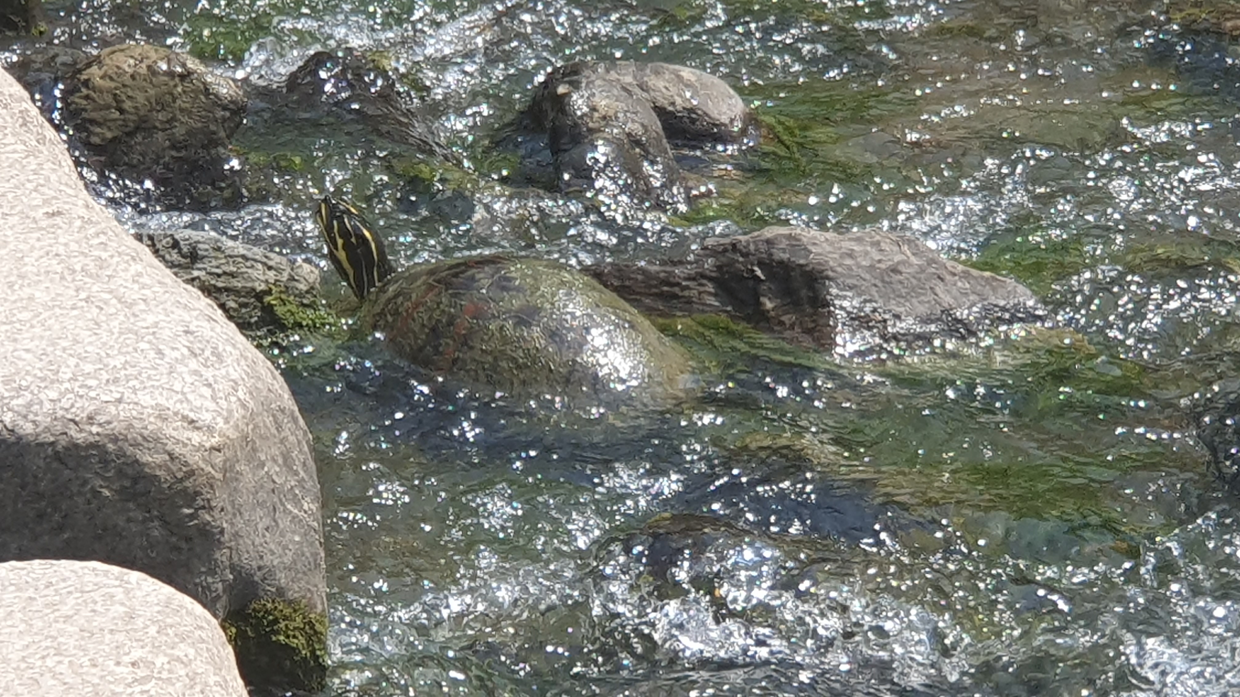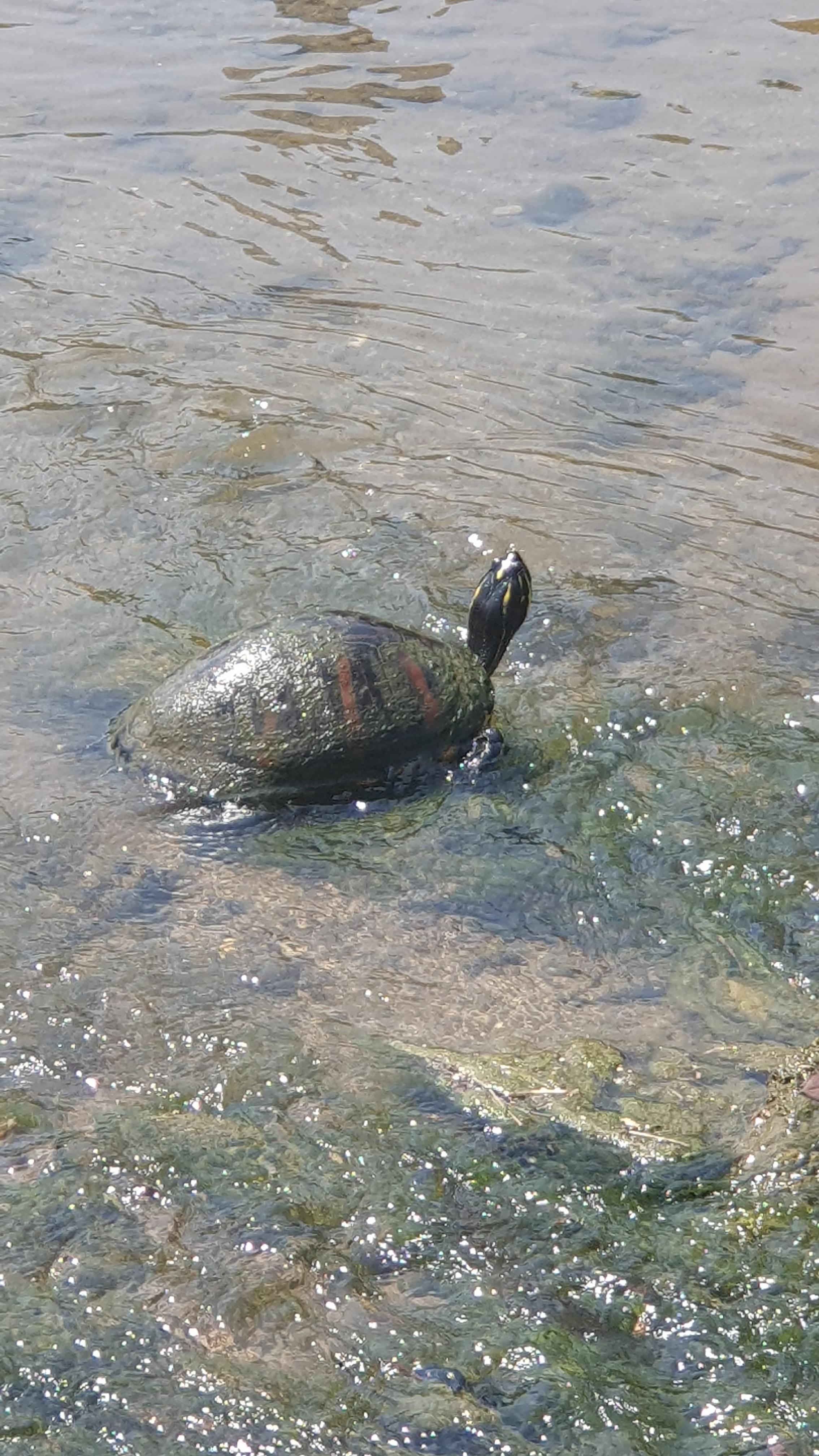 2023.06.18/ #도시기록 #거북 #안양 #학의천/ 안양 학운공원앞 학의천 돌다리를 건너다 커다란 거북이를 보다. 붉은줄 무늬 거북 아닌가싶다. 돌다리를 건너던중 음직이듯한 돌이 있어 다가가 보니 목이 쑥 나온다. 앗 거북이다. 학의천에서 본 녀석중 가장 큰 듯 싶고, 거북이나 자라를 보게되는 경우 인기척을 느끼면 물속으로 잽싸게 숨기에 이렇게 가까이서 보기도 처음이다.