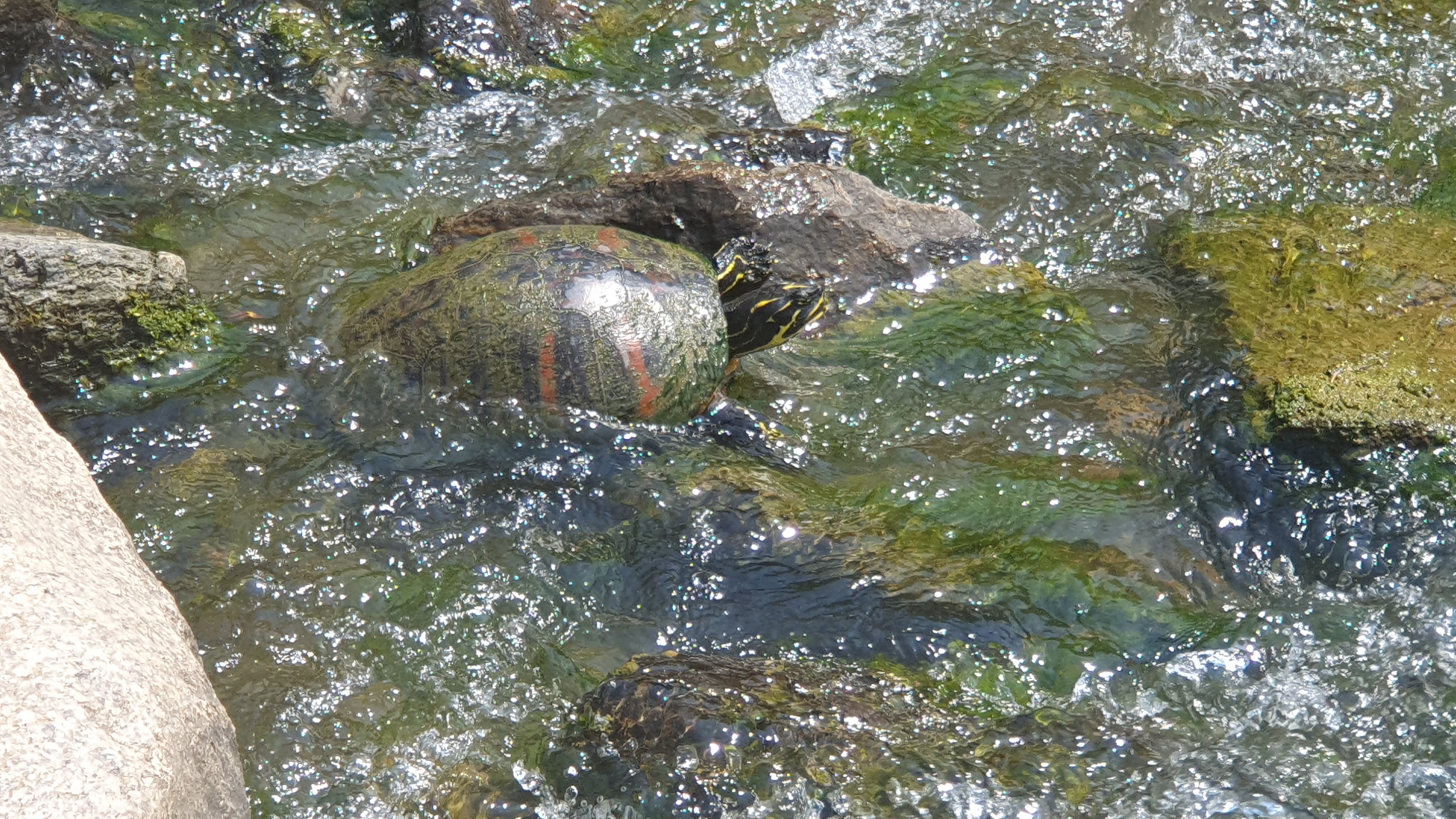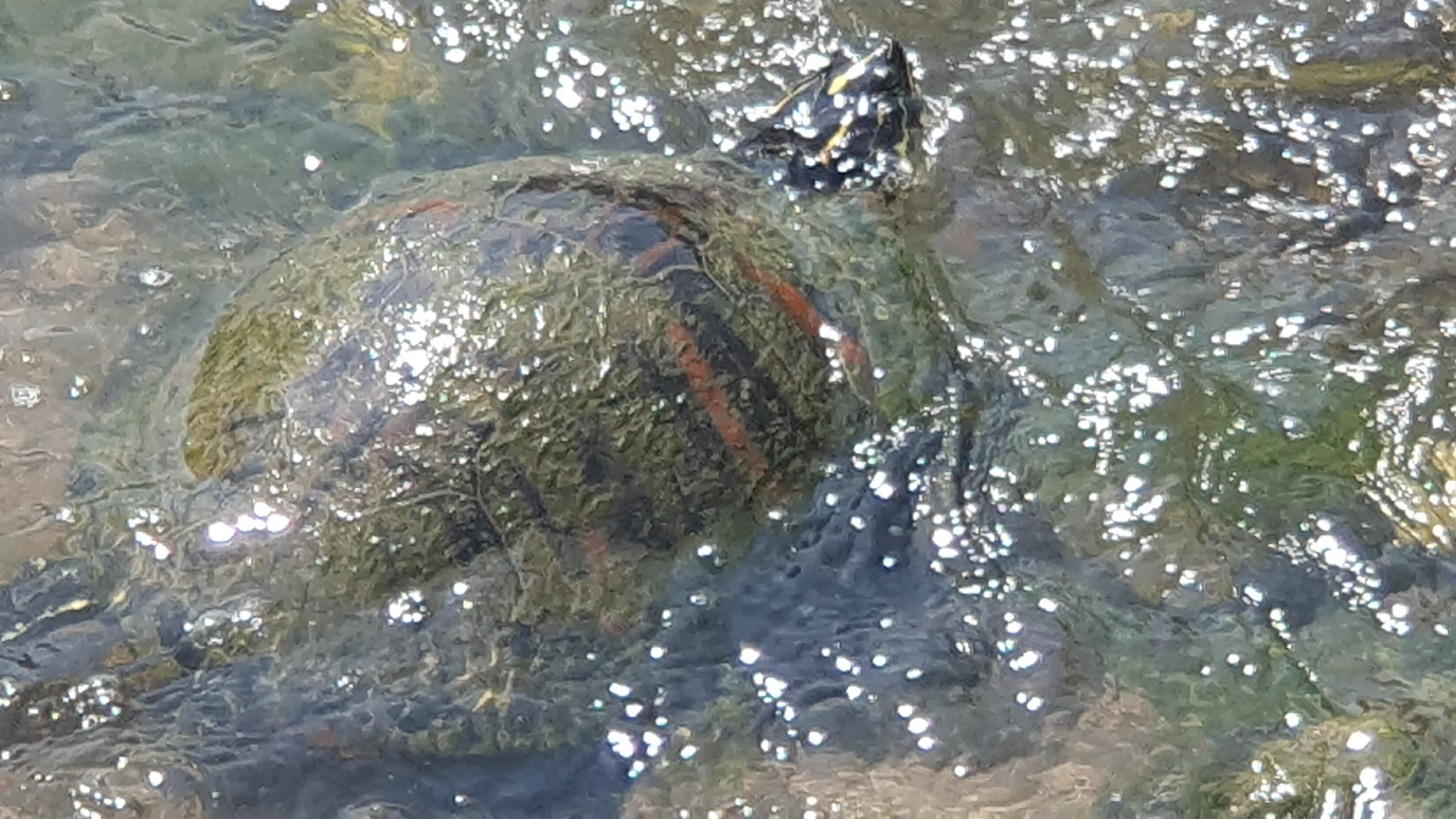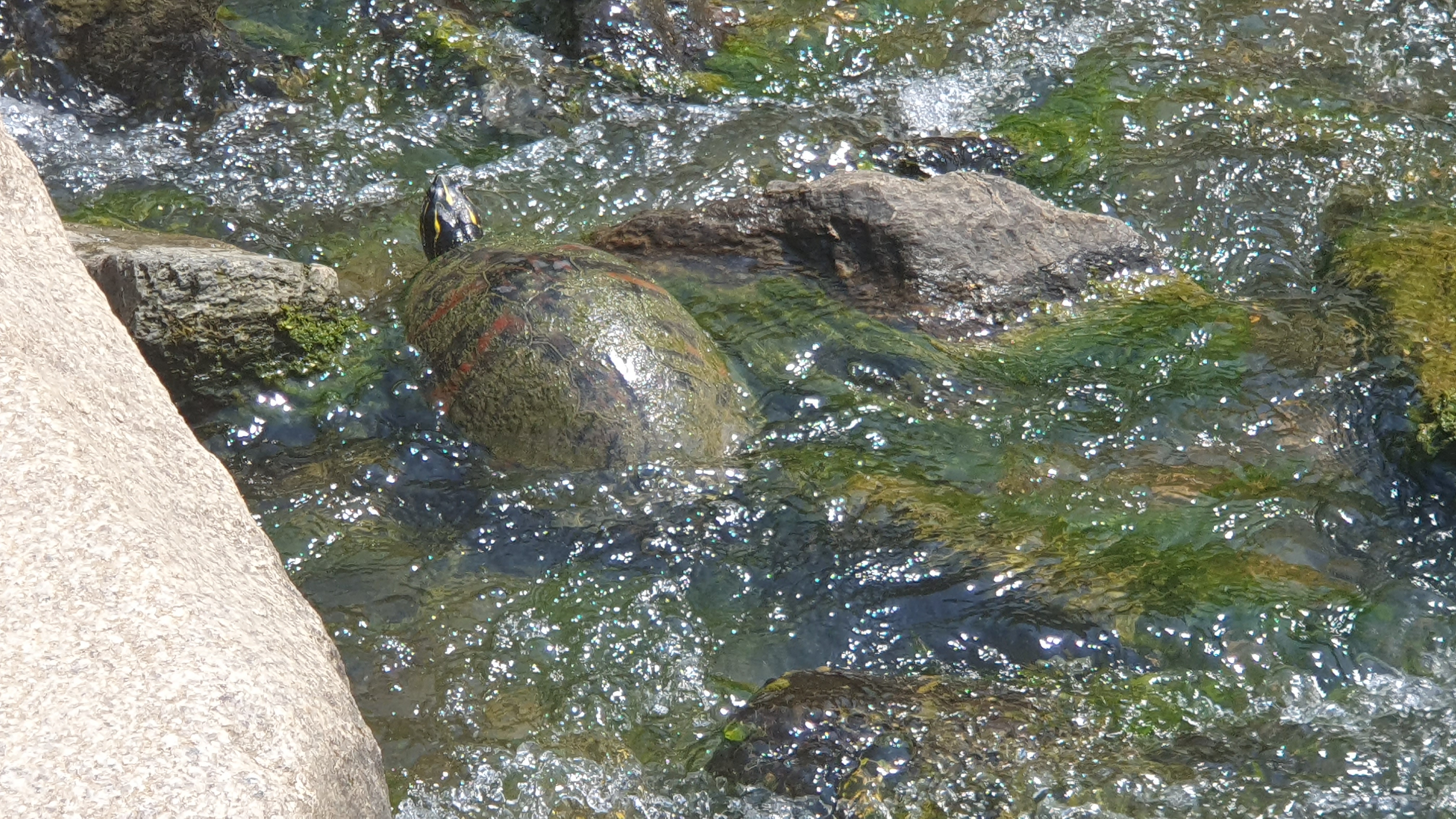 2023.06.18/ #도시기록 #거북 #안양 #학의천/ 안양 학운공원앞 학의천 돌다리를 건너다 커다란 거북이를 보다. 붉은줄 무늬 거북 아닌가싶다. 돌다리를 건너던중 음직이듯한 돌이 있어 다가가 보니 목이 쑥 나온다. 앗 거북이다. 학의천에서 본 녀석중 가장 큰 듯 싶고, 거북이나 자라를 보게되는 경우 인기척을 느끼면 물속으로 잽싸게 숨기에 이렇게 가까이서 보기도 처음이다.