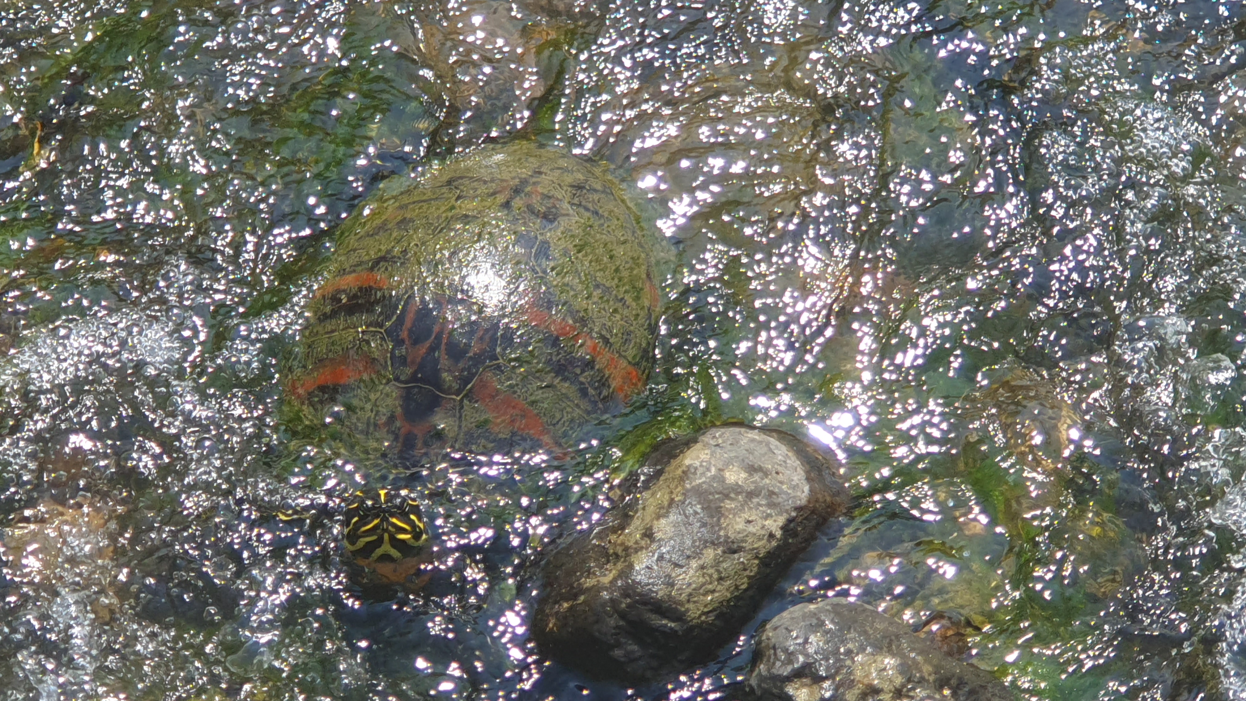 2023.06.18/ #도시기록 #거북 #안양 #학의천/ 안양 학운공원앞 학의천 돌다리를 건너다 커다란 거북이를 보다. 붉은줄 무늬 거북 아닌가싶다. 돌다리를 건너던중 음직이듯한 돌이 있어 다가가 보니 목이 쑥 나온다. 앗 거북이다. 학의천에서 본 녀석중 가장 큰 듯 싶고, 거북이나 자라를 보게되는 경우 인기척을 느끼면 물속으로 잽싸게 숨기에 이렇게 가까이서 보기도 처음이다.