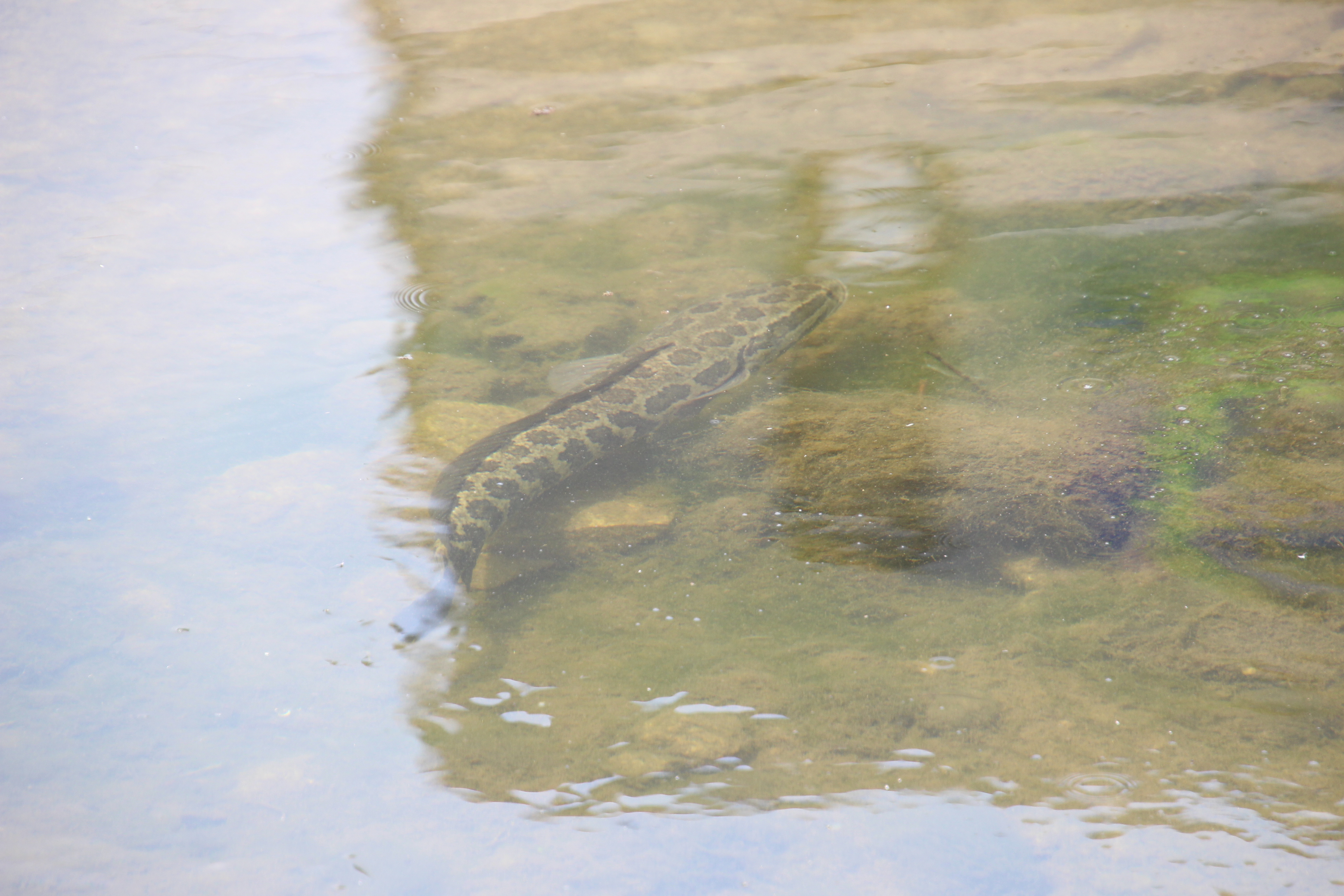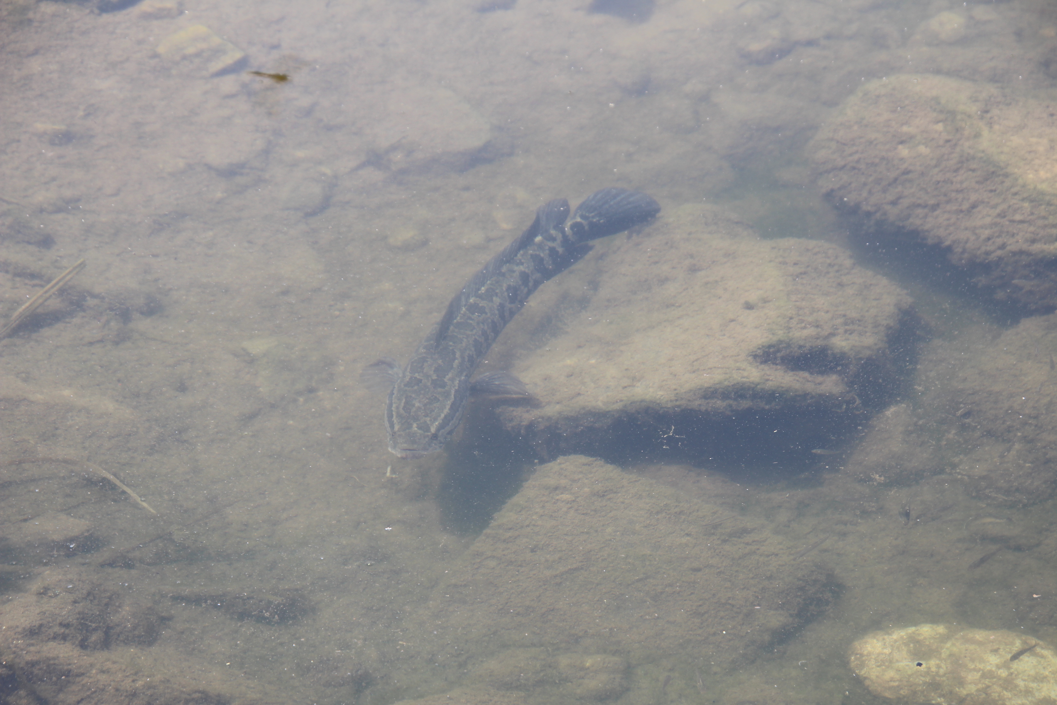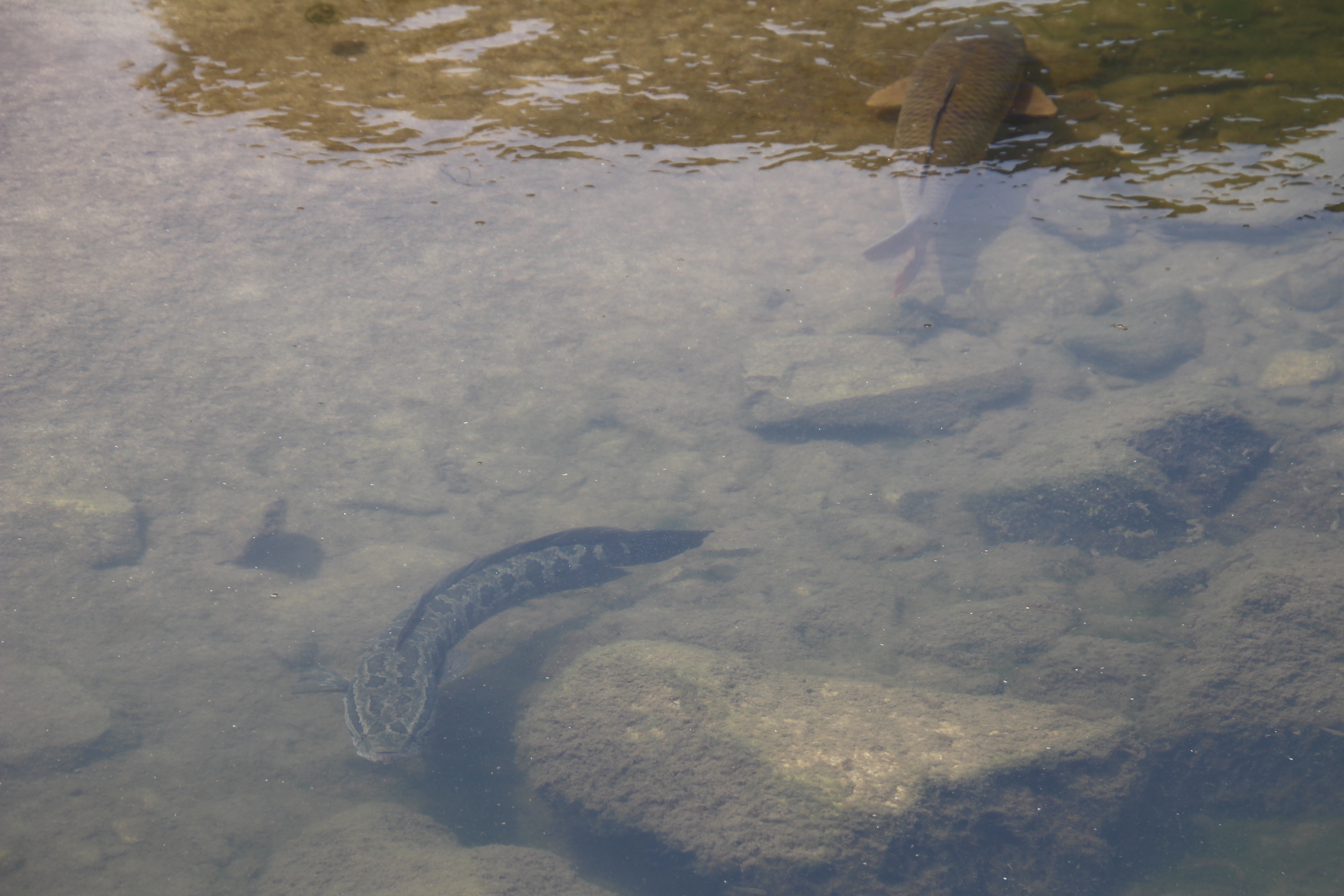 2023.06.19/ #도시기록 #가물치 #안양천/ 안양천에서 가물치를 발견하다. 안양시지속가능발젼협의회 안양천 공개 모니터링 중 군포교 다리밑 웅덩이에 다양한 종류의 고기들이 우글우글. 잉어 사이로 큼지막한 가물치가 꿈틀거린다. 송사리떼 사이로 색깔 화려한 열대어 구피도 있다.