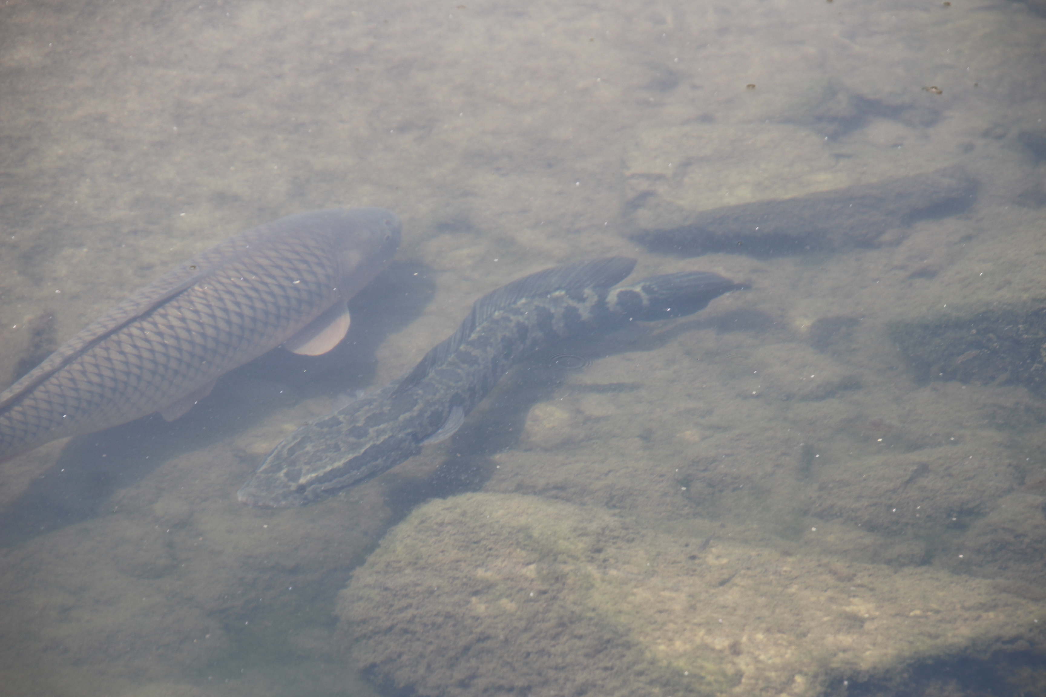 2023.06.19/ #도시기록 #가물치 #안양천/ 안양천에서 가물치를 발견하다. 안양시지속가능발젼협의회 안양천 공개 모니터링 중 군포교 다리밑 웅덩이에 다양한 종류의 고기들이 우글우글. 잉어 사이로 큼지막한 가물치가 꿈틀거린다. 송사리떼 사이로 색깔 화려한 열대어 구피도 있다.