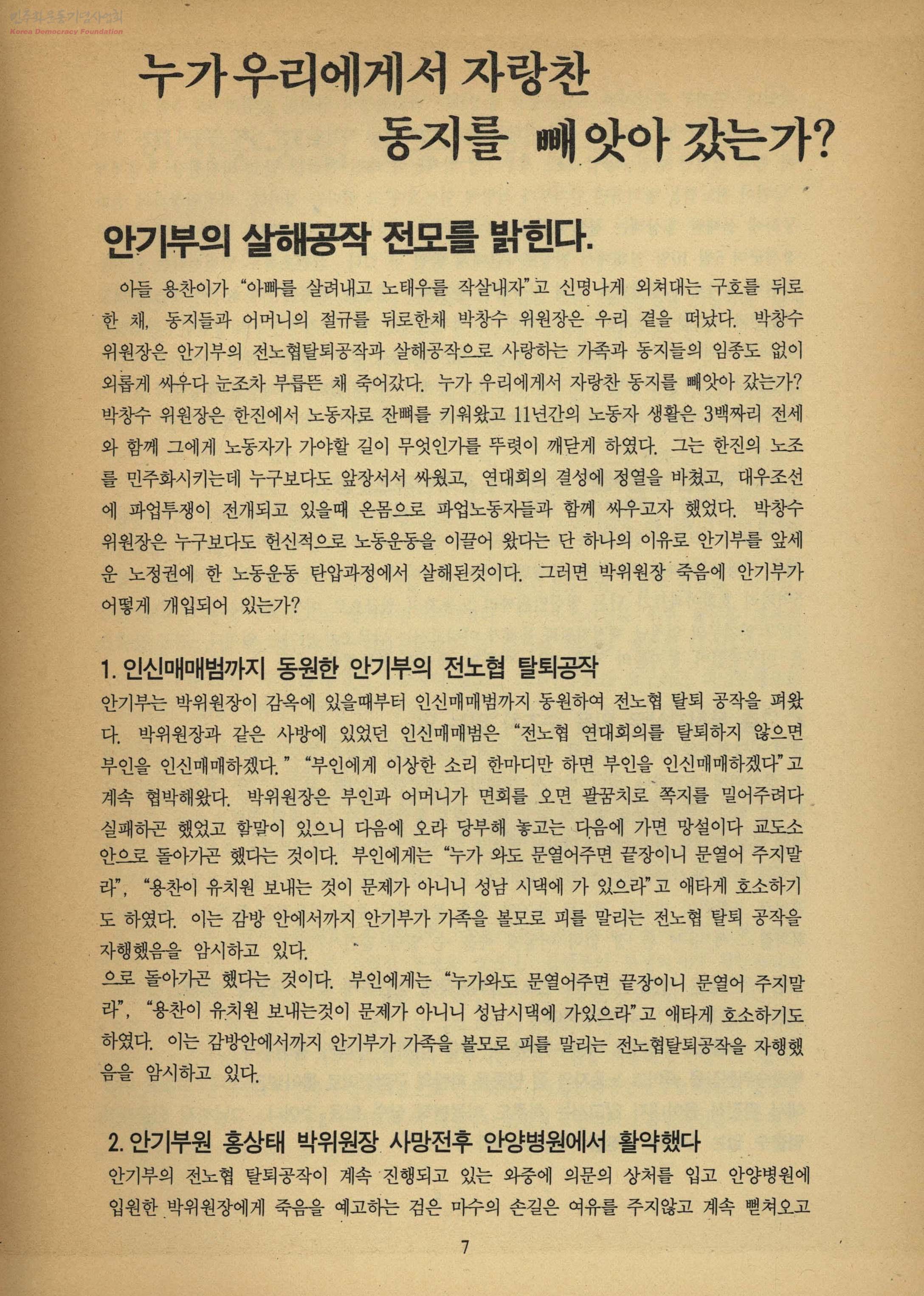 당시 안양, 군포, 의왕의 많은 노동자들이 안양병원에 몰려가 진상규명을 요구하며 농성을 진행했다. 그러나 경찰은 영안실 벽을 해머와 망치로 뚫고 들어와 시신을 탈취, 강제부검 후 자살로 결론을 내리고 사건을 종결, 노동계의 반발을 샀다.