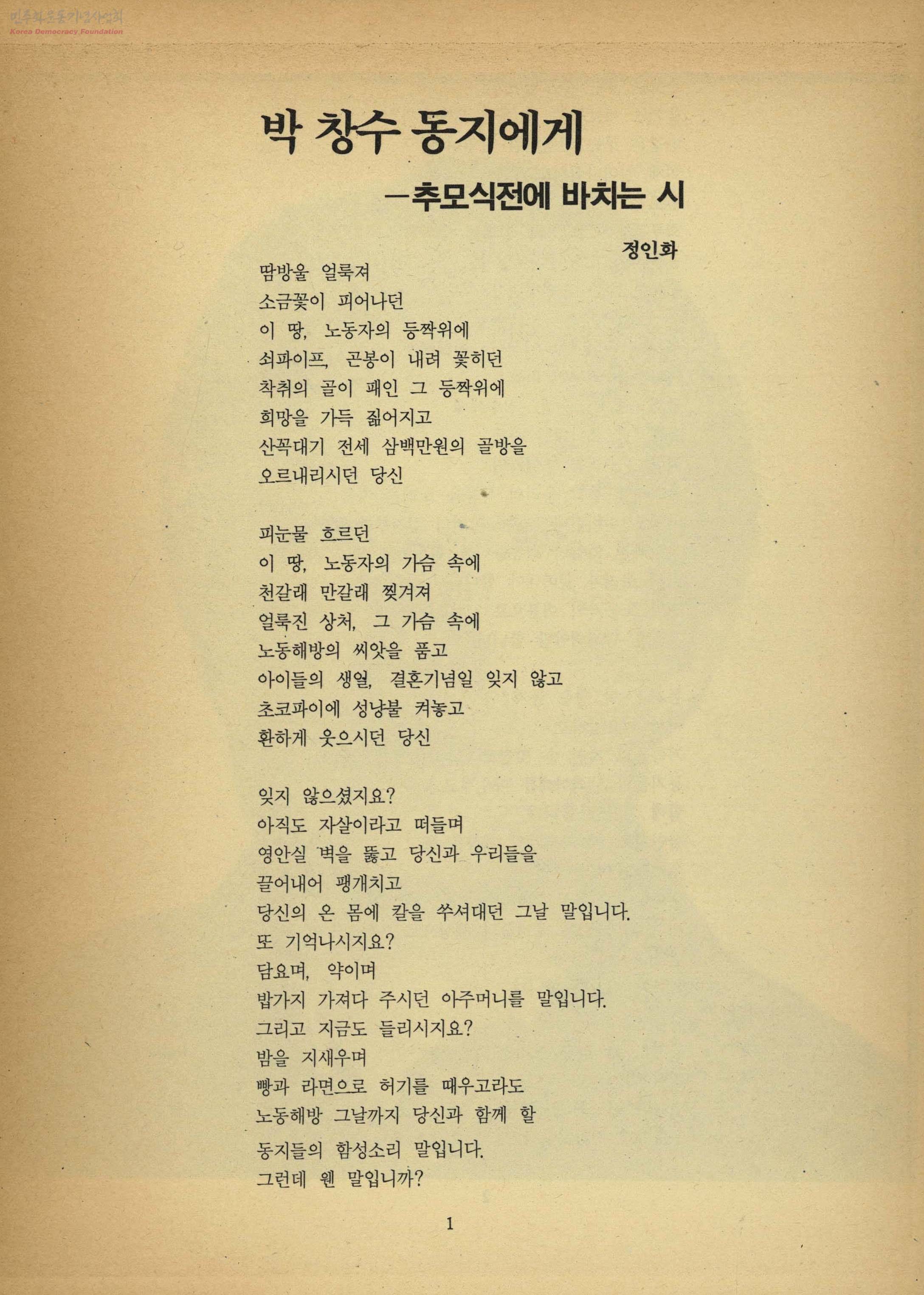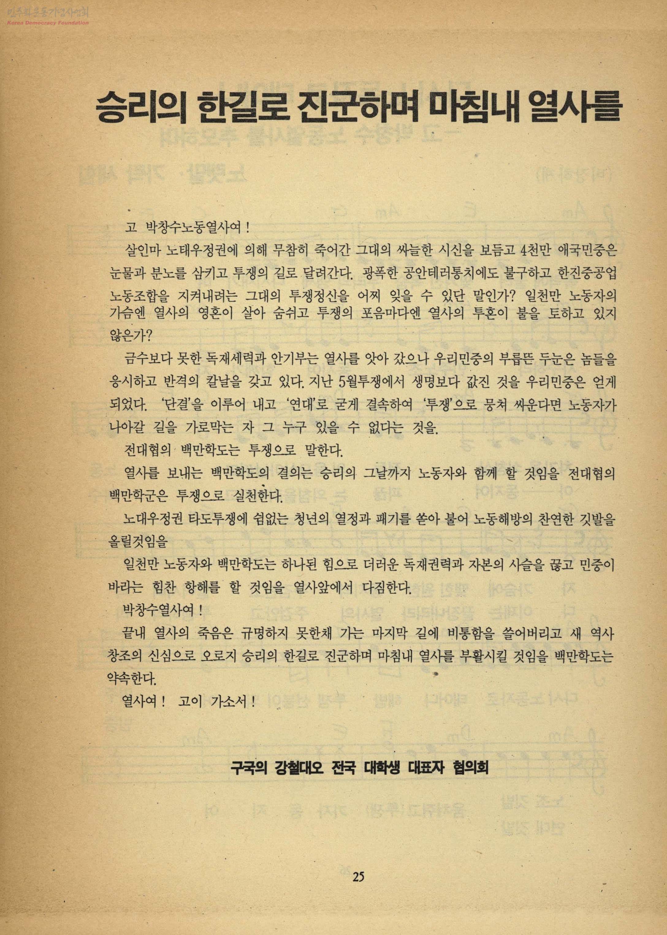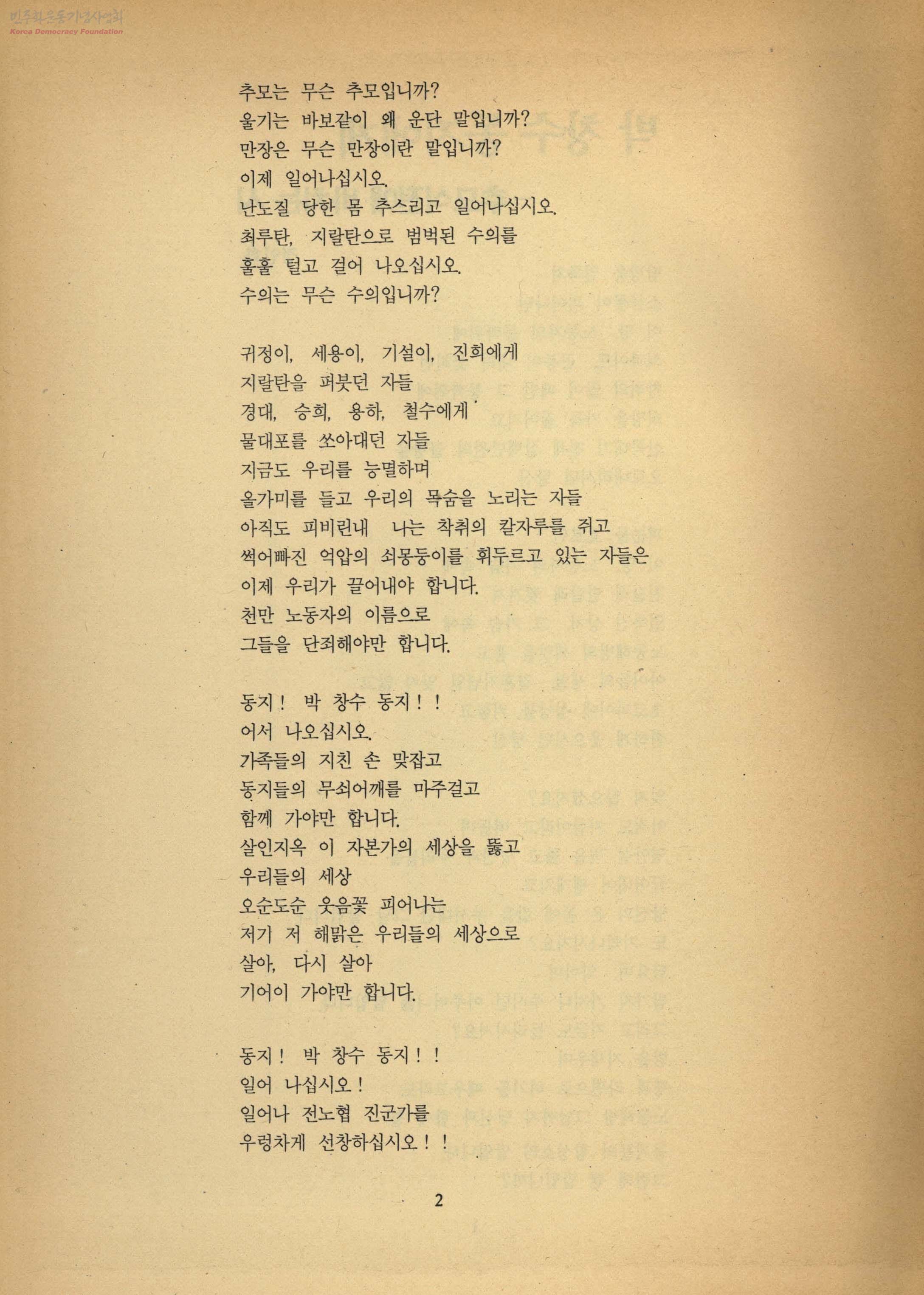 재벌의 나라에 가난한 노동자로 태어나/인간답게 살기를 염원하던 사람/폭압의 세월에 목숨 바쳐 '전노협'을 지키고/죽어서도 투쟁의 깃발 높지 않은 노동자/살아오라 열사여!/천만 노동자의 가슴 속 노동해방의 불꽃으로."