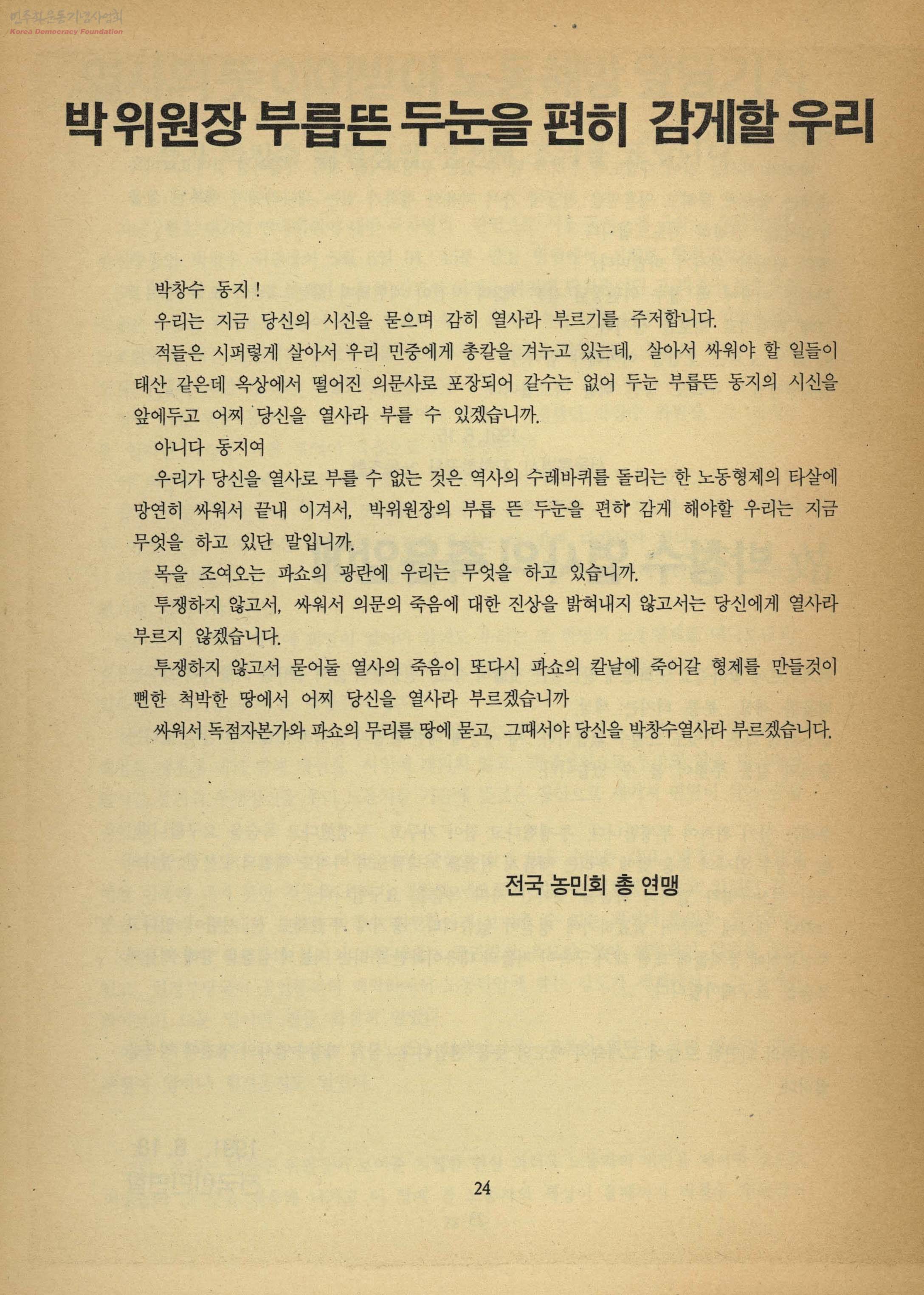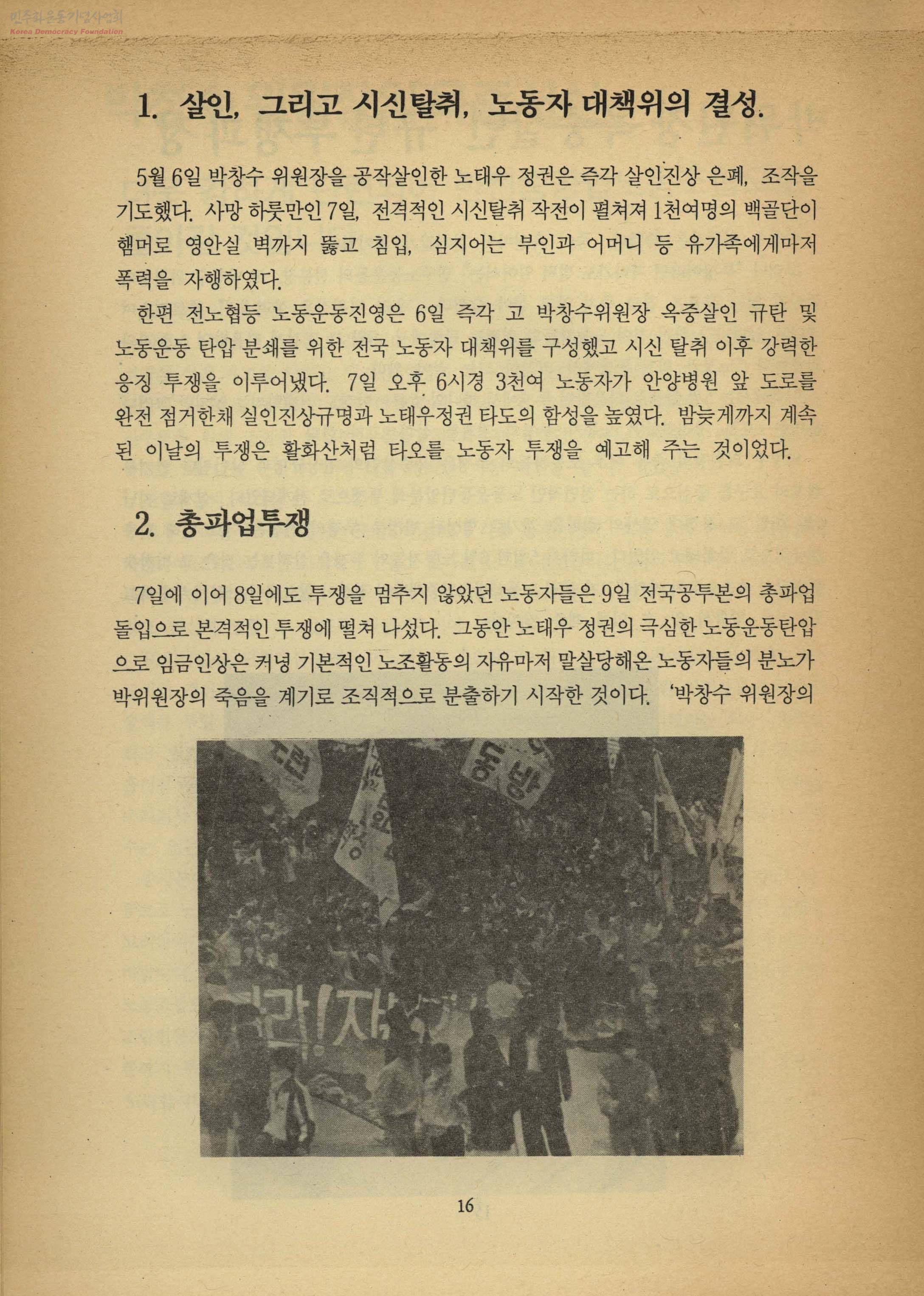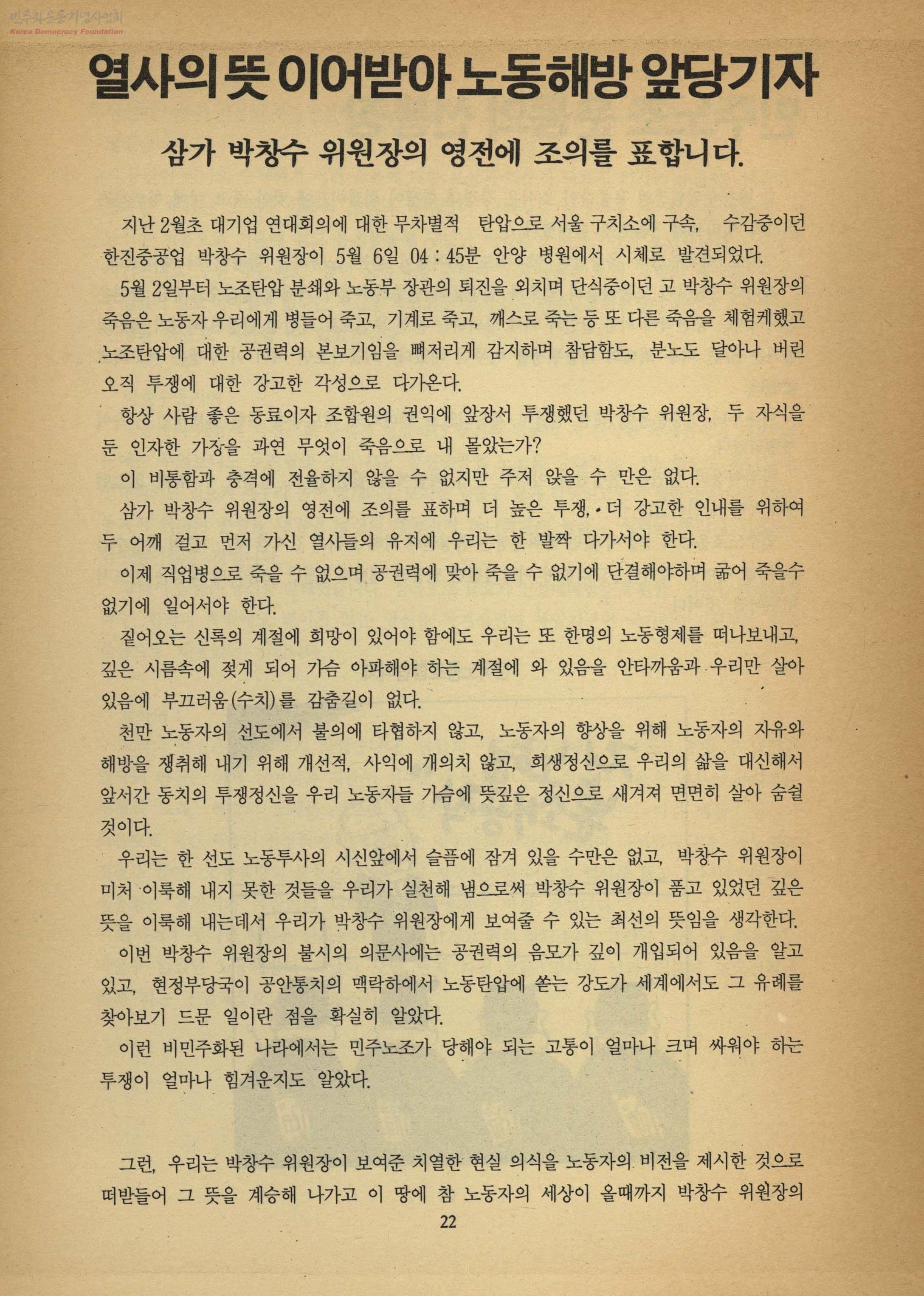 재벌의 나라에 가난한 노동자로 태어나/인간답게 살기를 염원하던 사람/폭압의 세월에 목숨 바쳐 '전노협'을 지키고/죽어서도 투쟁의 깃발 높지 않은 노동자/살아오라 열사여!/천만 노동자의 가슴 속 노동해방의 불꽃으로."