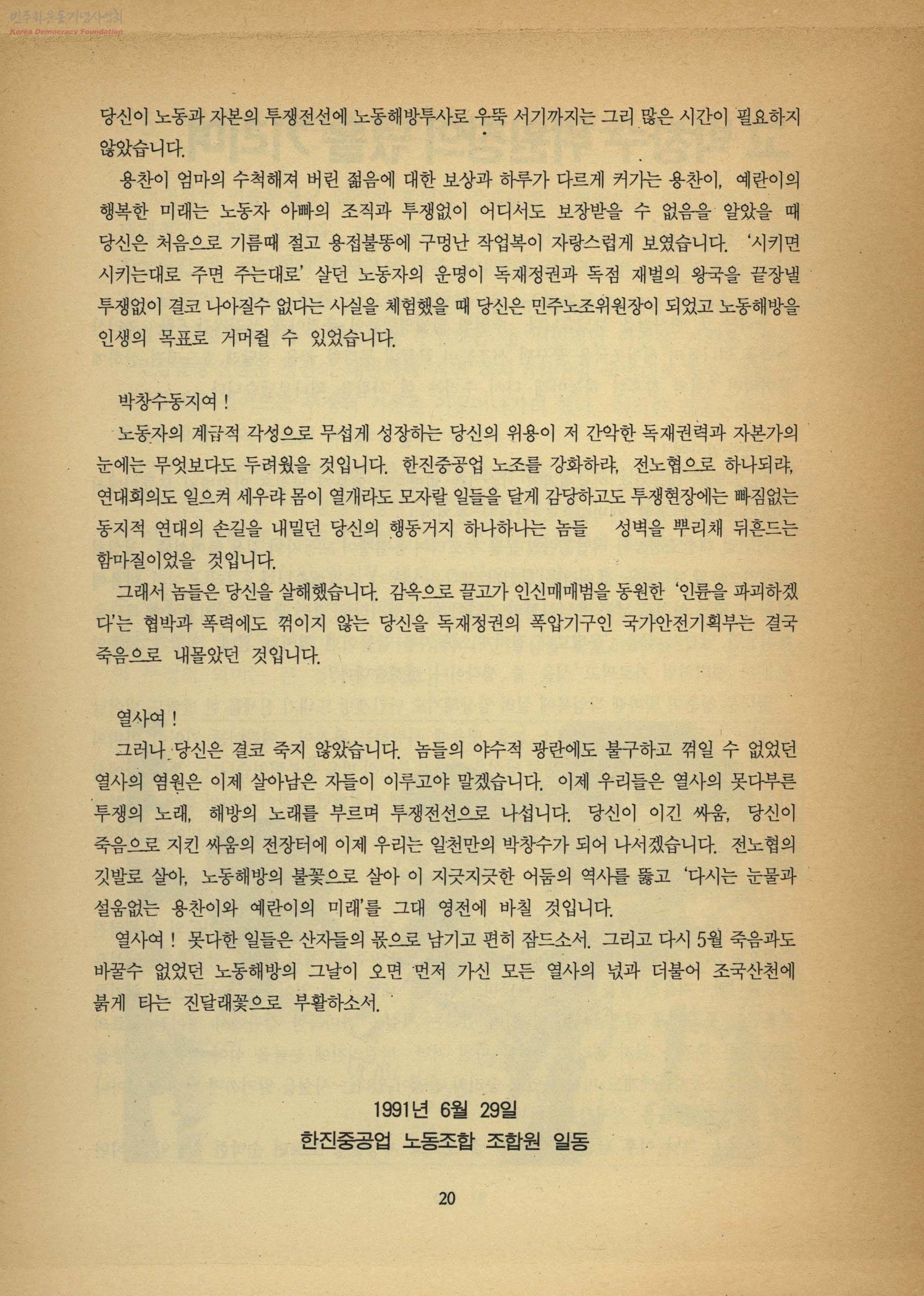 고 박창수 열사는 부산기계공고를 나와 1981년 한진중공업의 전신인 대한조선공사에 배관공으로 입사했다. 고인은 1990년 한진중공업노동조합 위원장과 부산지역노동조합연합(부산노련) 부의장을 지냈고, 이듬해인 1991년 2월 구속돼 서울구치소에 되었다.