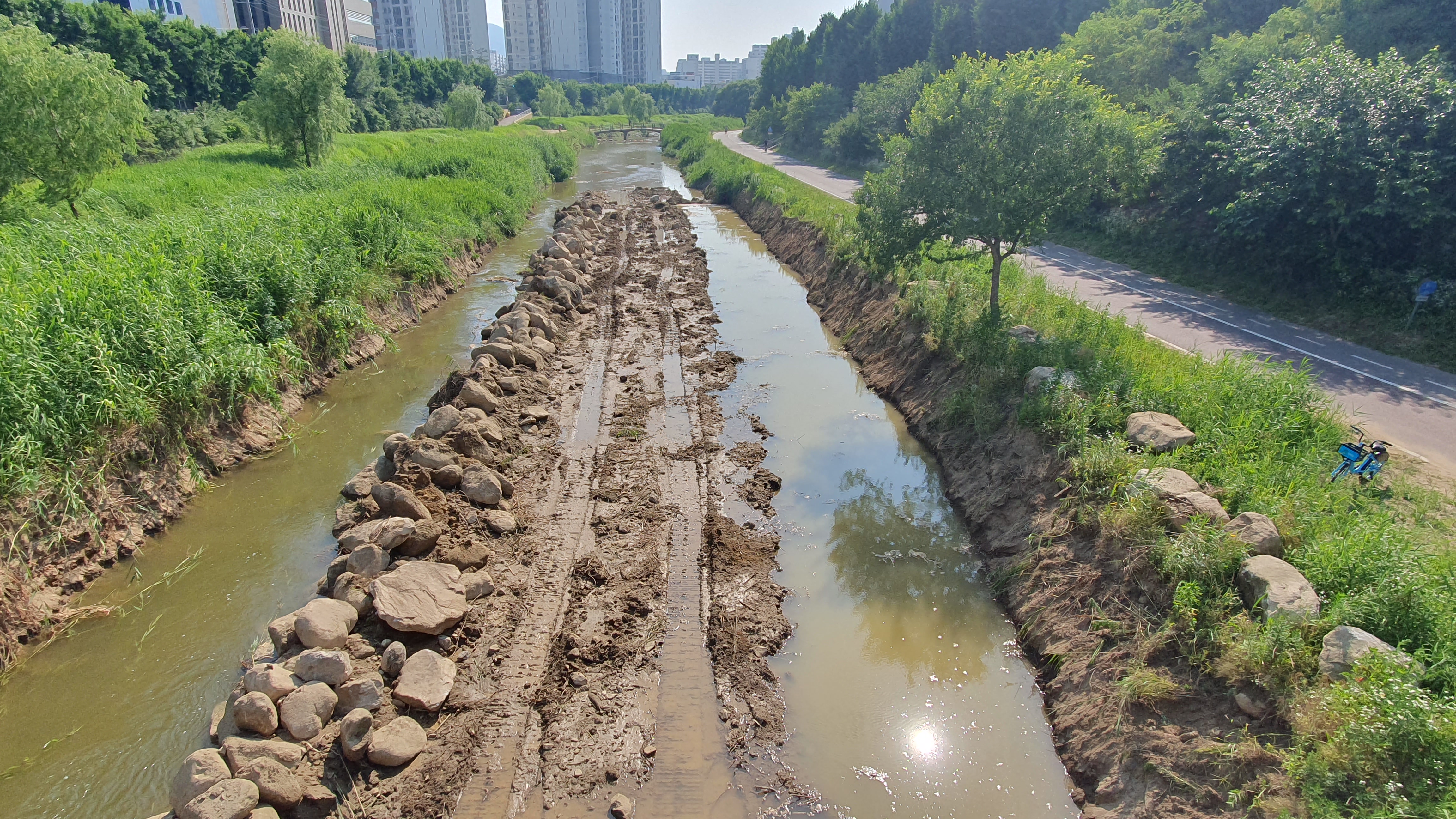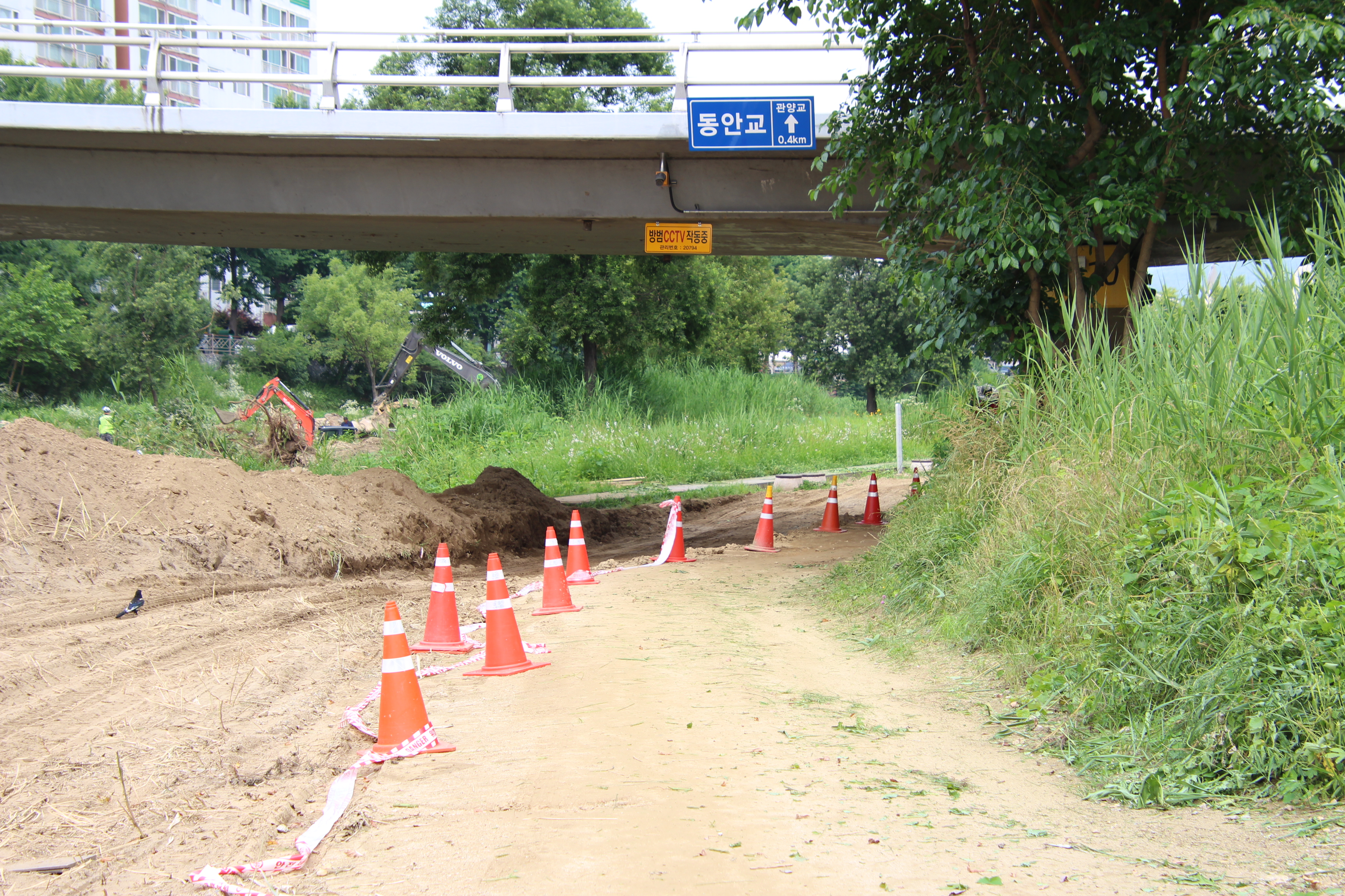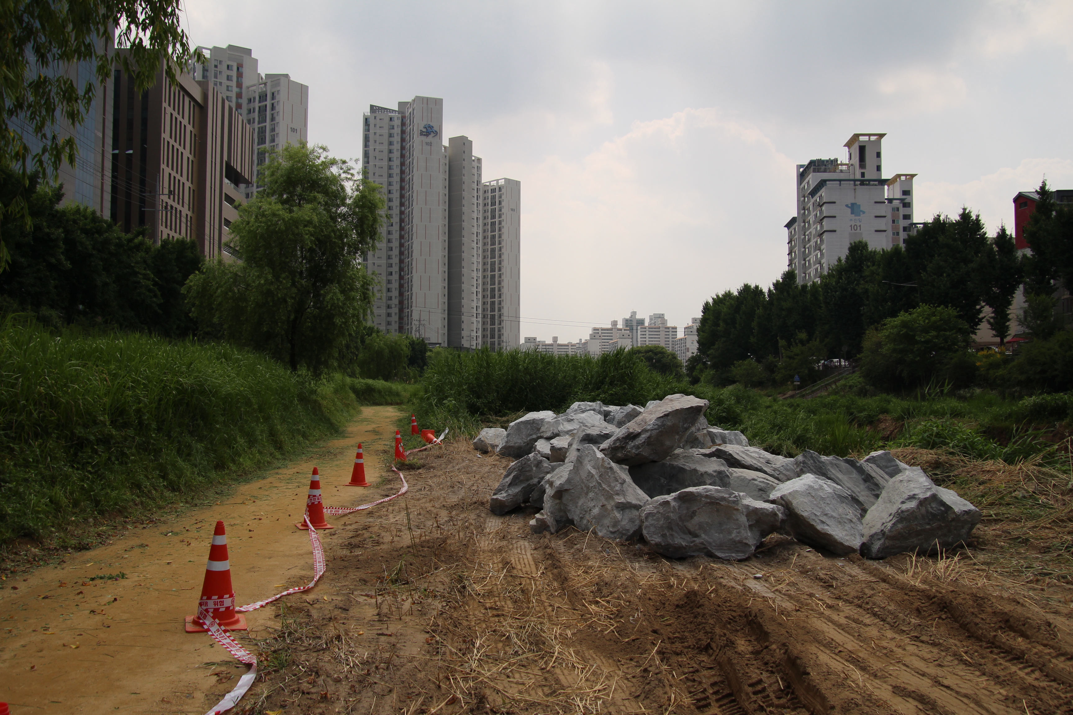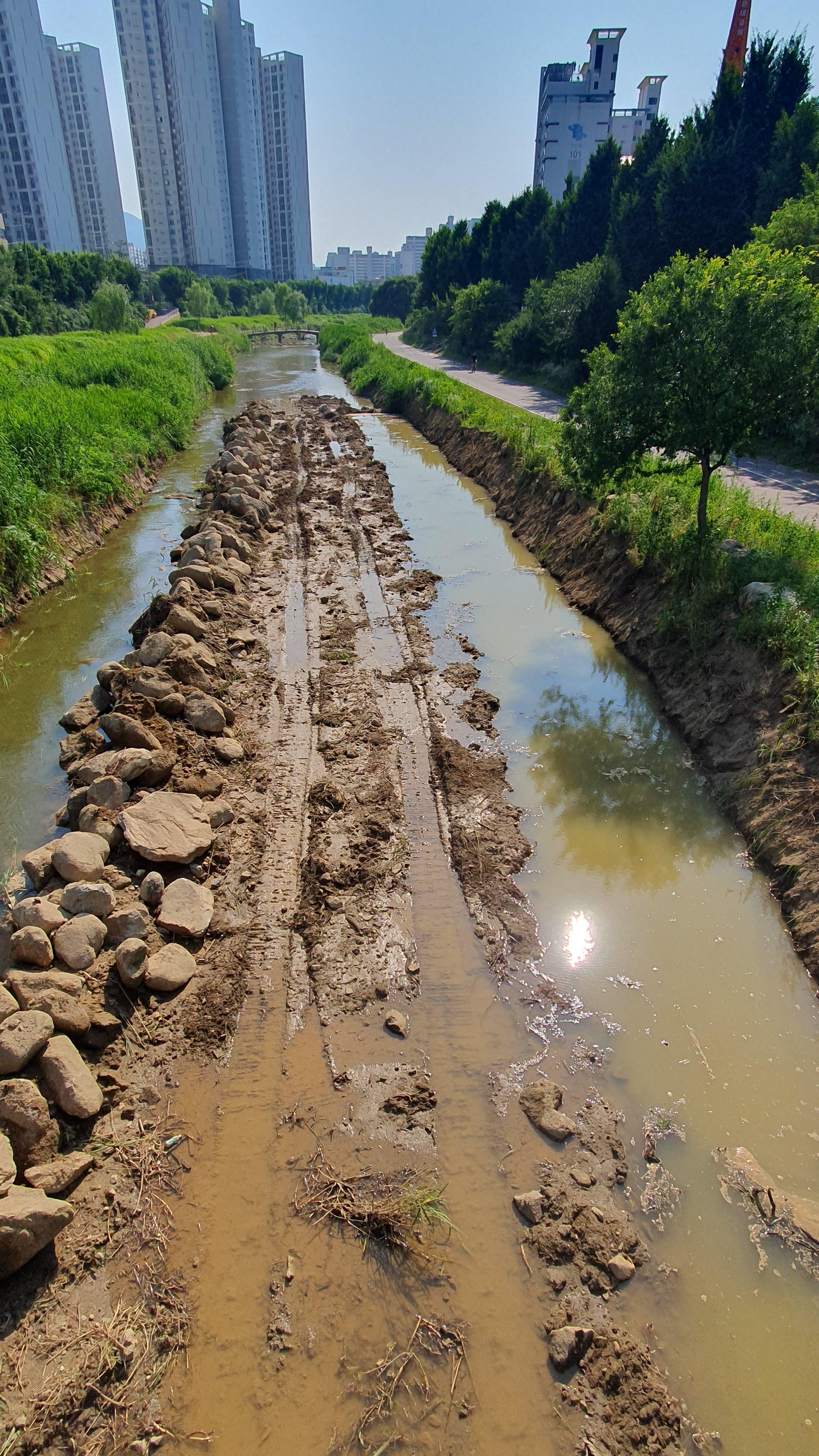 2023.06.24/ #도시기록 #안양 #학의천/ 안양 학의천(동안교 주변지역)은 지금 공사중. 장마를 코앞에 두고 천변 둔치에 돌 쌓기가 한창이다.