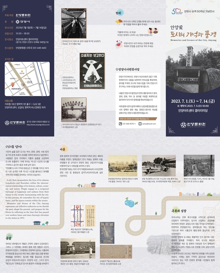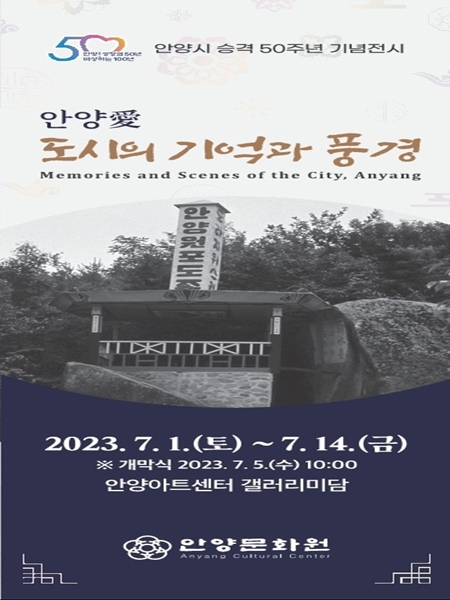 안양문화원이 금년도 안양시 승격 50주년을 맞아 문화원 안양시사편찬위원회에서 수집하고 연구한 사진과 도면, 도서, 동영상 등의 자료를 기반으로 "안양애 도시의 기억과 풍경"전을 개최했다. 이번 전시는 1973년 전후의 시기부터 현재의 안양시가 있기까지의 성장 스토리를 도시의 기억과 풍경에 담아냈다. 전시회는 7월 1일부터 14일까지 안양아트센터 갤러리 미담에서 열리며 개막식은 7월5일 10시에 갖는다.