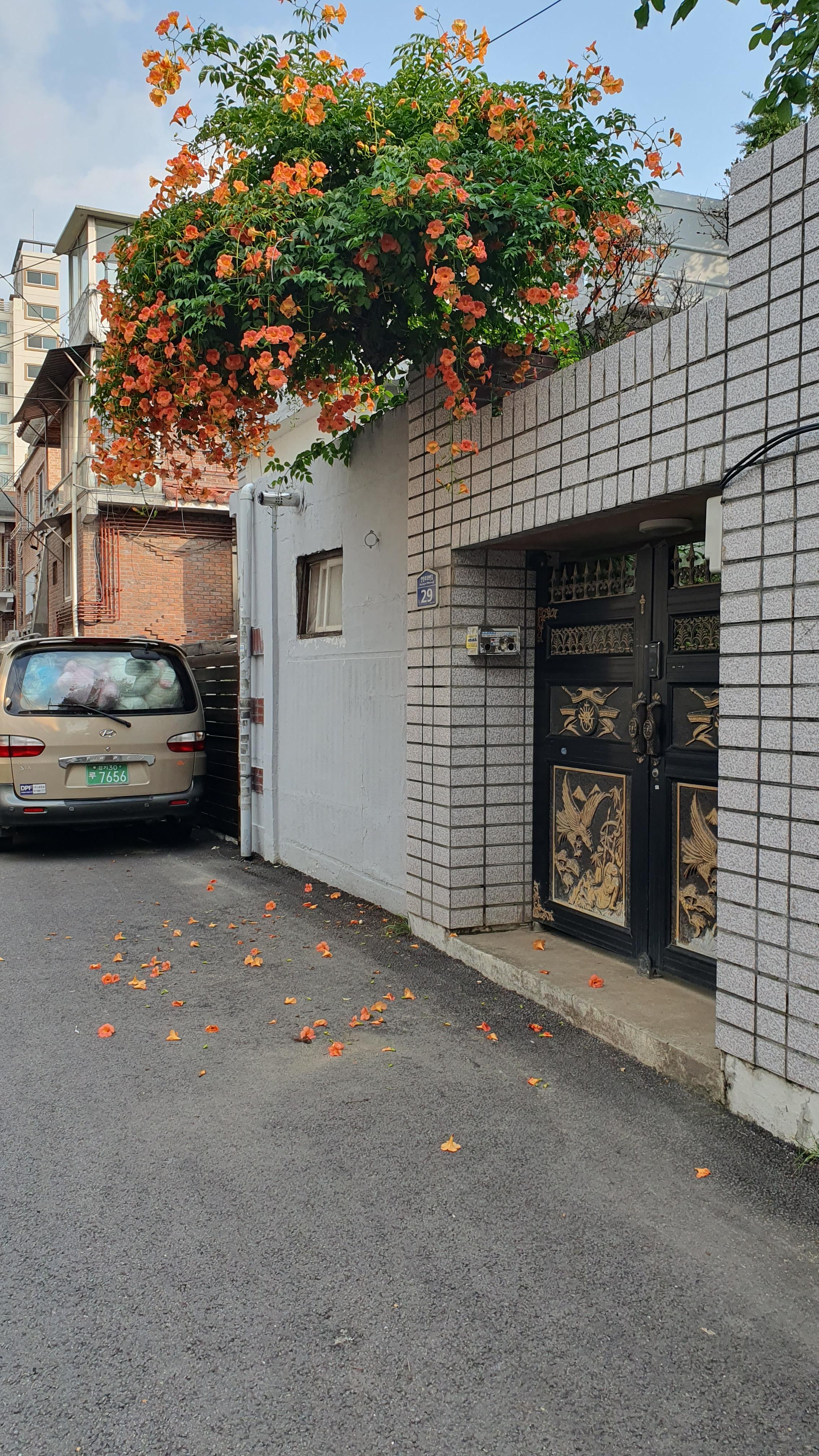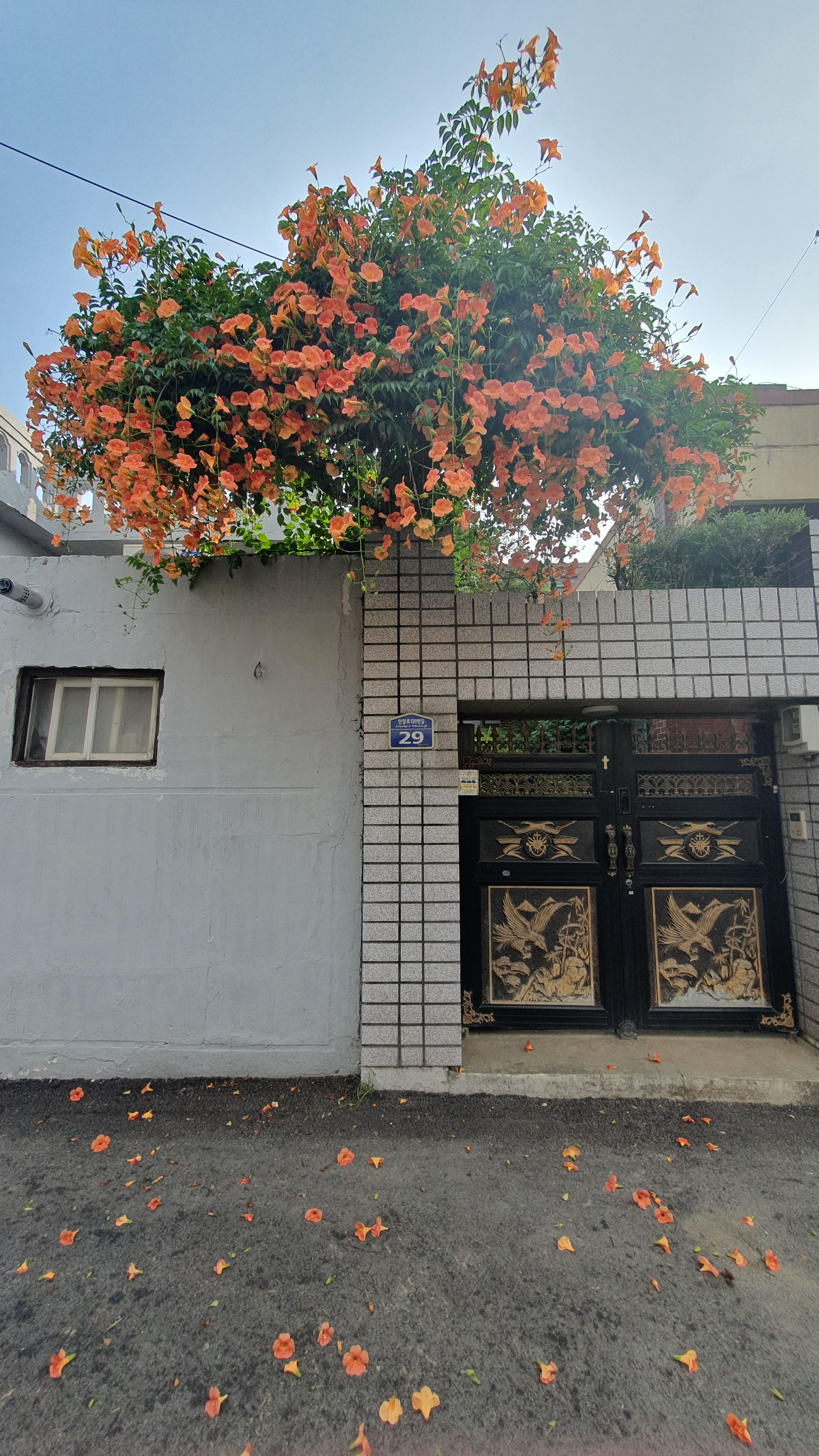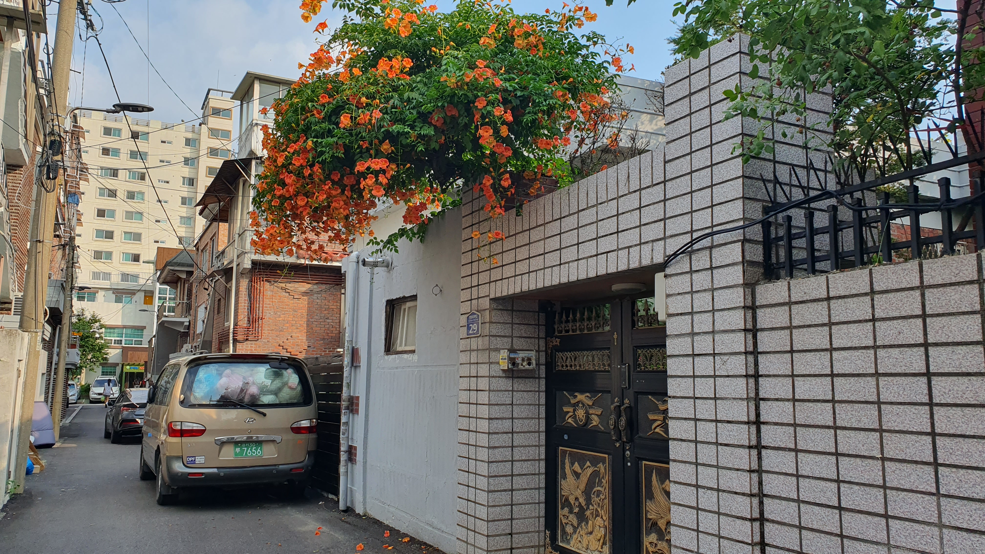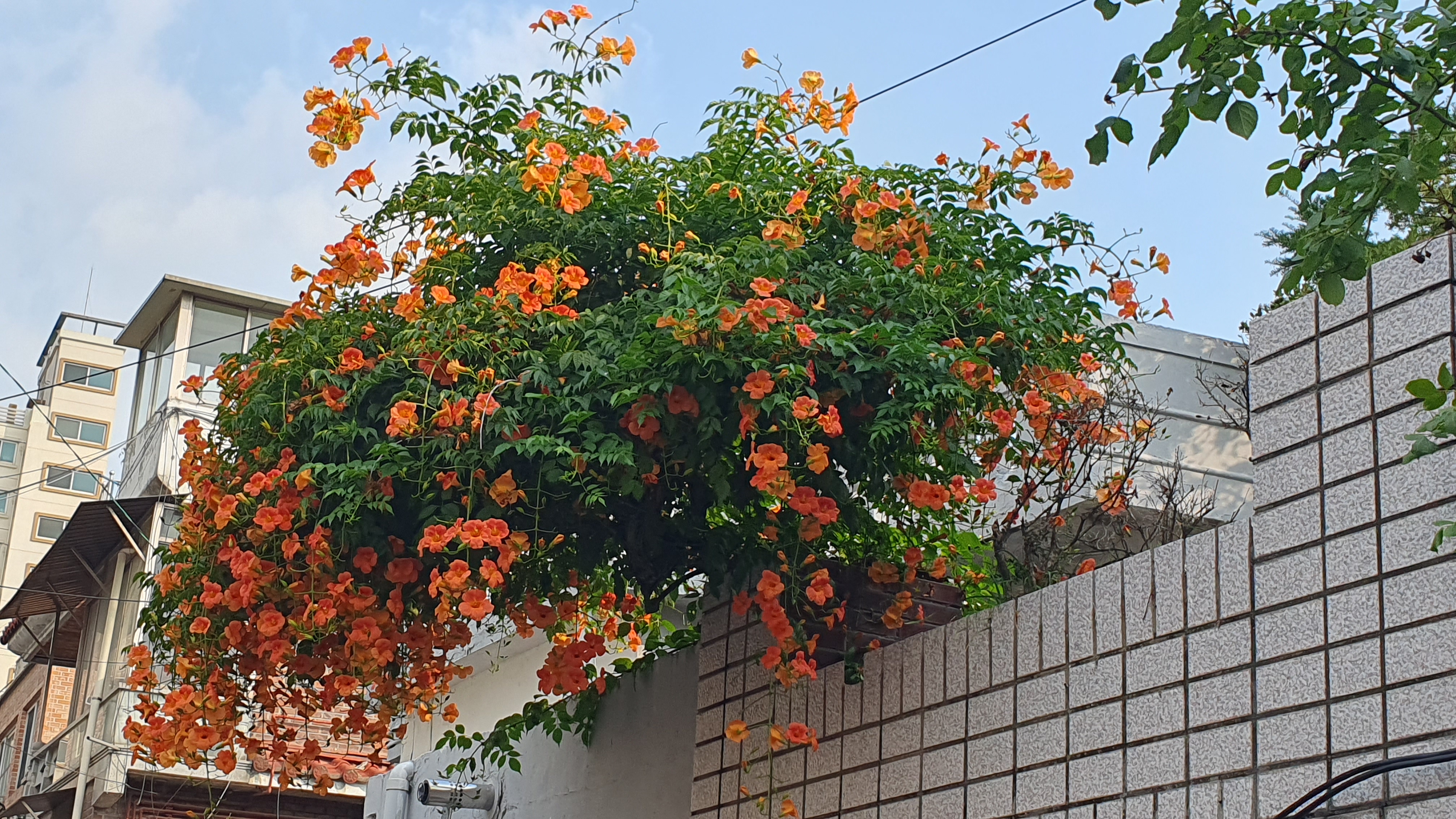 2023.07.03/ #도시기록 #능소화 #안양 #동네 #골목/ 안양6동 골목길(안양6동 안양로 139번길) 풍경. 여름꽃 능소화가 지난해(2022년에는 8월4일 만개)보다 일찍 활짝 피었네요. 담장 밖으로 고개를 내밀고 인사를 하는 주황색 능소화 꽃들의 유혹에 오가던 주민들이 발걸음을 멈추고 다시 돌아와서 사진을 찍을 정도로 골목이 아주 화사합니다.