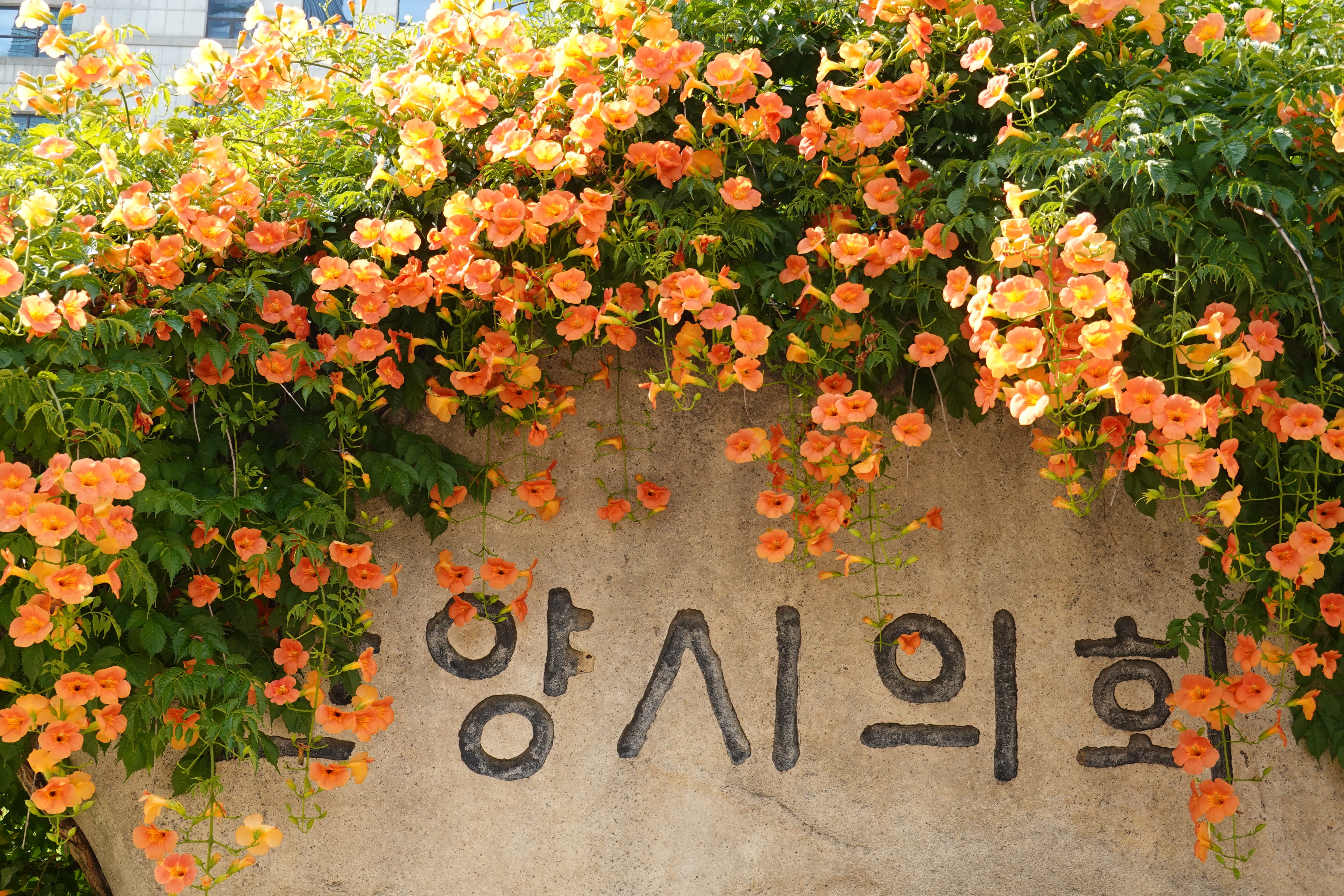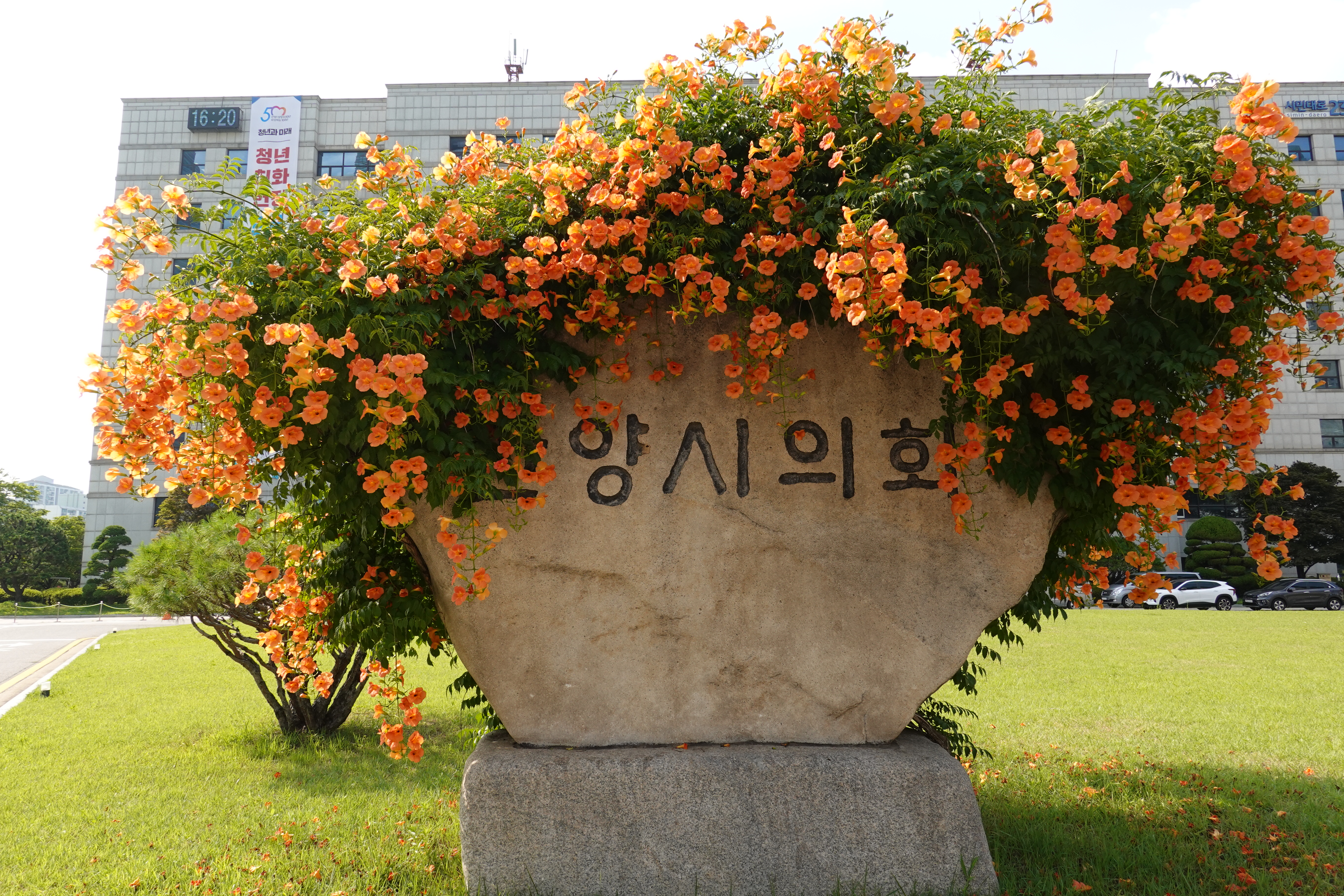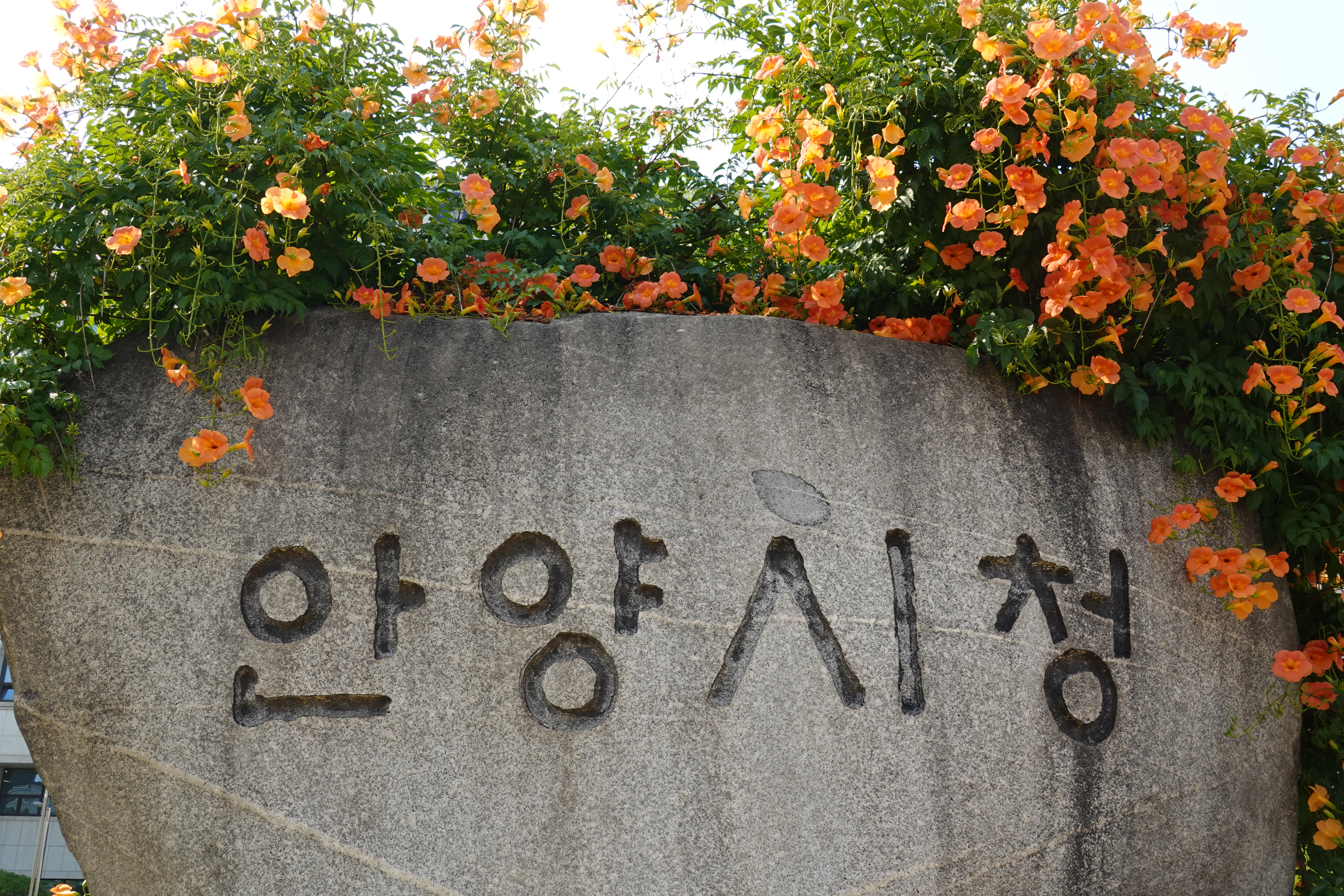 2023.07.03/ #도시기록 #안양시청 #눙소화 #여름꽃/ 매년 능소화가 멋지게 피는 곳 안양시청앞 마당의 시청.시의회 표지석