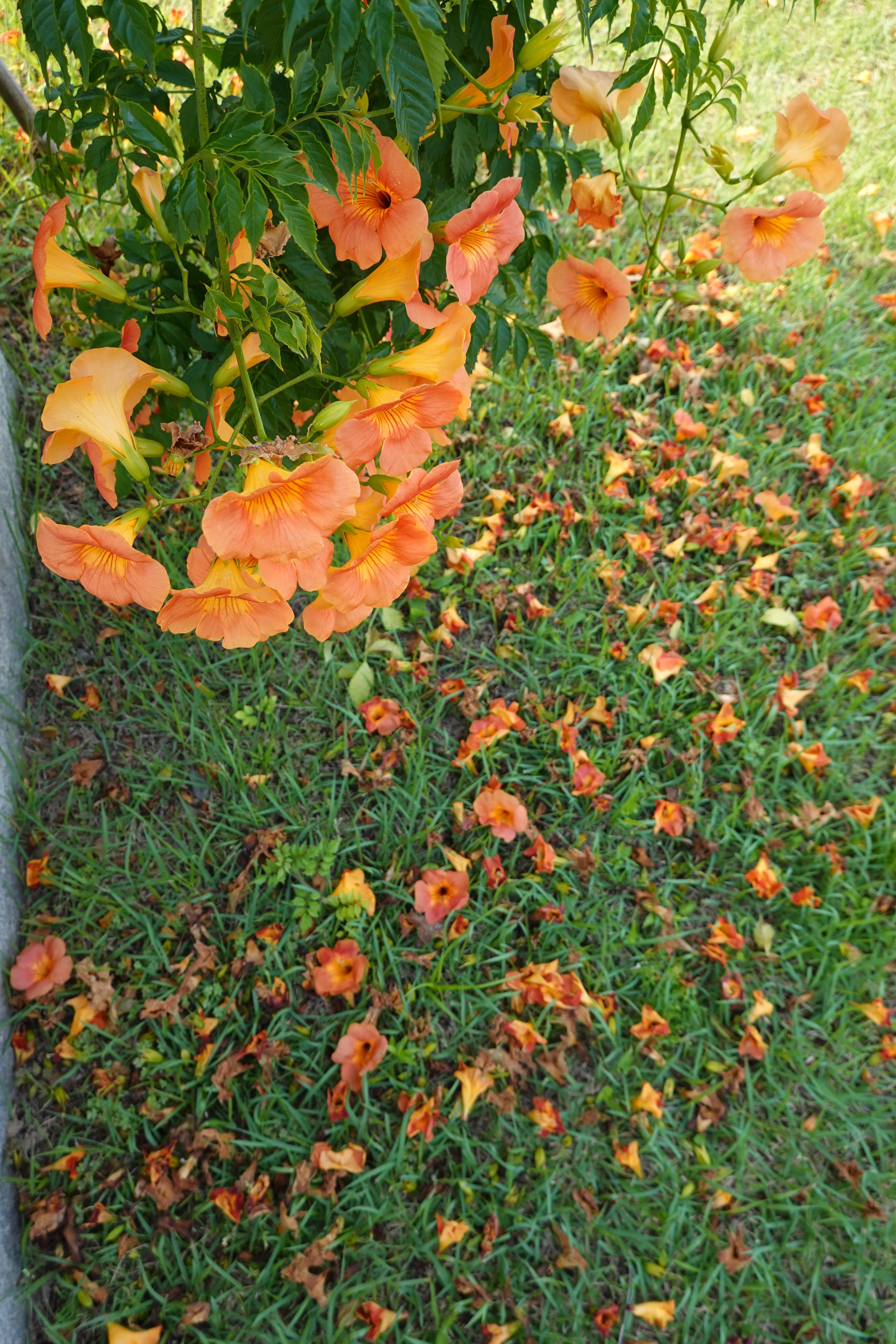 꽃은 그냥 주황색이라기보다 노란빛이 많이 들어간 붉은빛이다. 화려하면서도 정갈한 느낌이 든다. 다섯 개의 꽃잎이 얕게 갈라져 있어서 정면에서 보면 작은 나팔꽃 같다. 옆에서 보면 깔때기 모양의 기다란 꽃통의 끝에 꽃잎이 붙어 있어서 짧은 트럼펫이 연상된다. 꽃이 질 때는 꽃잎이 하나하나 떨어져 날아가 버리는 보통의 꽃과는 달리 동백꽃처럼 통째로 떨어진다. 그래서 시골에서는 흔히 처녀꽃이란 이름으로도 불려진다. 꽃은 감질나게 한두 개씩 피지 않고 원뿔모양의 꽃차례에 붙어 한창 필 때는 잎이 보이지 않을 정도로 많이 핀다. 한번 피기 시작하면 거의 초가을까지 피고 지고를 이어간다.