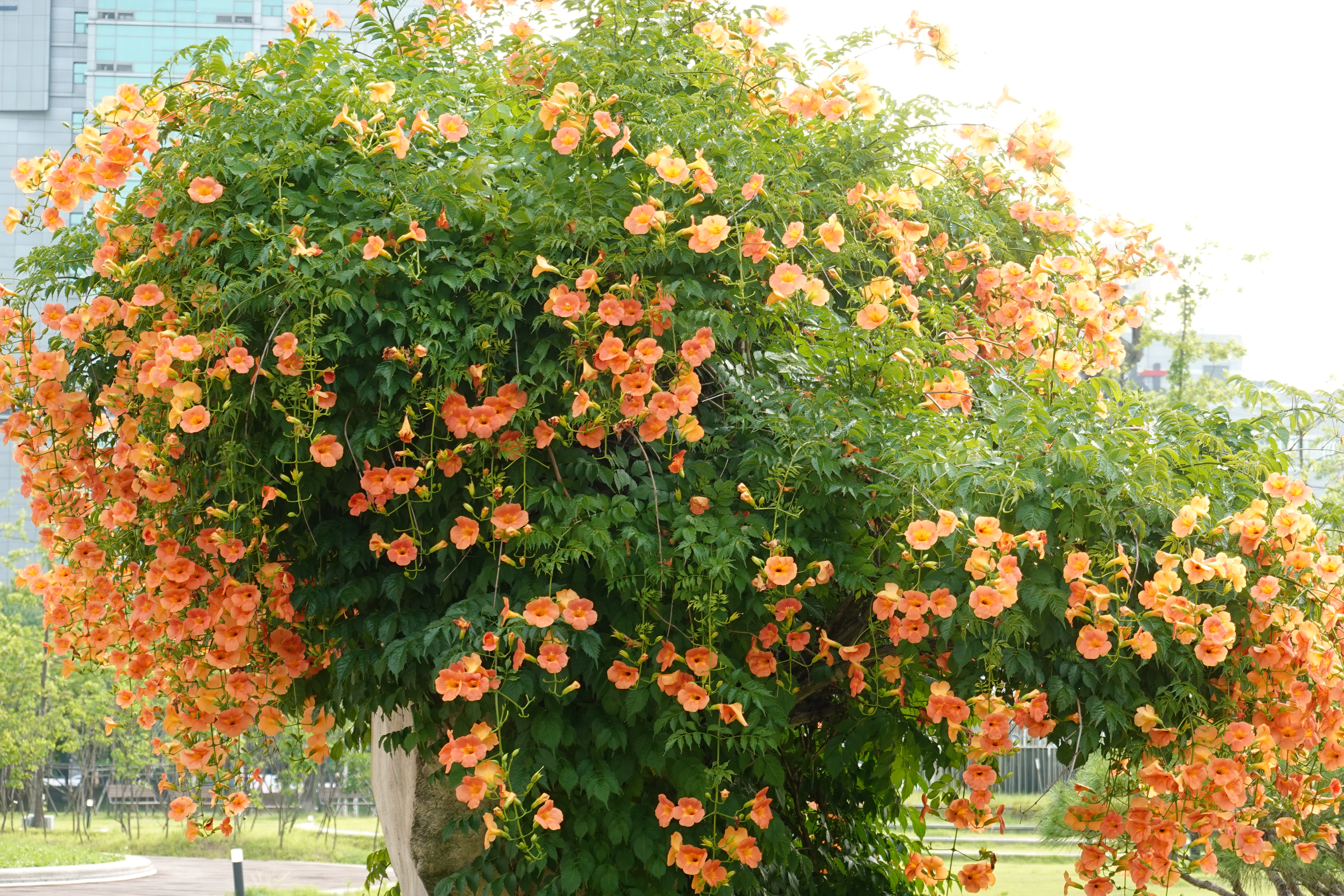 여름이 깊어 갈수록 주변은 온통 초록의 바다가 된다. 그러나 늘 푸름도 너무 오래가면 금세 신물이 나서 화사한 봄꽃의 색깔이 그리워진다. 이럴 즈음, 꽃이 귀한 여름날의 아쉬움을 달래주는 능소화가 우리의 눈길을 끈다. 담쟁이덩굴처럼 빨판이 나와 무엇이든 가리지 않고 달라붙어 아름다운 꽃 세상을 연출한다. 가장자리가 톱날처럼 생긴 여러 개의 잎이 한 잎자루에 달려 있는 겹잎이고, 회갈색의 줄기가 길게는 10여 미터 이상씩 꿈틀꿈틀 담장을 누비고 다니는 사이사이에 아기 나팔모양의 꽃이 얼굴을 내민다.