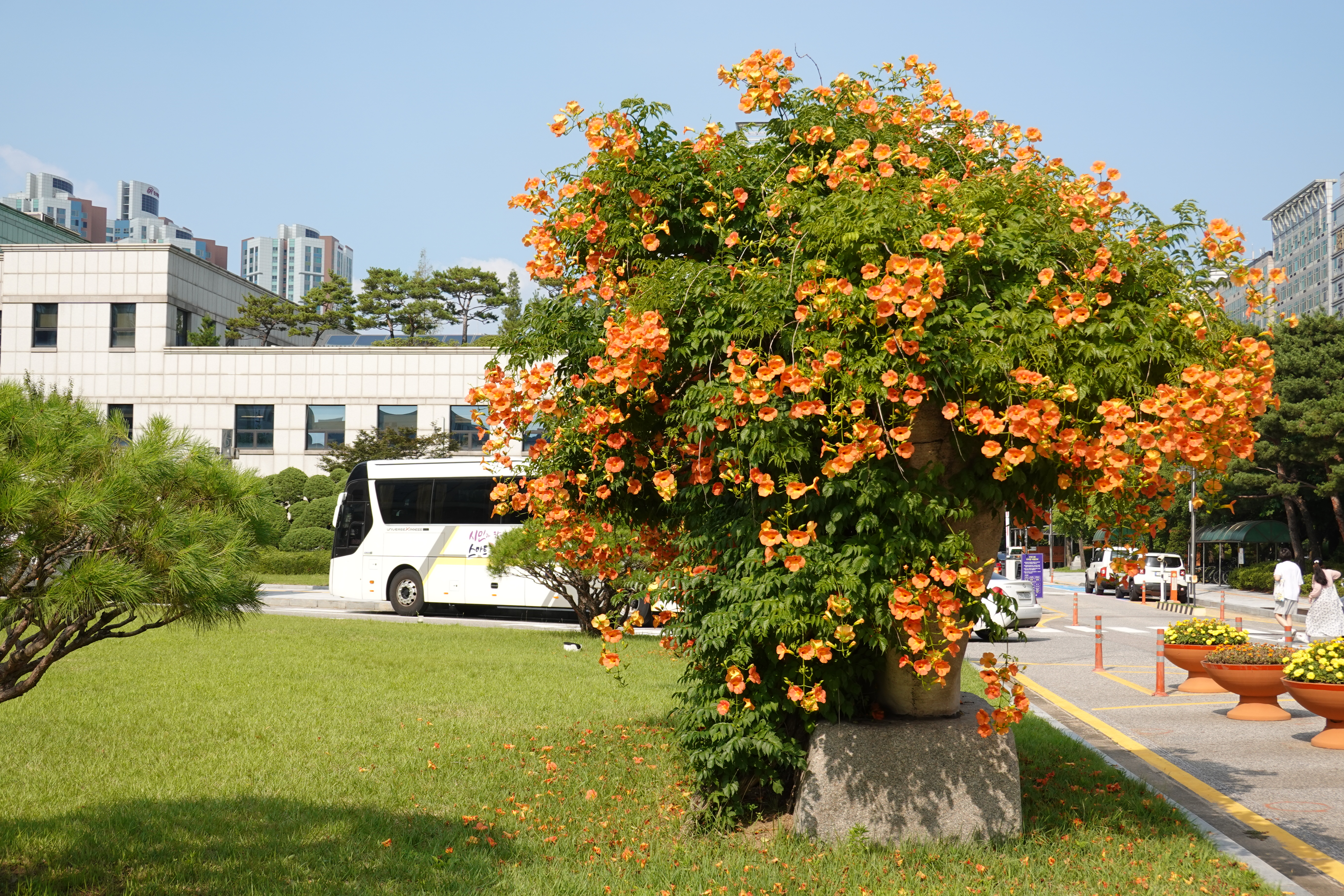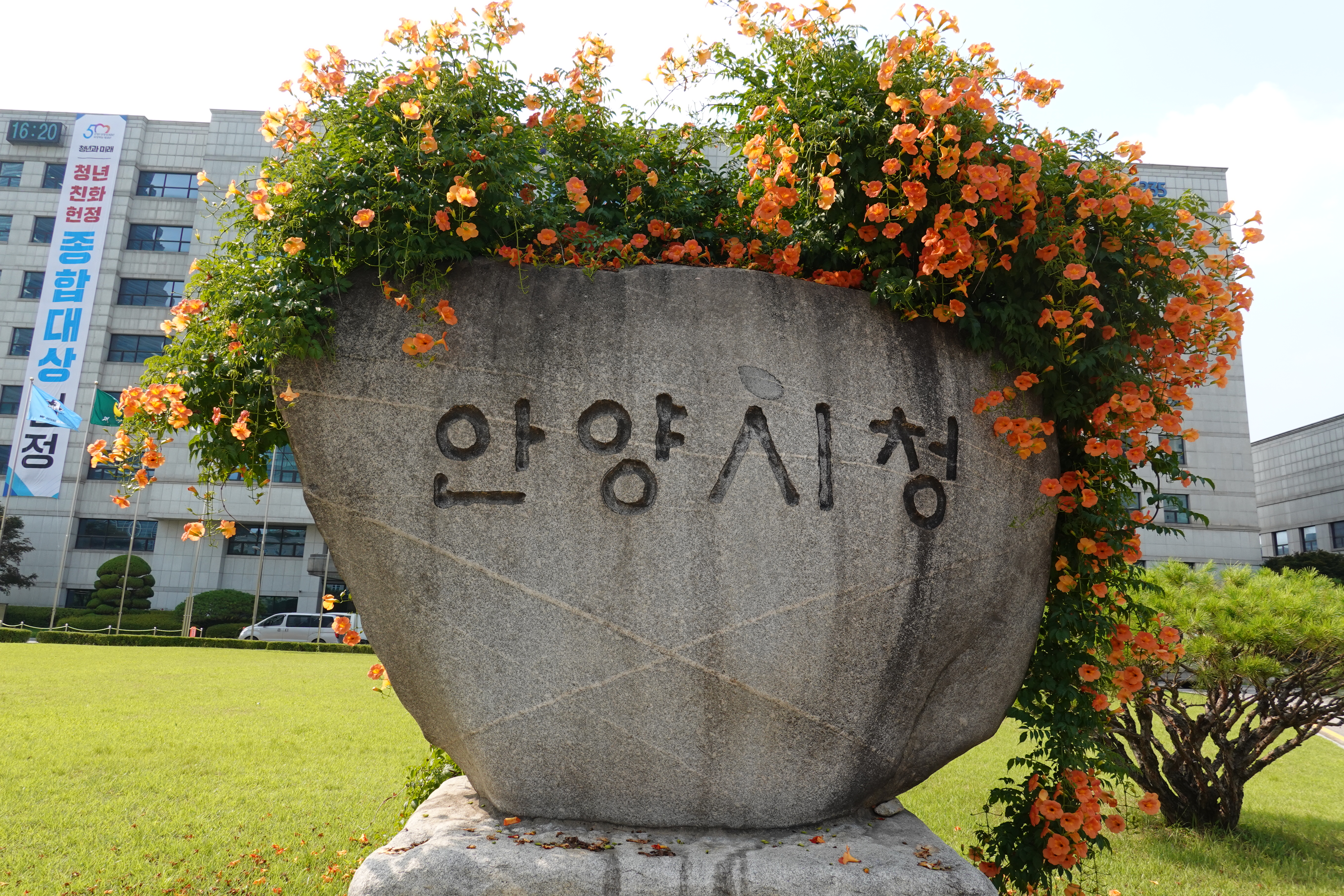 2023.07.03/ #도시기록 #안양시청 #눙소화 #여름꽃/ 매년 능소화가 멋지게 피는 곳 안양시청앞 마당의 시청.시의회 표지석