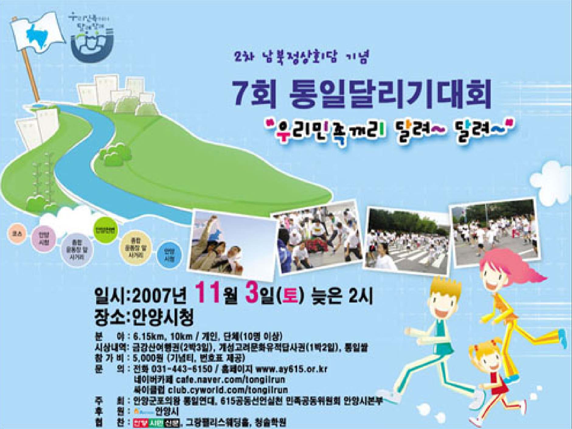 ▲ 2007, 제7회 통일달리기대회 포스터 ⓒ 안양군포의왕통일연대 6.15남북공동선언 실현과 한반도 평화를 위한 안양군포의왕통일연대, 6.16공동선언실천 민족공동위원회 안양시본부가 주최하고