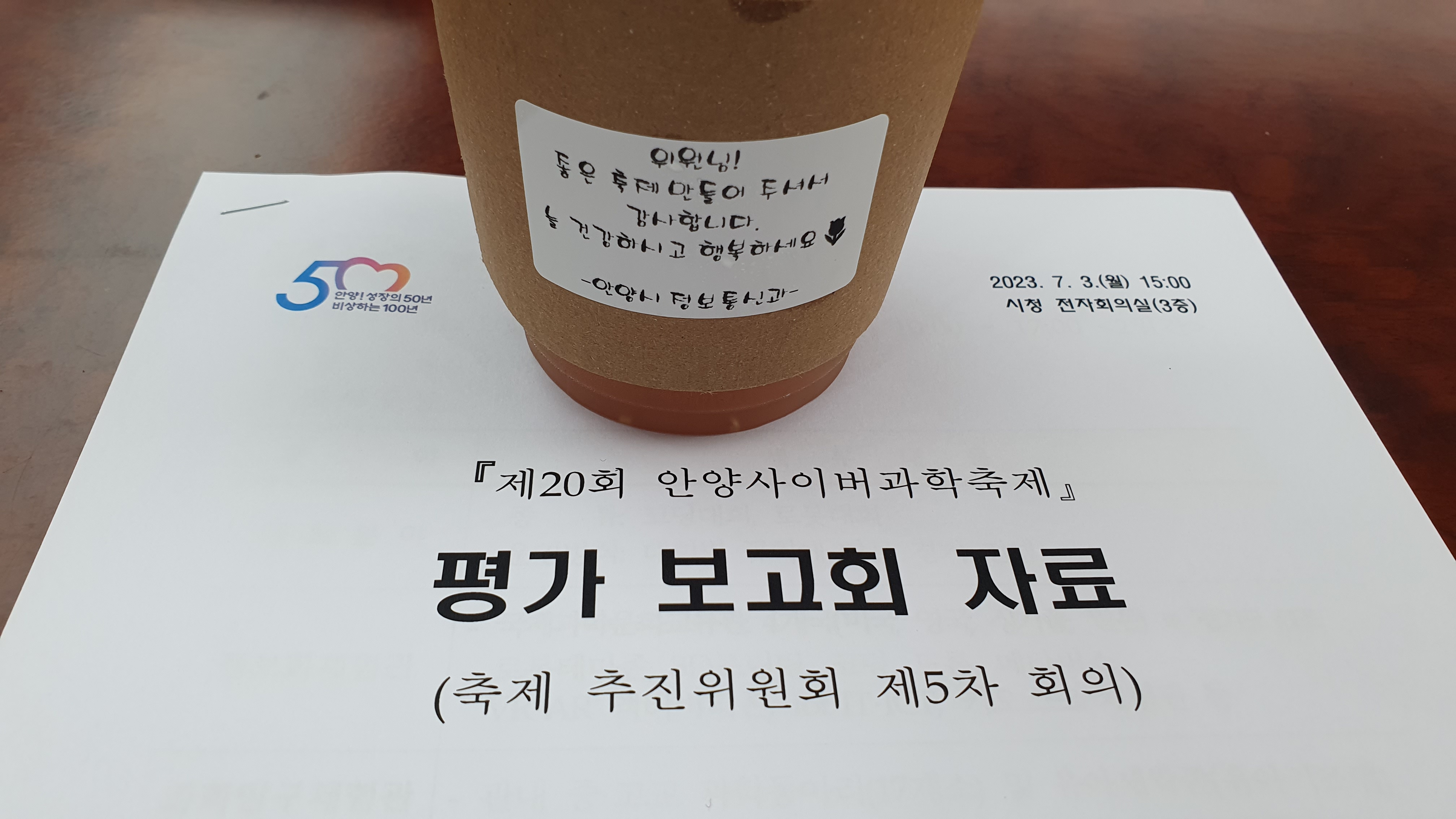 2023.07.04/ #회의 #안양사이버과학축제 #안양시청/ 큰행사 하나를 마무리했다. 제20회 안양사이버과학축제 평가 보고회. 금년엔 영궁에서 건너온 로봇이 인기몰이를 해서 호평이었는데 벌써 다들 내년을 걱정한다. 눈높이가 높아져서....회의전 테이블 위 음료 컵에 부착한 메모지 글을 보고 뭉클. 안양시 정보통신과 실무자의 마음이 고스란히 담겨있는듯 싶어 따뜻하다. "감사합니다."