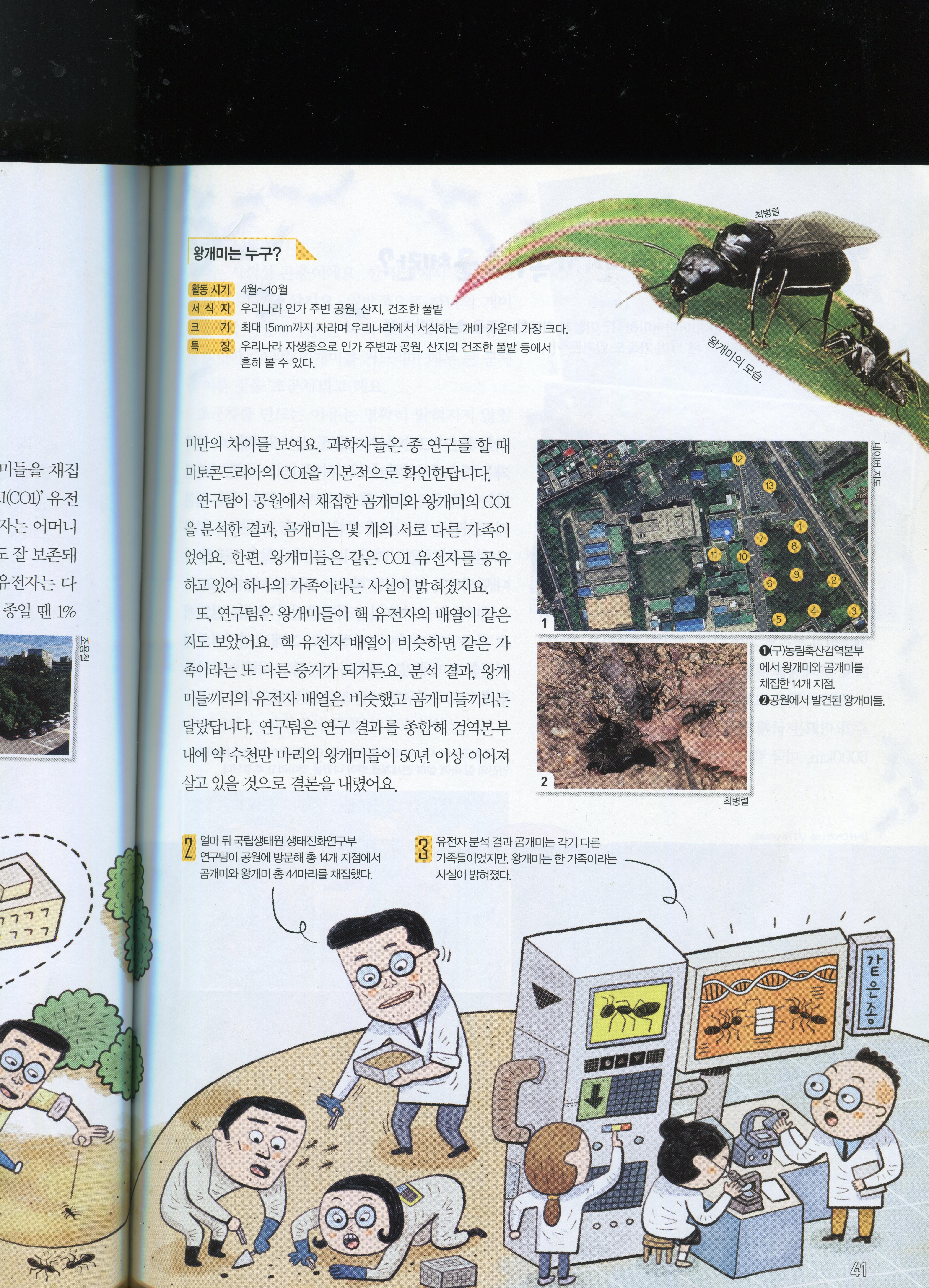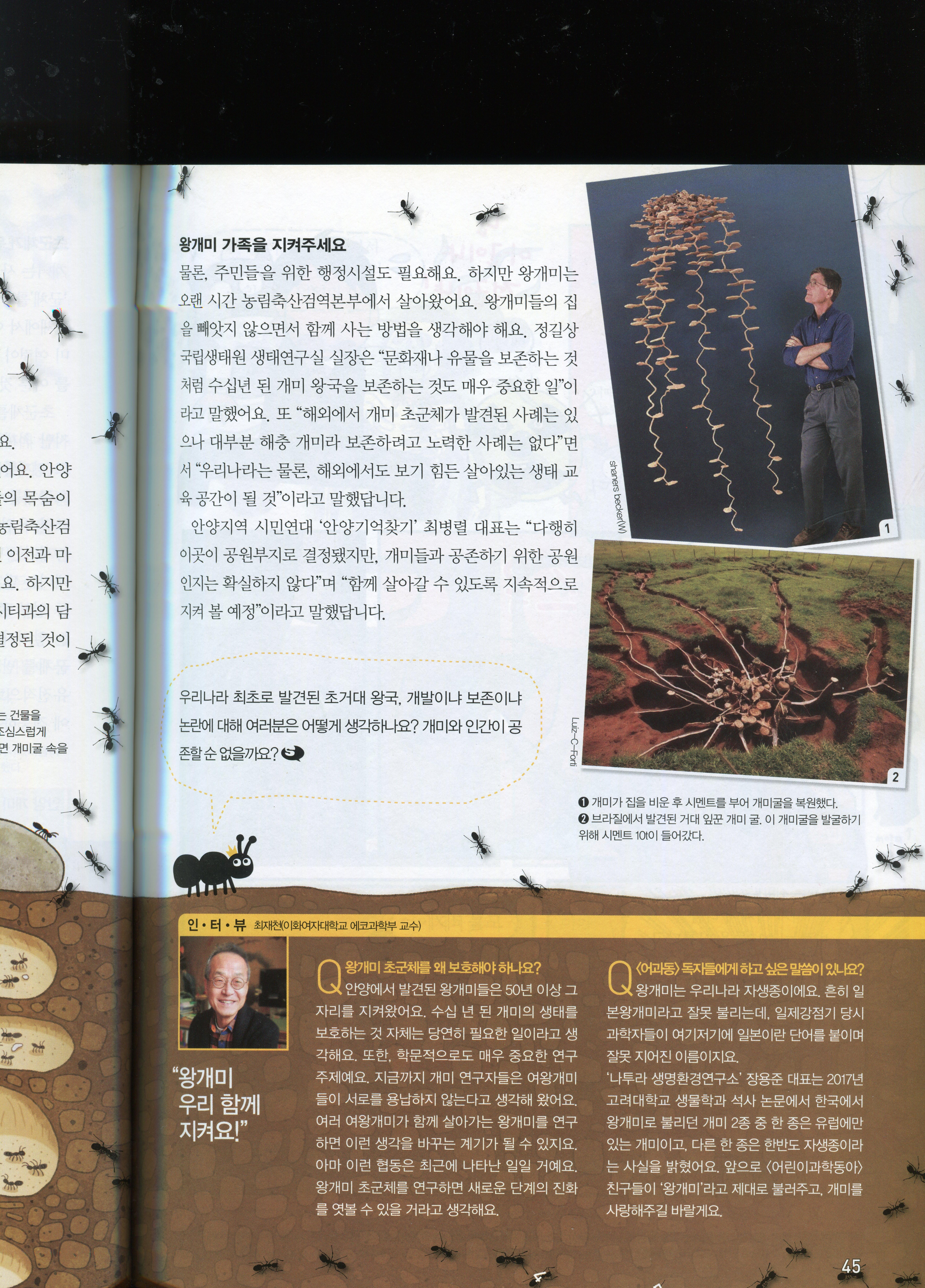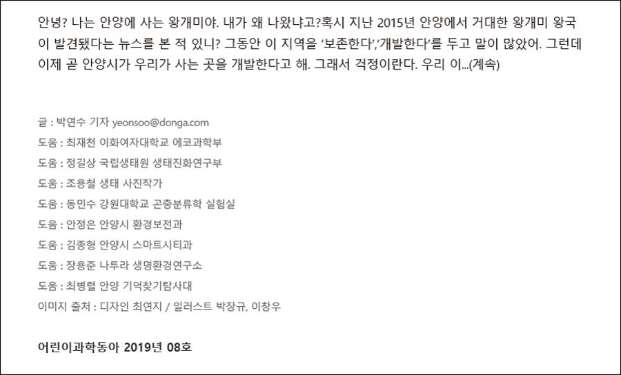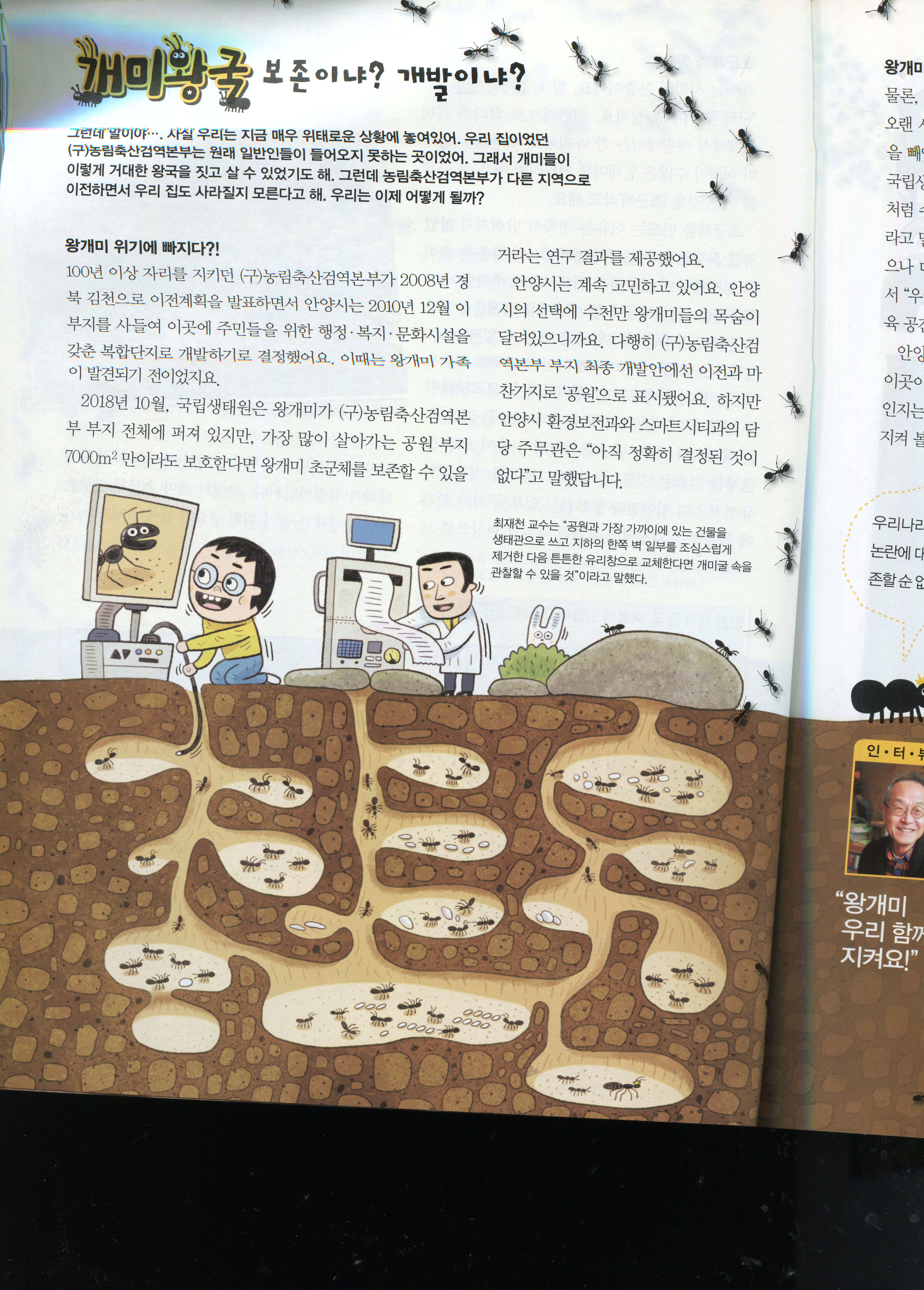 지난 2019년 4월 15일자 어린이과학동아(08호)에 [기획]국내 최대 개미왕국의 운명은? 제목으로 게제됐던 안양시 안양6동 옛 국립수의과학검억원 땅밑에 사는 왕개미 제국의 이야기입니다.