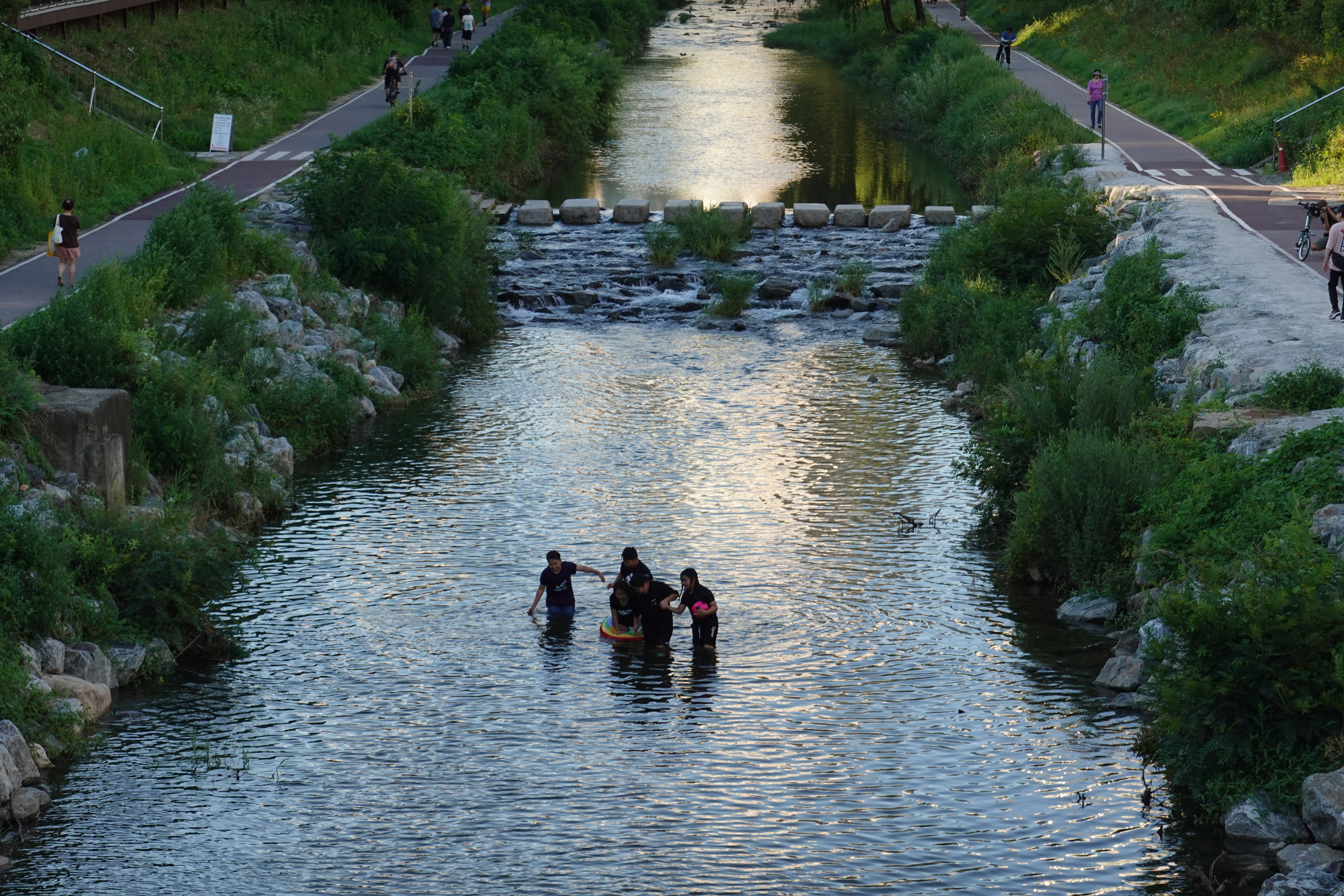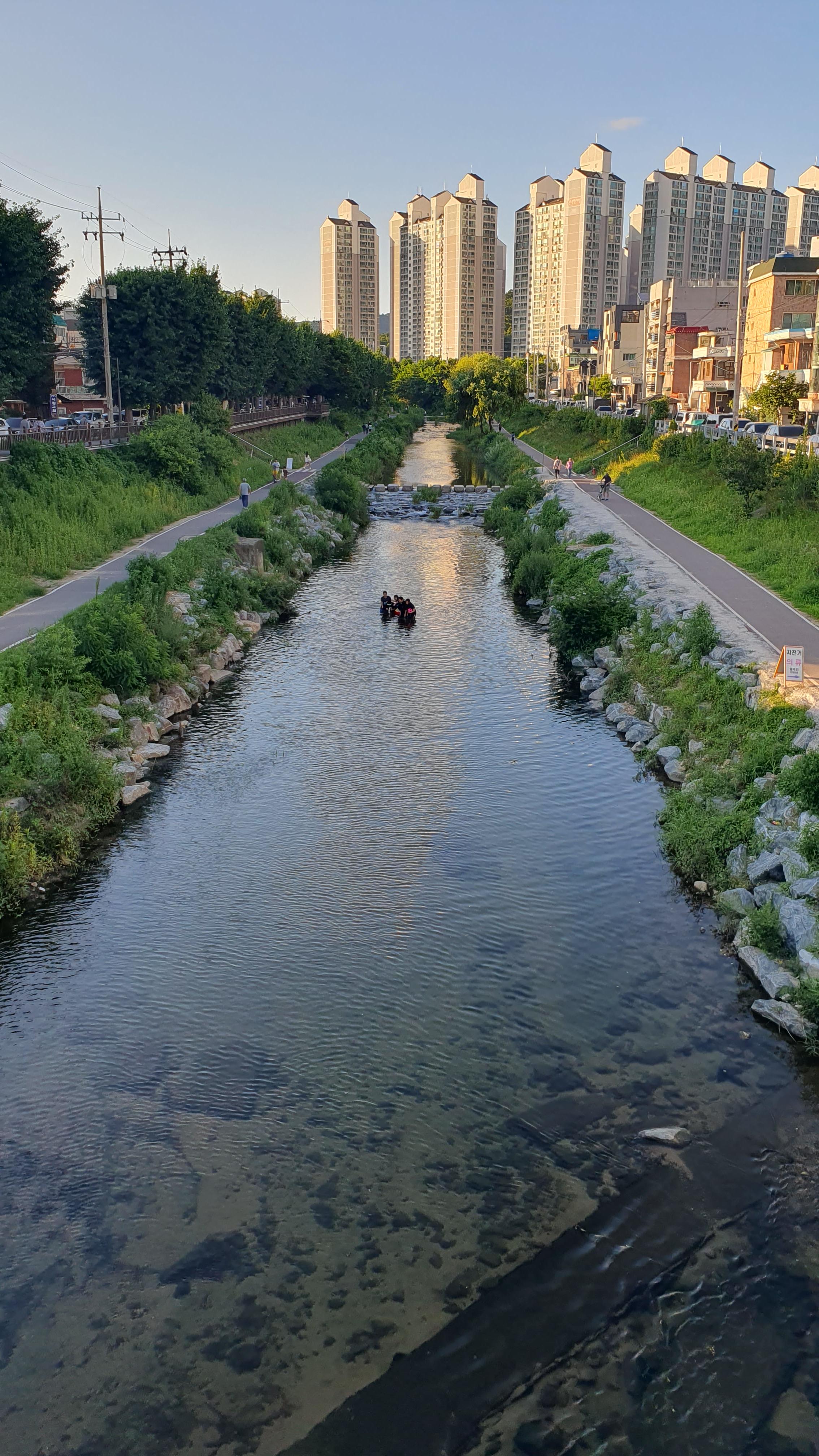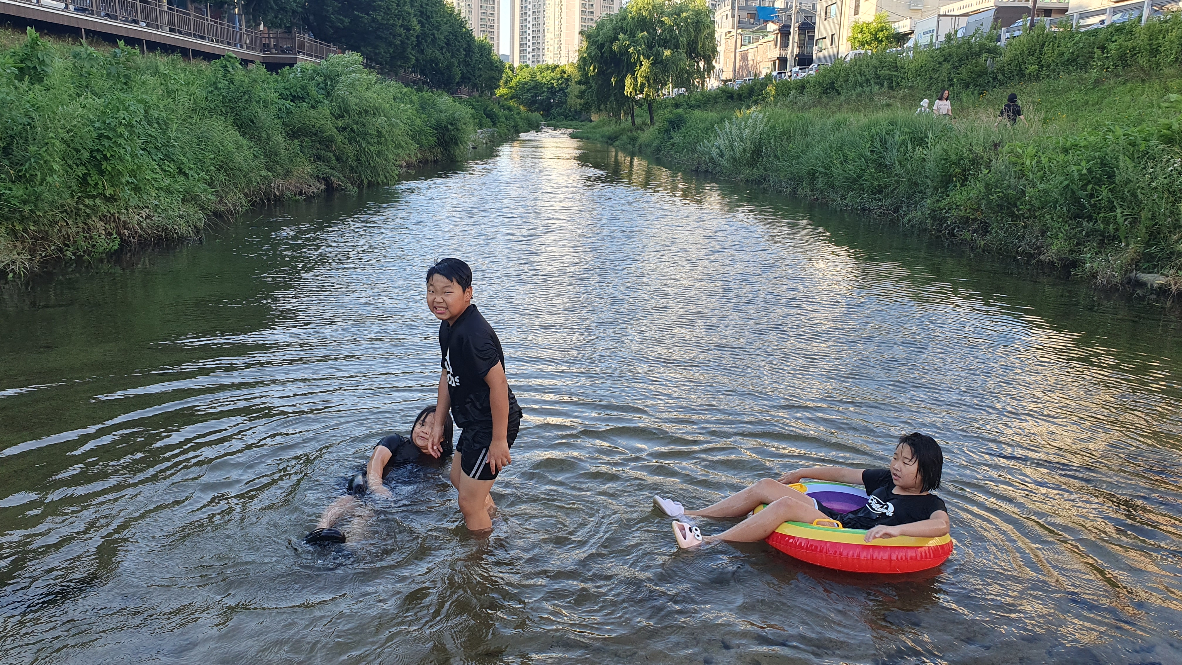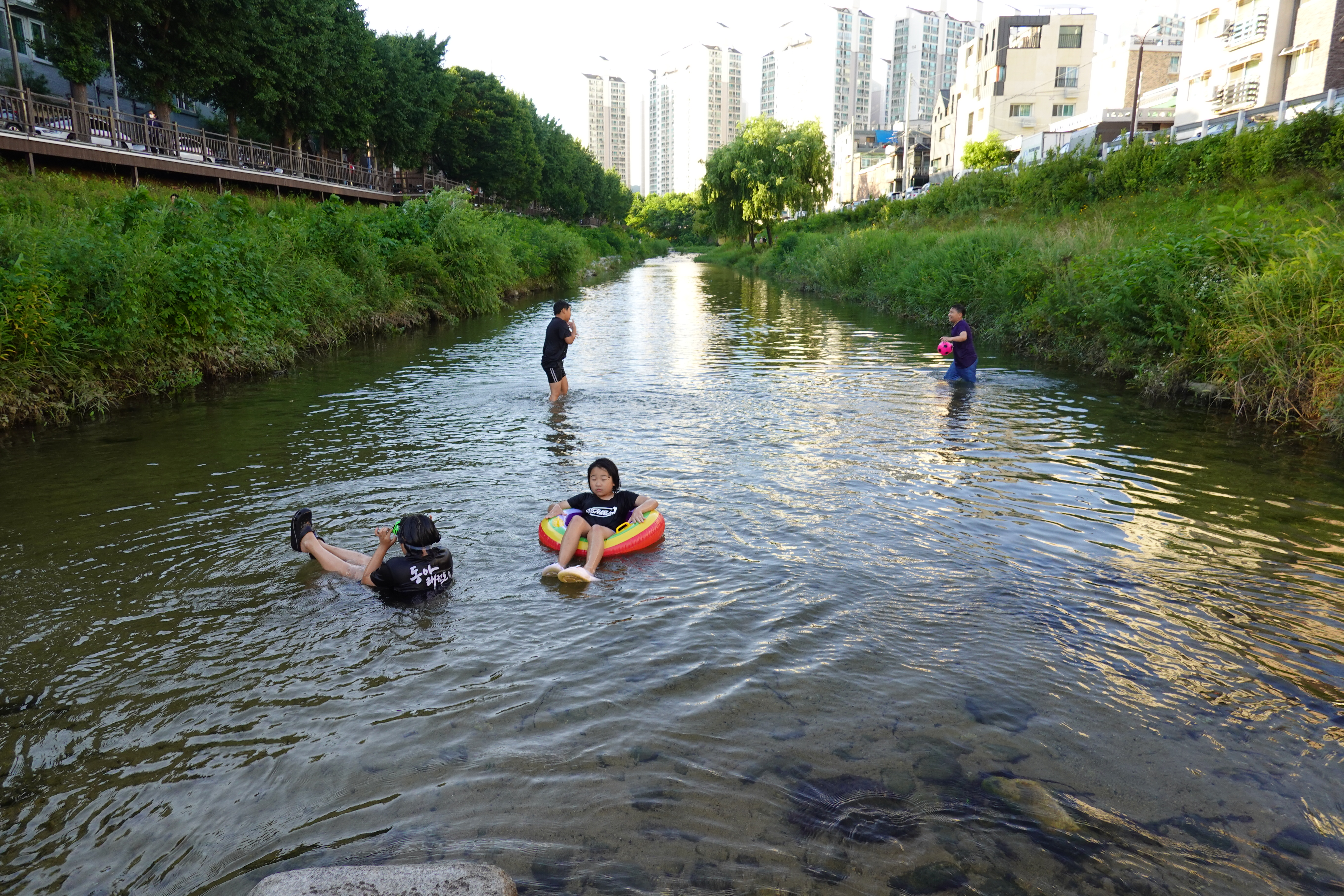 2023.07.07/ #도시기록 #삼성천 #물놀이 #석수2동/ 시내버스를 타고 안양천과 섬성천 합류부인 삼성교를 지나다 차창밖으로 하천에서 신나게 물놀이하는 사람들이 보여 차에서 내렸다, 중학교 1학년쯤으로 보이는 학생들이 공과 튜브에 물안경까지 물놀이용품까지 준비해와 신나게 물놀이를 즐긴다. 혹시나하고 하천바닥을 보니 모래알이 보일 정도로 깨끗했다. 산책길을 오가는 시민들은 도심속 개천에서의 물놀이가 신기한듯 핸드폰을 꺼내 사진 찍는 분들도 있다.