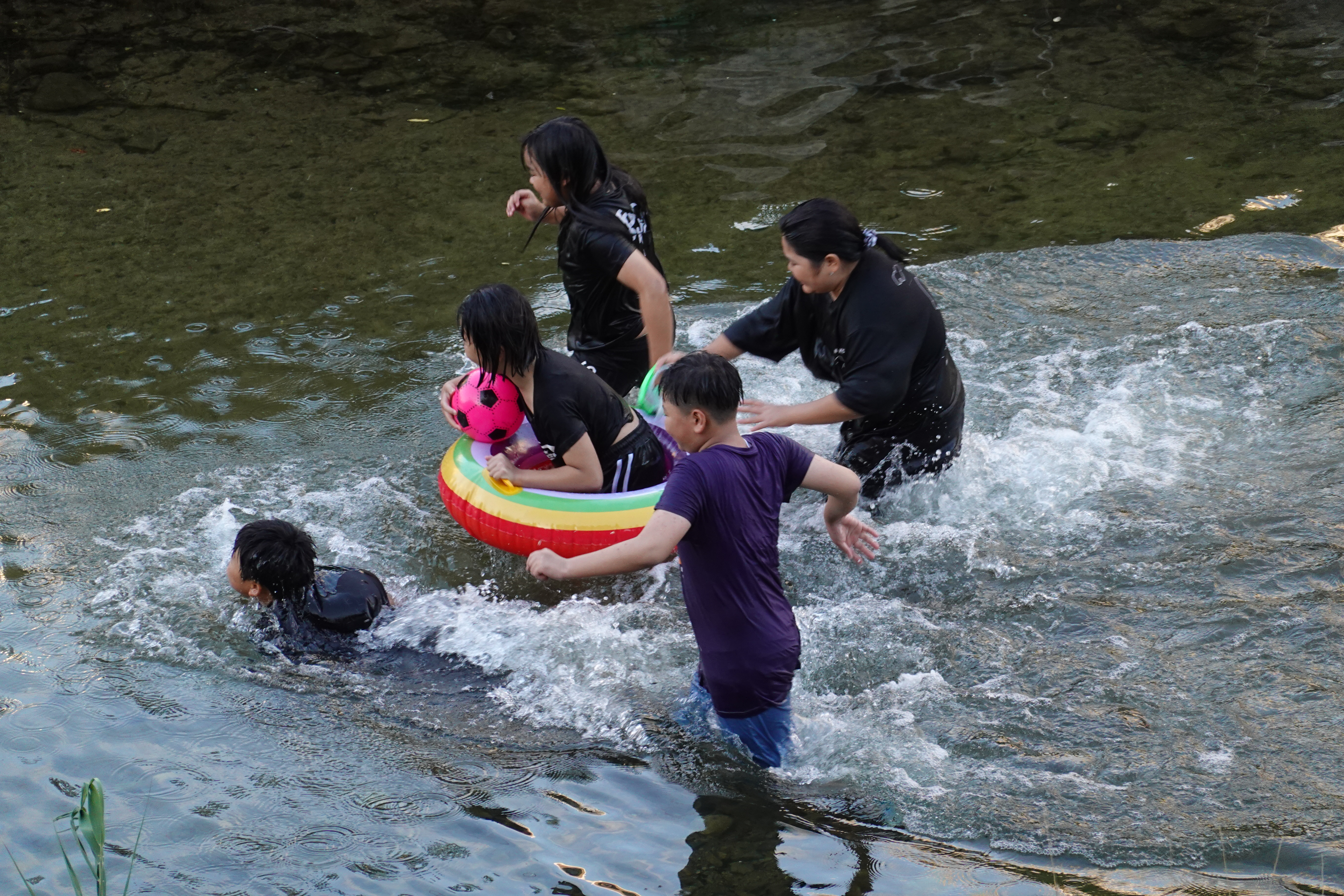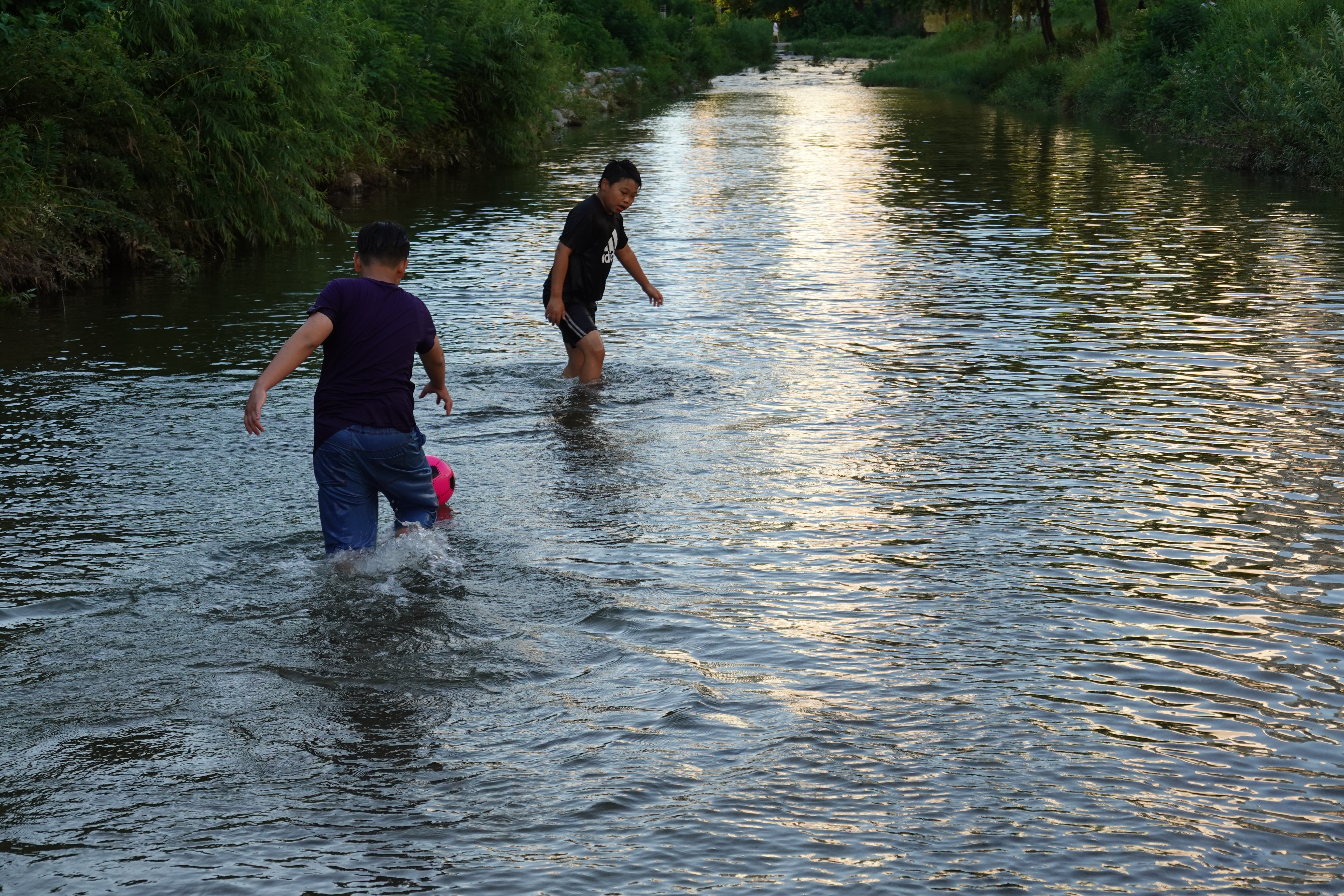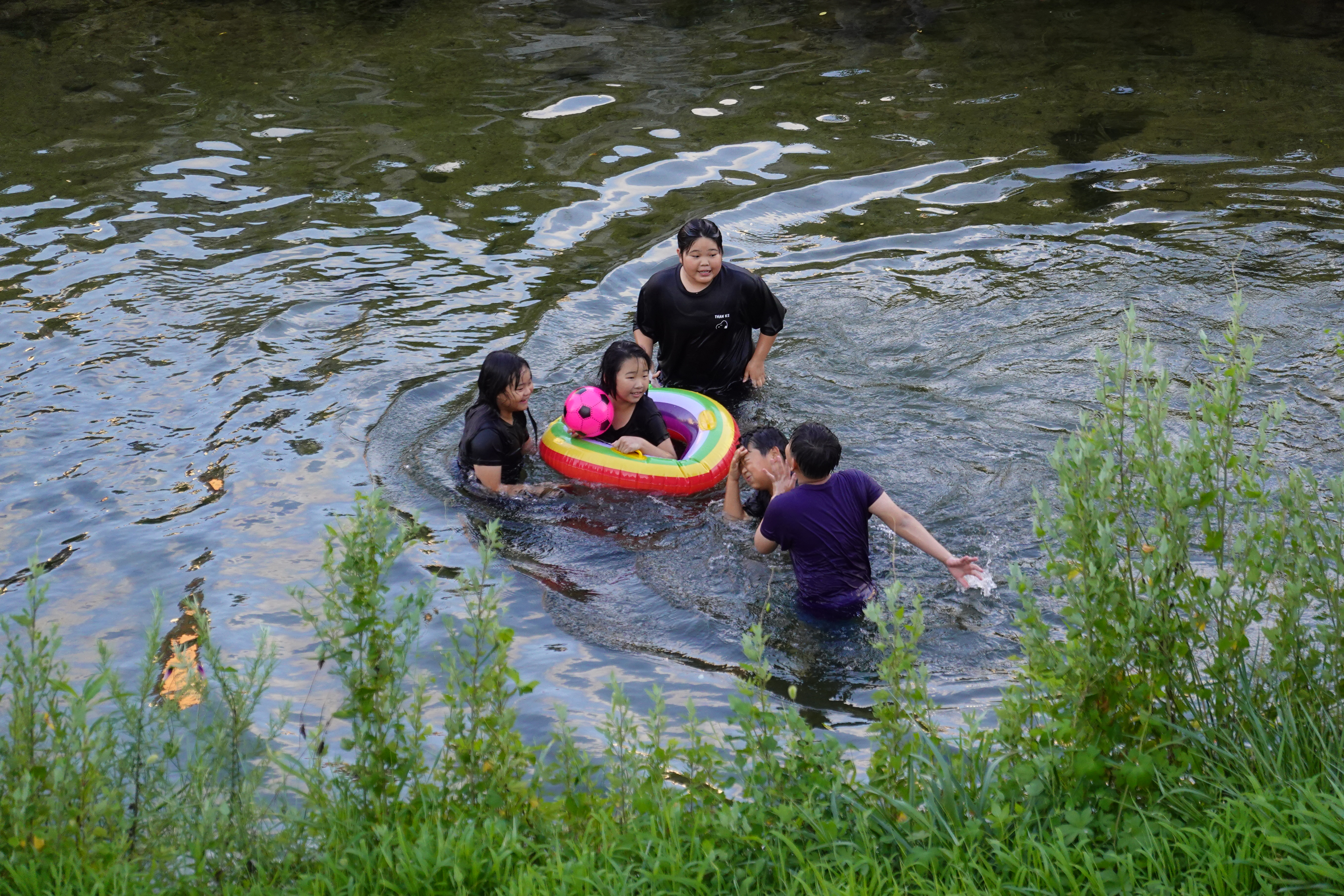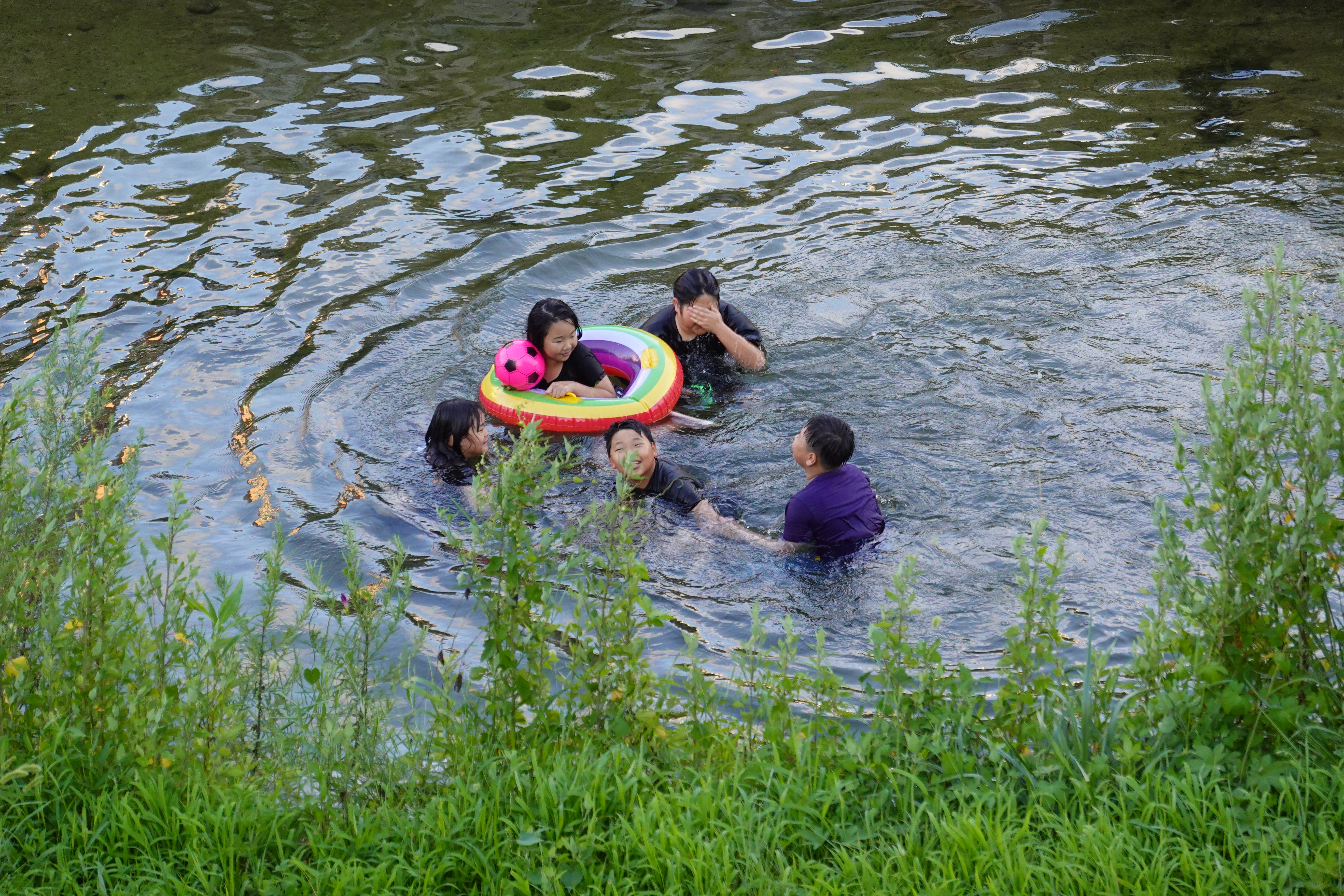 2023.07.07/ #도시기록 #삼성천 #물놀이 #석수2동/ 시내버스를 타고 안양천과 섬성천 합류부인 삼성교를 지나다 차창밖으로 하천에서 신나게 물놀이하는 사람들이 보여 차에서 내렸다, 중학교 1학년쯤으로 보이는 학생들이 공과 튜브에 물안경까지 물놀이용품까지 준비해와 신나게 물놀이를 즐긴다. 혹시나하고 하천바닥을 보니 모래알이 보일 정도로 깨끗했다. 산책길을 오가는 시민들은 도심속 개천에서의 물놀이가 신기한듯 핸드폰을 꺼내 사진 찍는 분들도 있다.