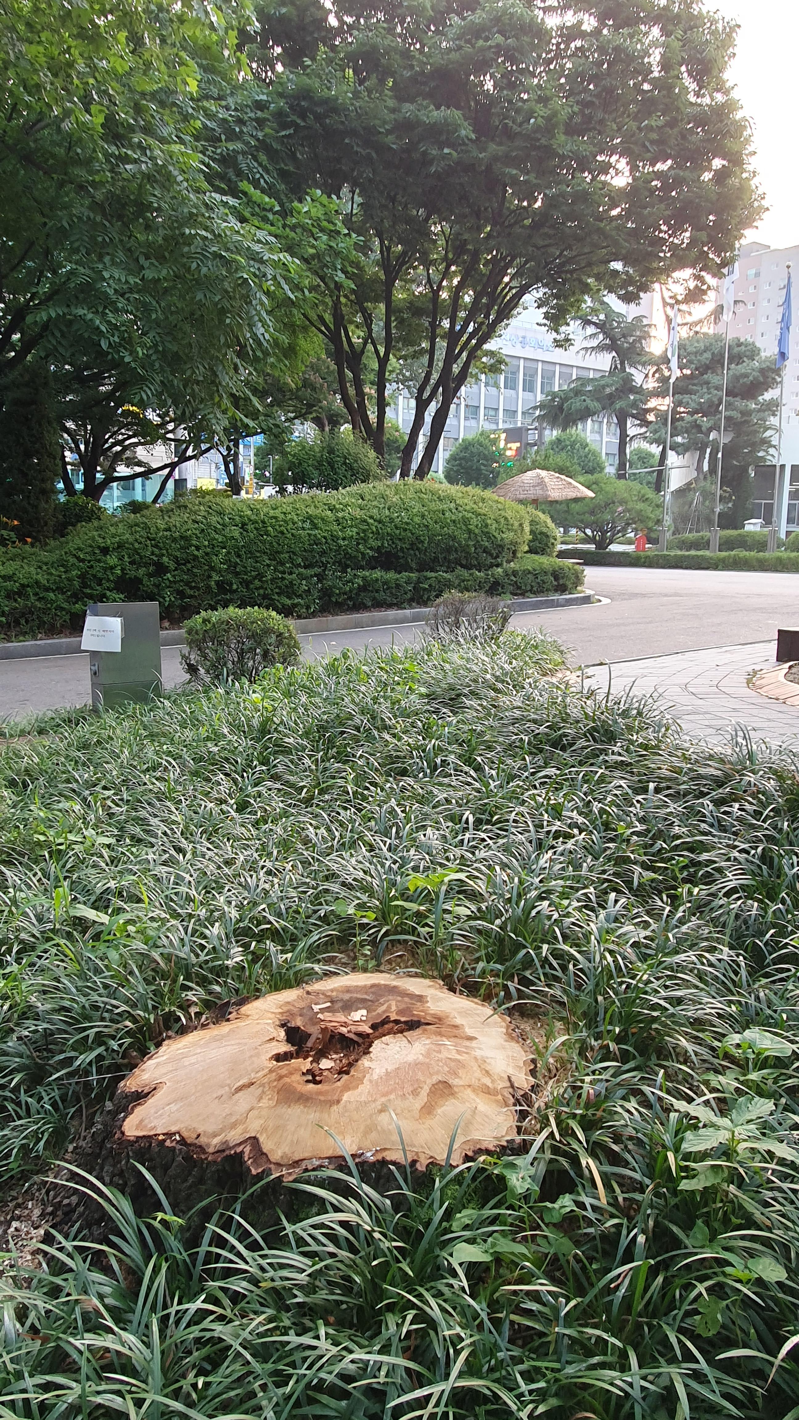 2023.07.01/ #도시기록 #에공 #나무 #절단/ 만안구청을 거닐다 나무 밑둥이 짤려질 나무를 발견하다, 절단부위를 보니 어디가 아팠던듯 싶다. 짤려지고 사라지는 나무를 보면 마음이 아프다.