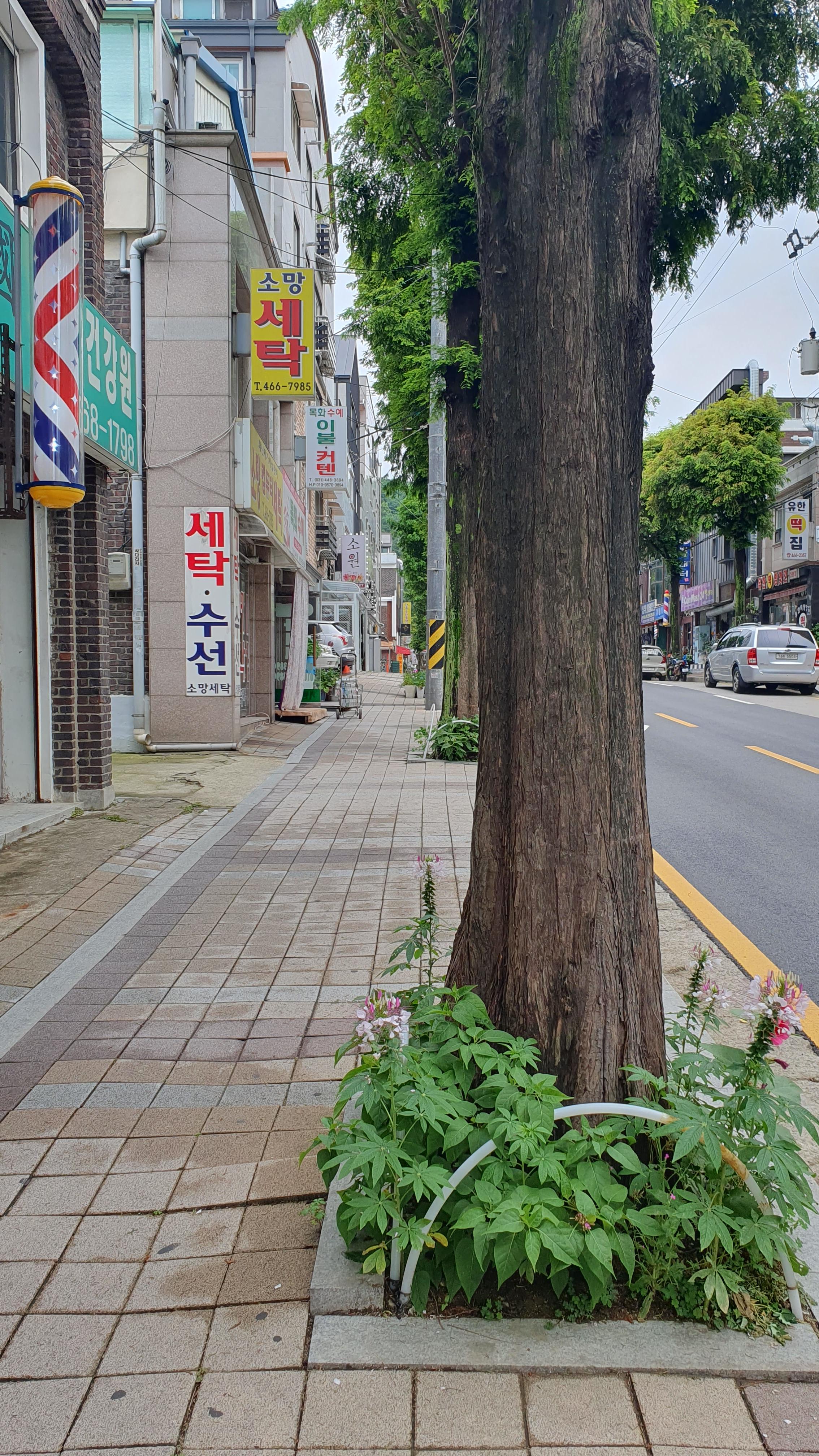 2023.07.09/ #도시기록 #미니화단 #안양8동/ 메타쉐콰이어 가로수 아래 미니 화단, 가로수앞 주변 사인과 주민들이 둘보고 가꾼다.
