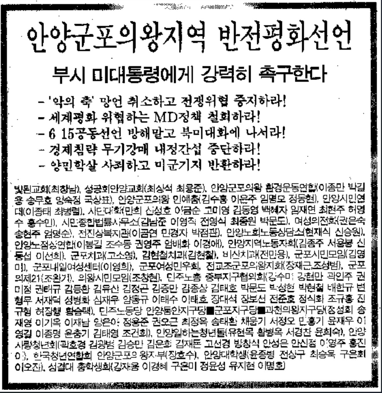 2023.07.15/ #아카이브 #옛자료 #안양군포의왕지역 #평화 #since2003/ 복구한 외장하드에서 발견한 2003년 자료. 안양군포의왕시민단체들이 돈을 각출해 낸 반전평화선언 신문 광고. 한겨레신문이었나 싶다.